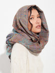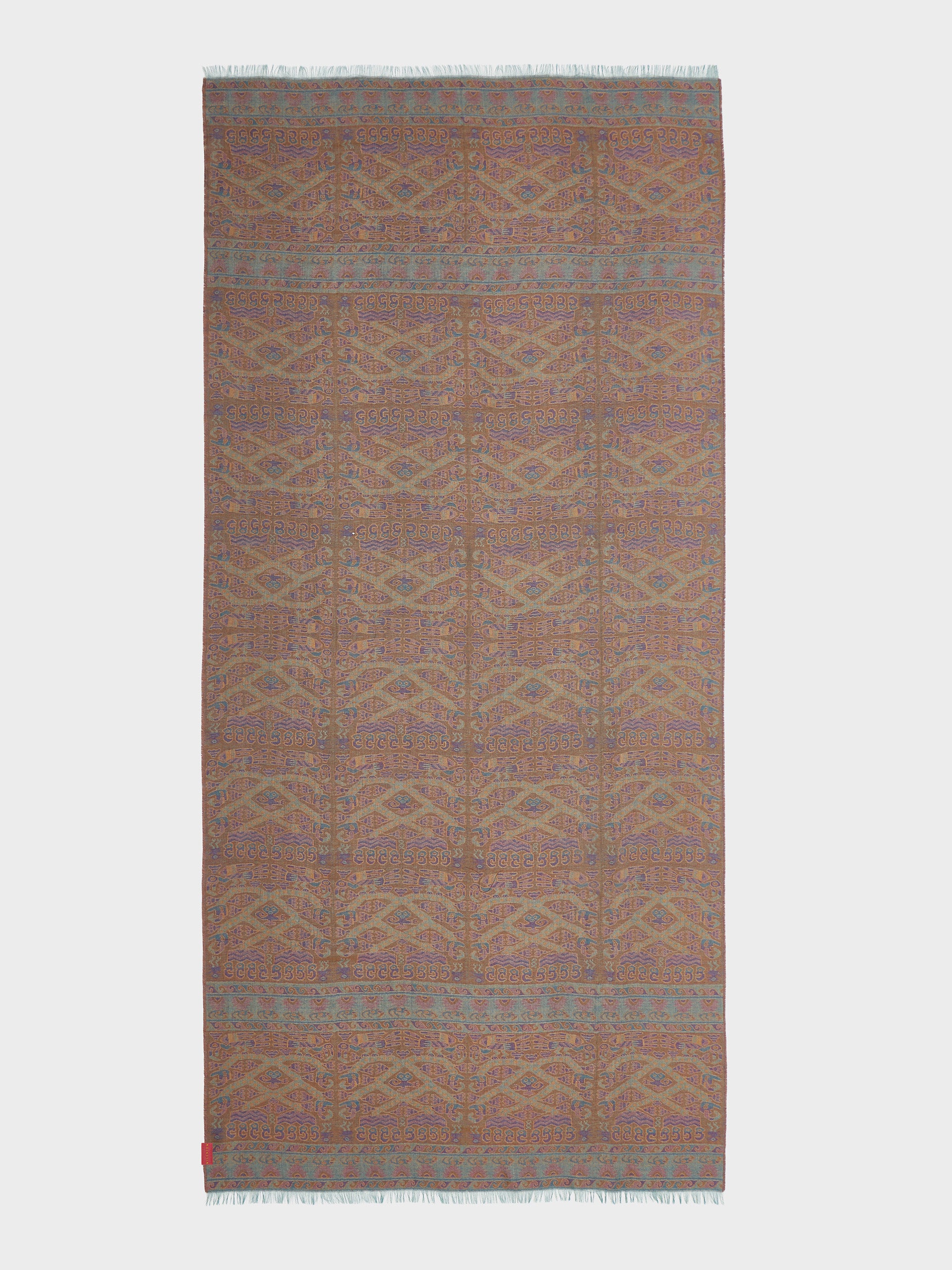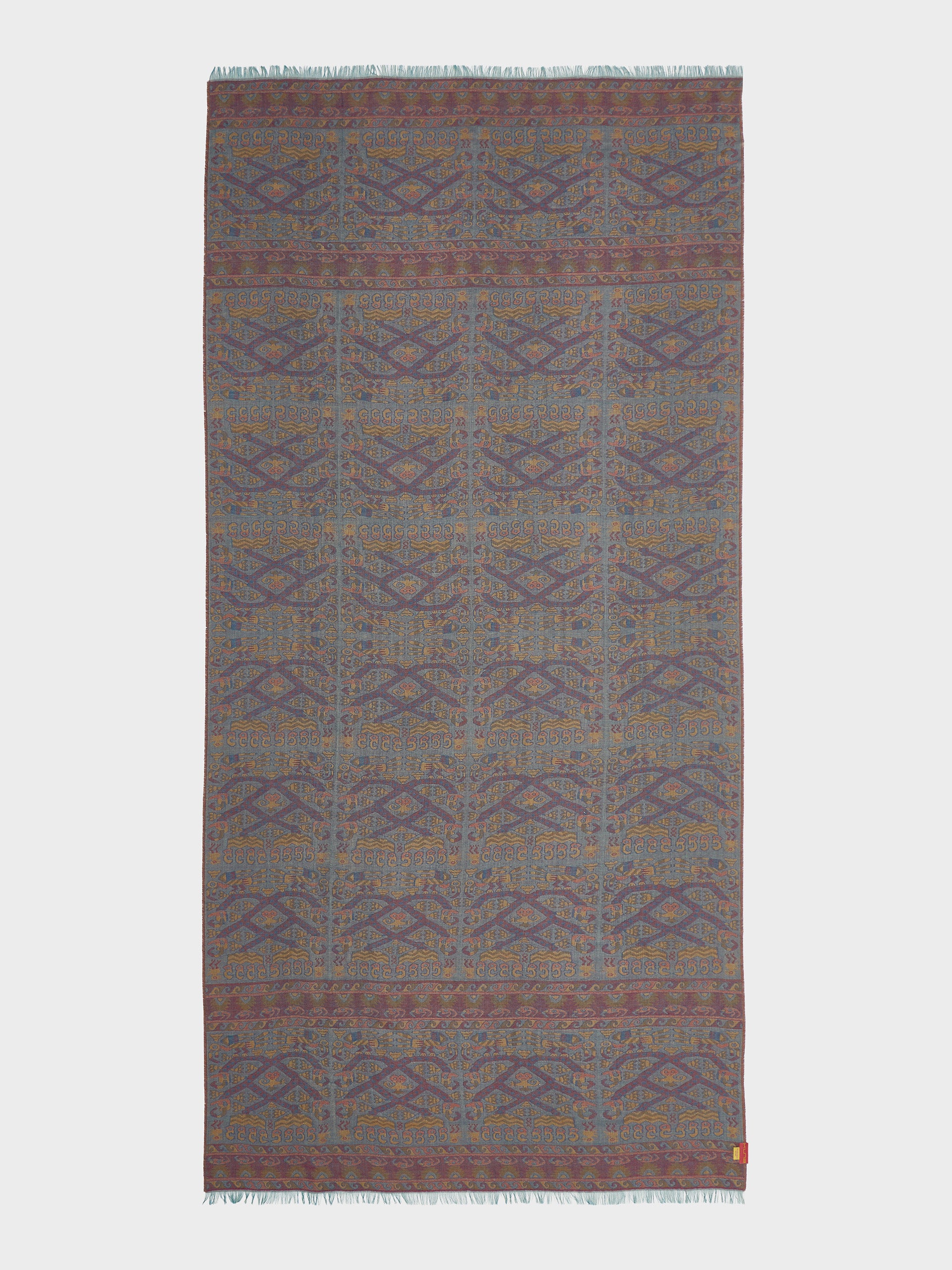 Estola Lambayeque 8 en tonalidad azul, elaborada en 50% Royal alpaca y 50% seda, con técnica Jacquard en doble tela e inserción de trama oculta. Con una medida de 200/196 x 93 cm, es una prenda reversible, inspirada en la Cultura Lambayeque, que mantiene viva la tradición ancestral en un diseño representativo de la identidad cultural. | Material predominante: Royal Alpaca y Seda