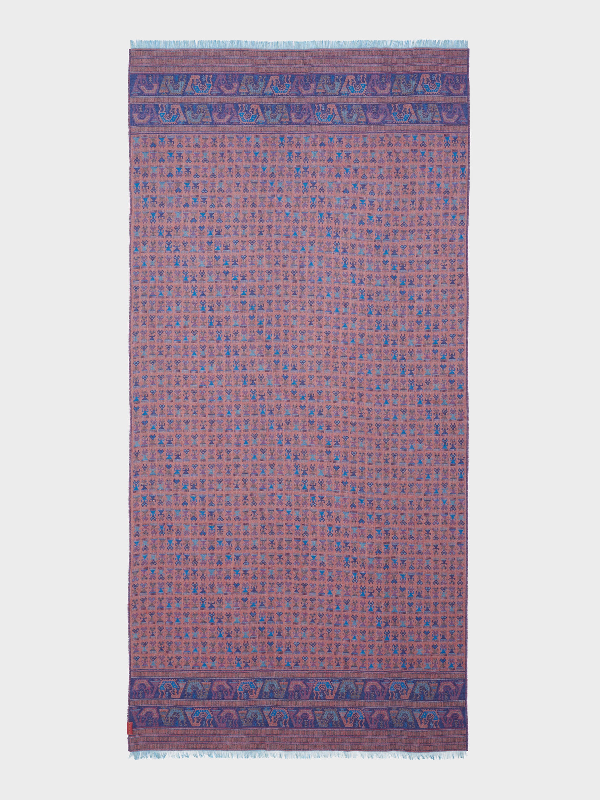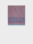 Estola Lambayeque 9 en tonalidad azul, elaborada en 50% Royal alpaca y 50% seda, con técnica Jacquard en doble tela e inserción de trama oculta. Con una medida de 200/196 x 93 cm, es una prenda reversible, inspirada en la Cultura Lambayeque, que reinterpreta la tradición ancestral a través de un diseño con esencia cultural. | Material predominante: Royal Alpaca y Seda