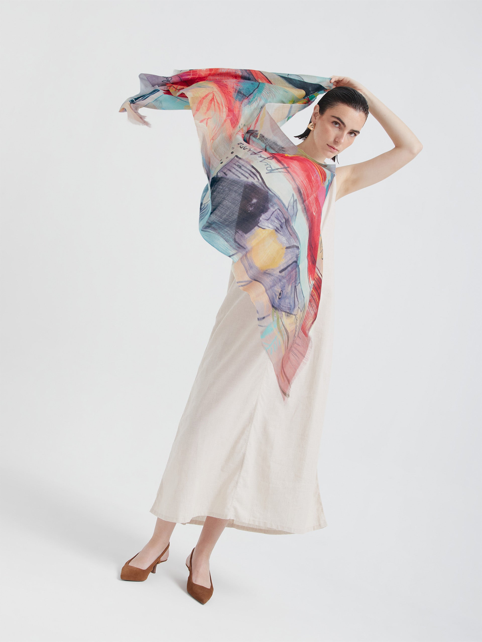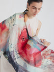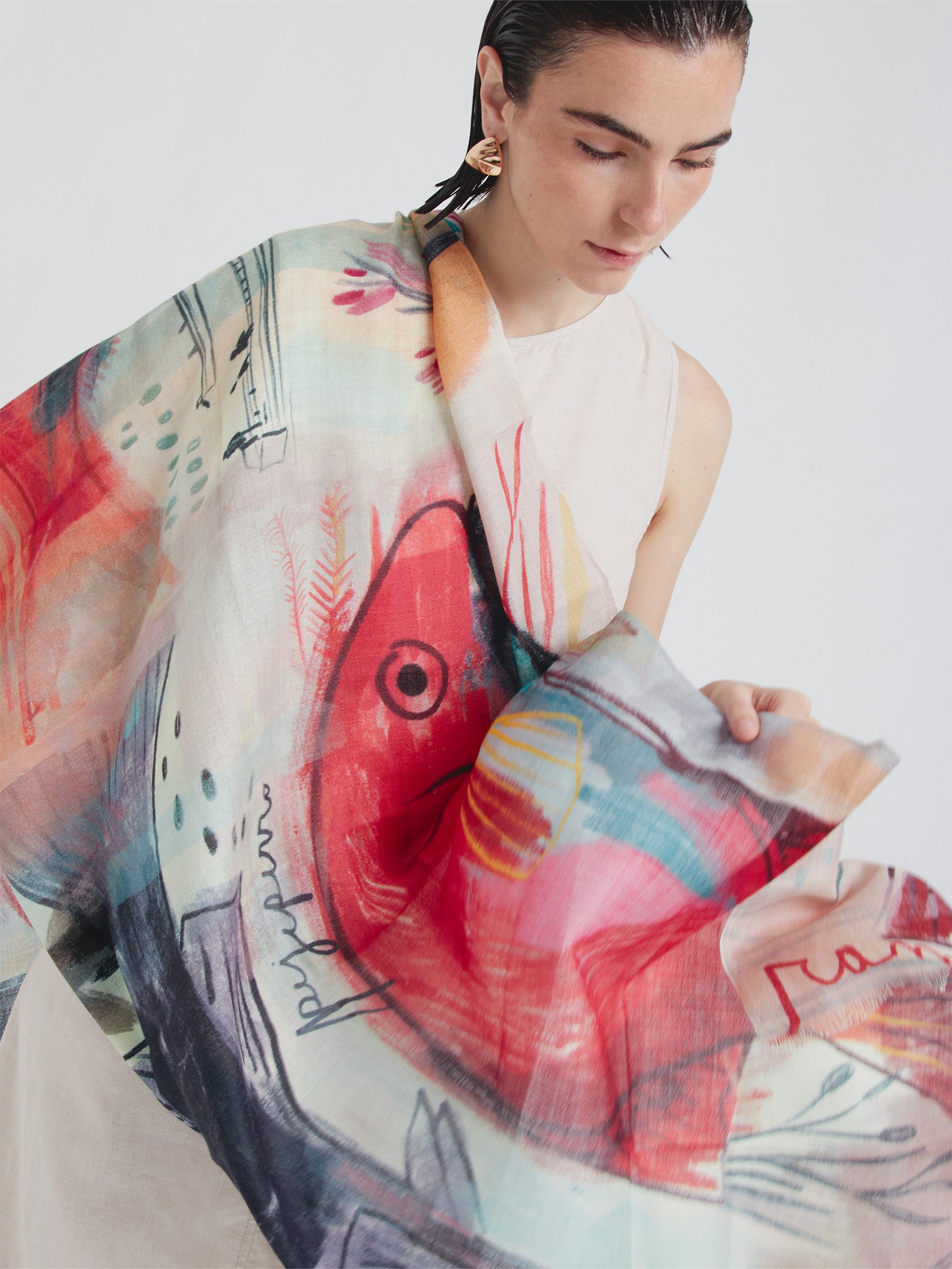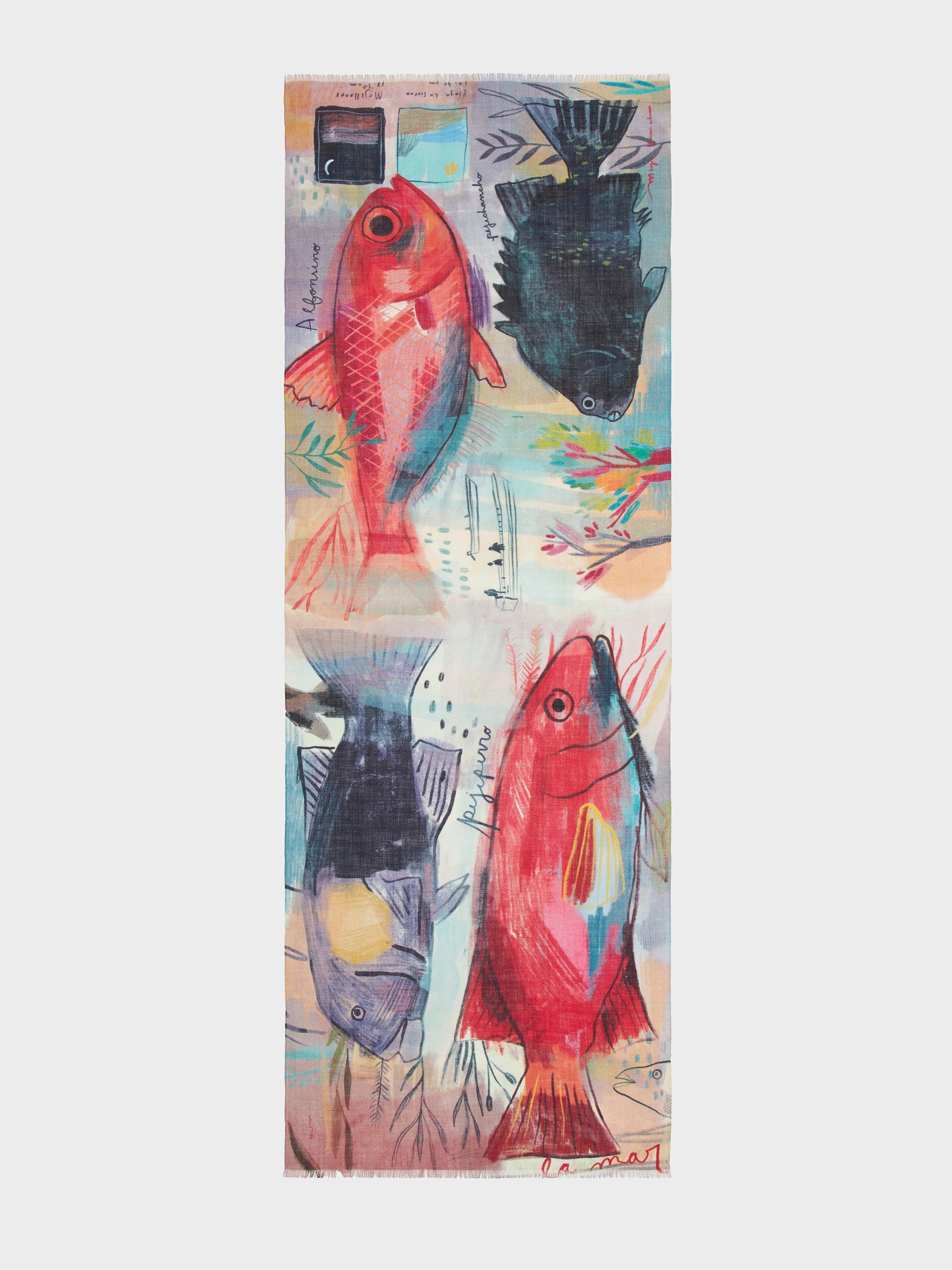 Colores vivos recorren el agua, cada pez con su brillo y textura recuerdan la abundancia y el misterio escondido en el mar. Esta delicada estola ha sido inspiración de nuestra artista Maya Hanish, elaborada en baby alpaca y seda. | Material predominante: Baby Alpaca