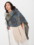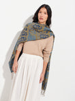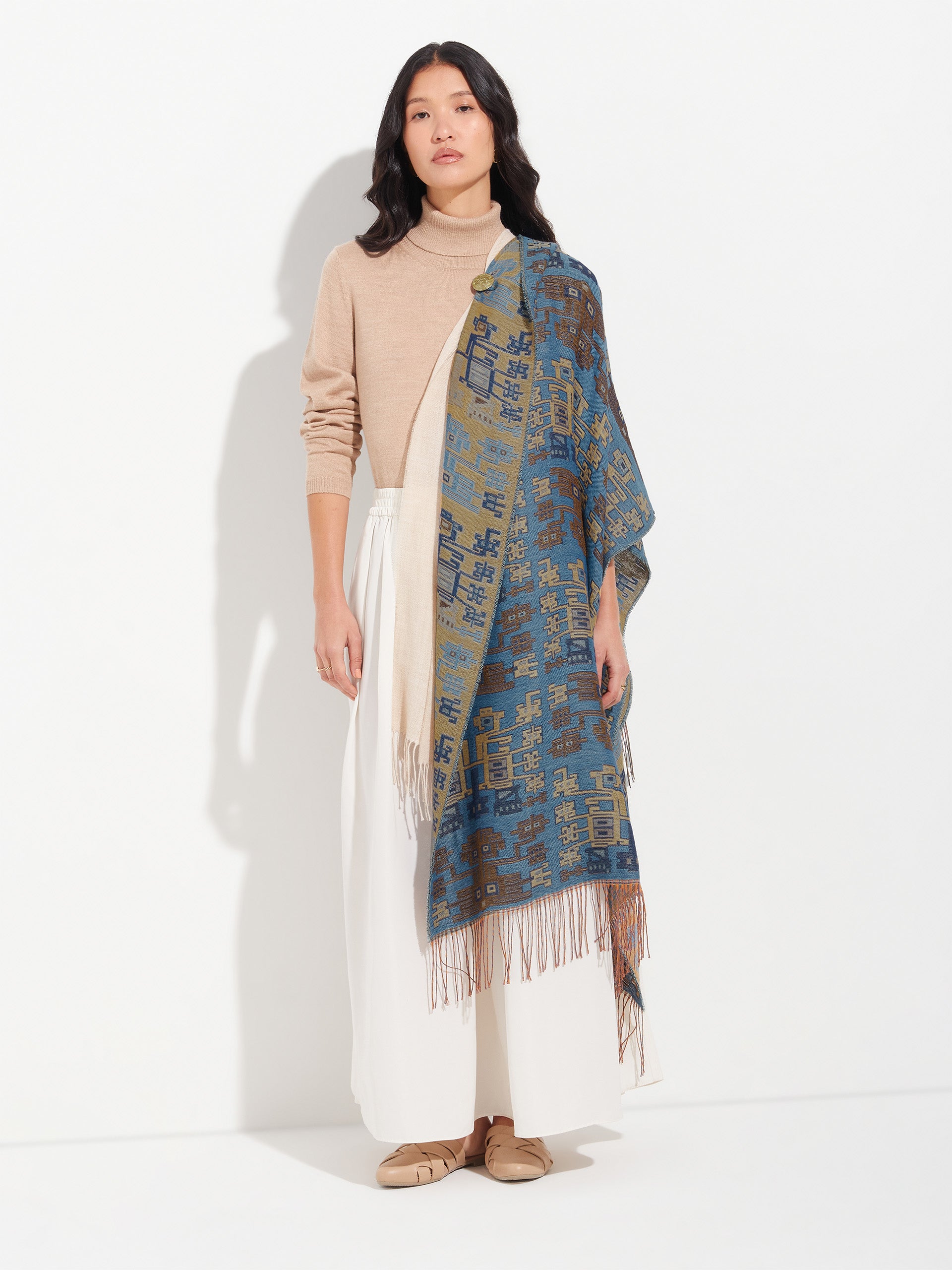 Estola Nazca 52 en tonalidad azul, elaborada en 70% baby alpaca y 30% seda, con técnica Jacquard en doble tela e inserción de trama oculta. Con una medida de 200/180 x 75 cm, es una prenda reversible, inspirada en la Cultura Nazca, que reinterpreta el legado ancestral en un diseño inspirado en la cultura originaria. | Material predominante: Baby Alpaca