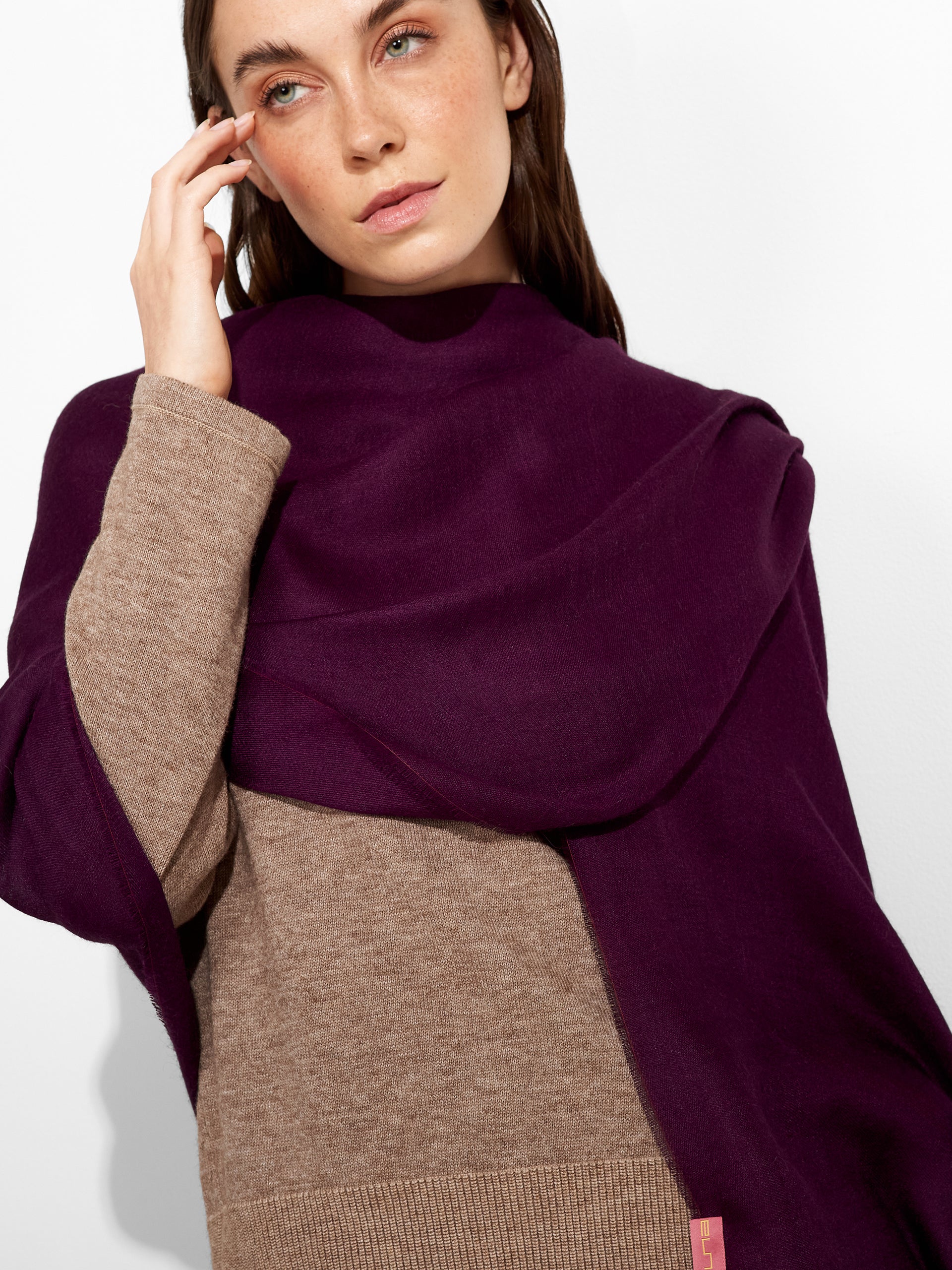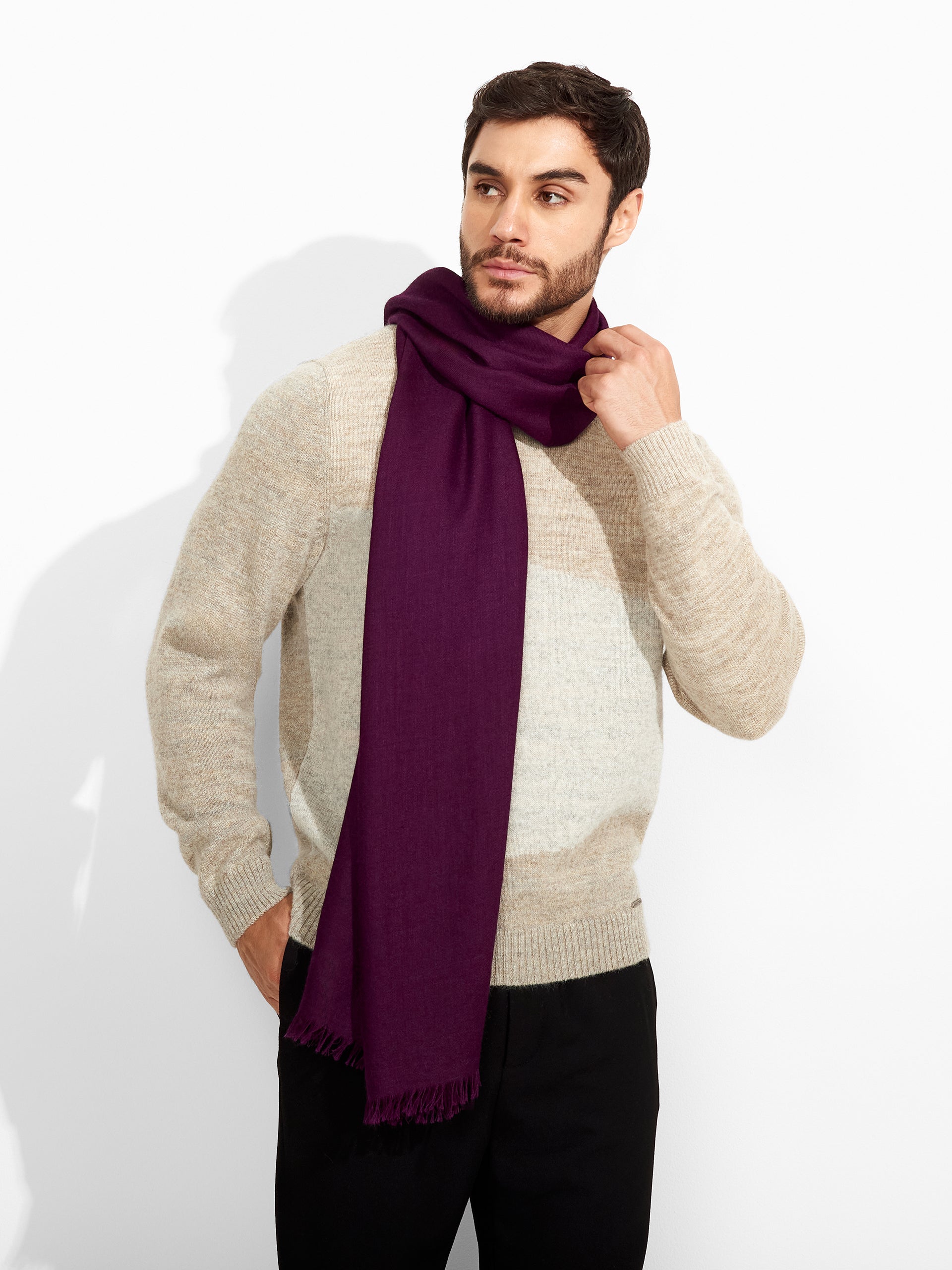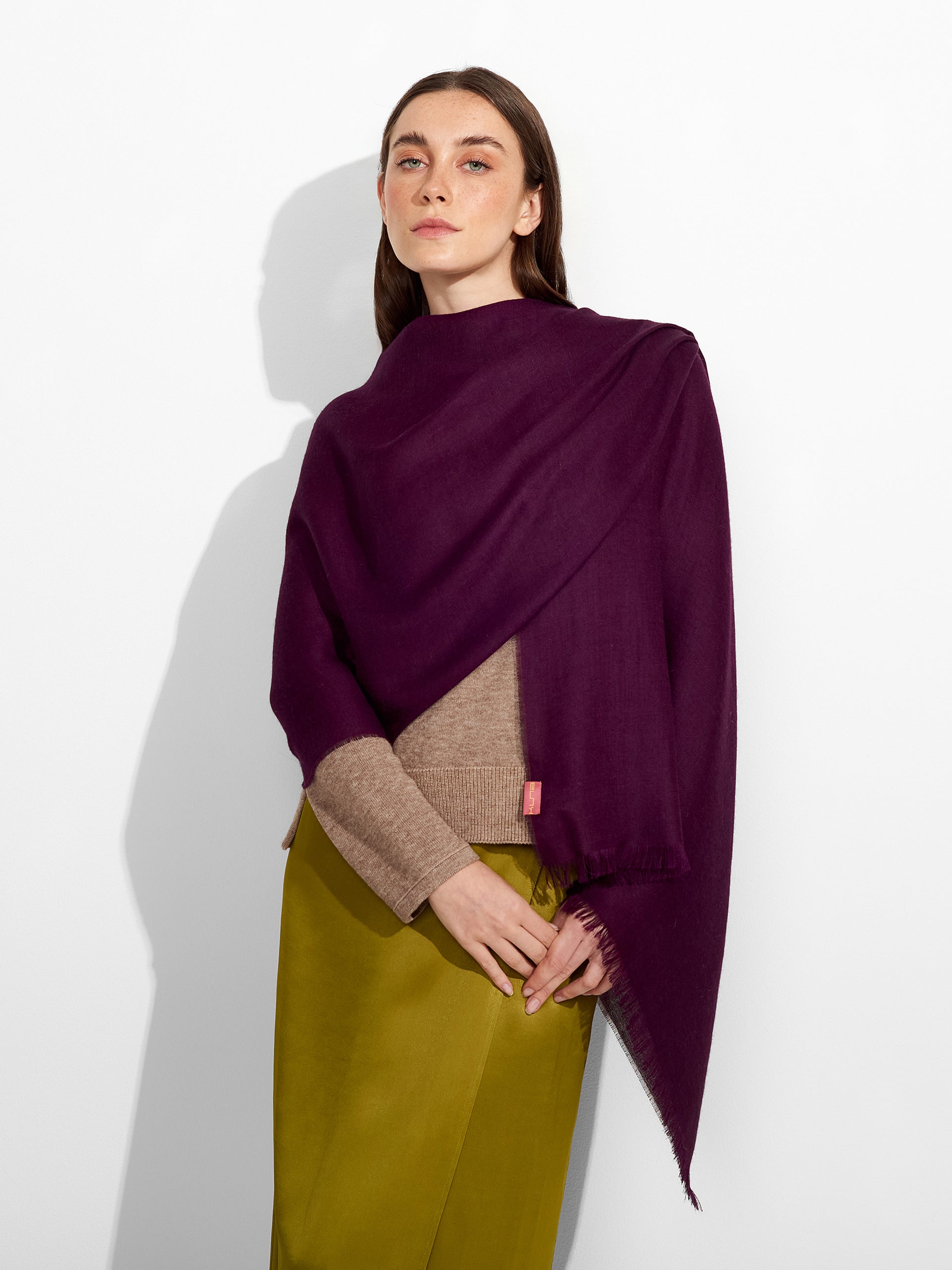 Estola Teaberry en tonalidad morado, de color entero, presenta bordes con flecos finos que aportan un acabado delicado. Confeccionada en baby alpaca y seda. | Material predominante: Baby Alpaca