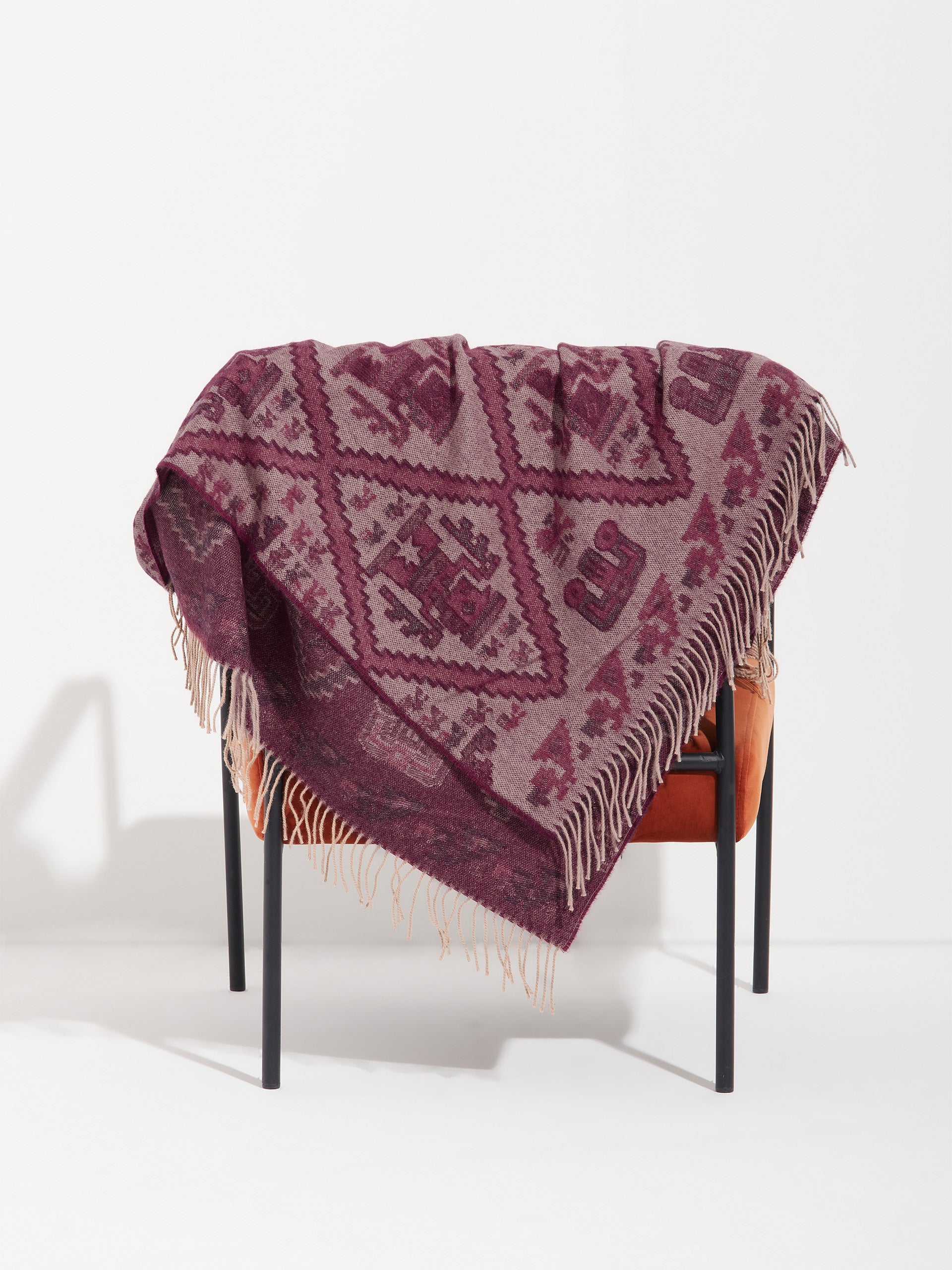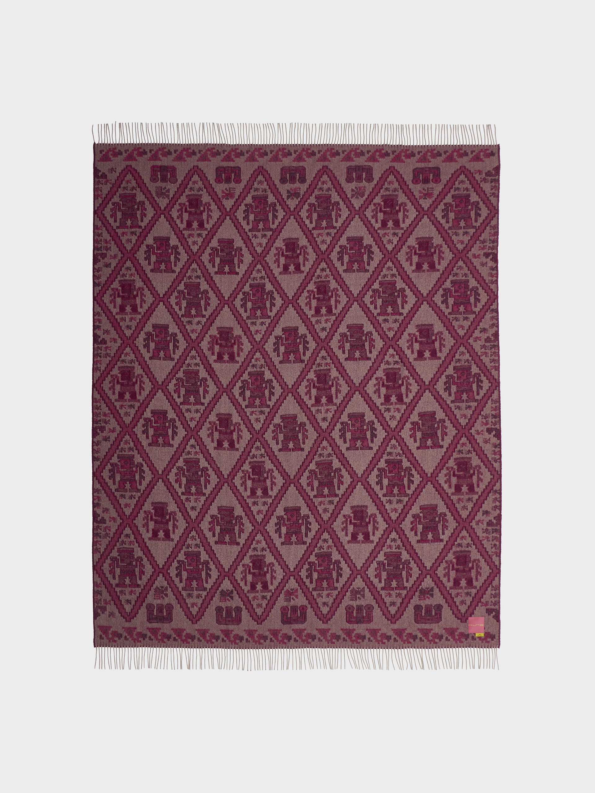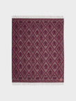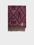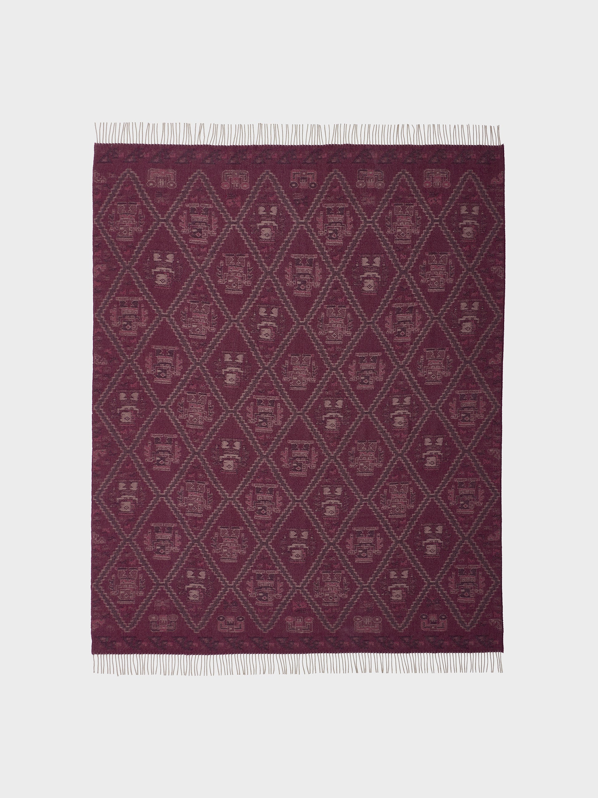 Manta Mochica 2 en tonalidad guinda, elaborada en 100% baby alpaca con técnica Jacquard en doble cara. Con una medida de 200/184 x 145 cm, está inspirada en la Cultura Mochica, que reinterpreta el legado ancestral en un diseño inspirado en la cultura originaria. | Material predominante: Baby Alpaca