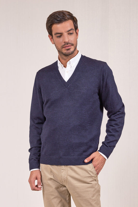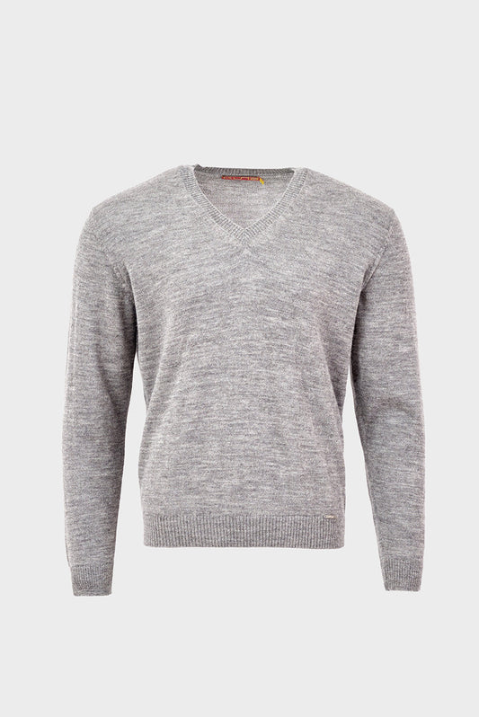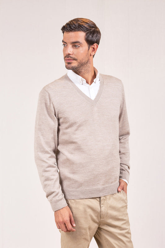Clásico suéter de cuello en V. Confeccionado de baby alpaca, es una cómoda y acogedora...