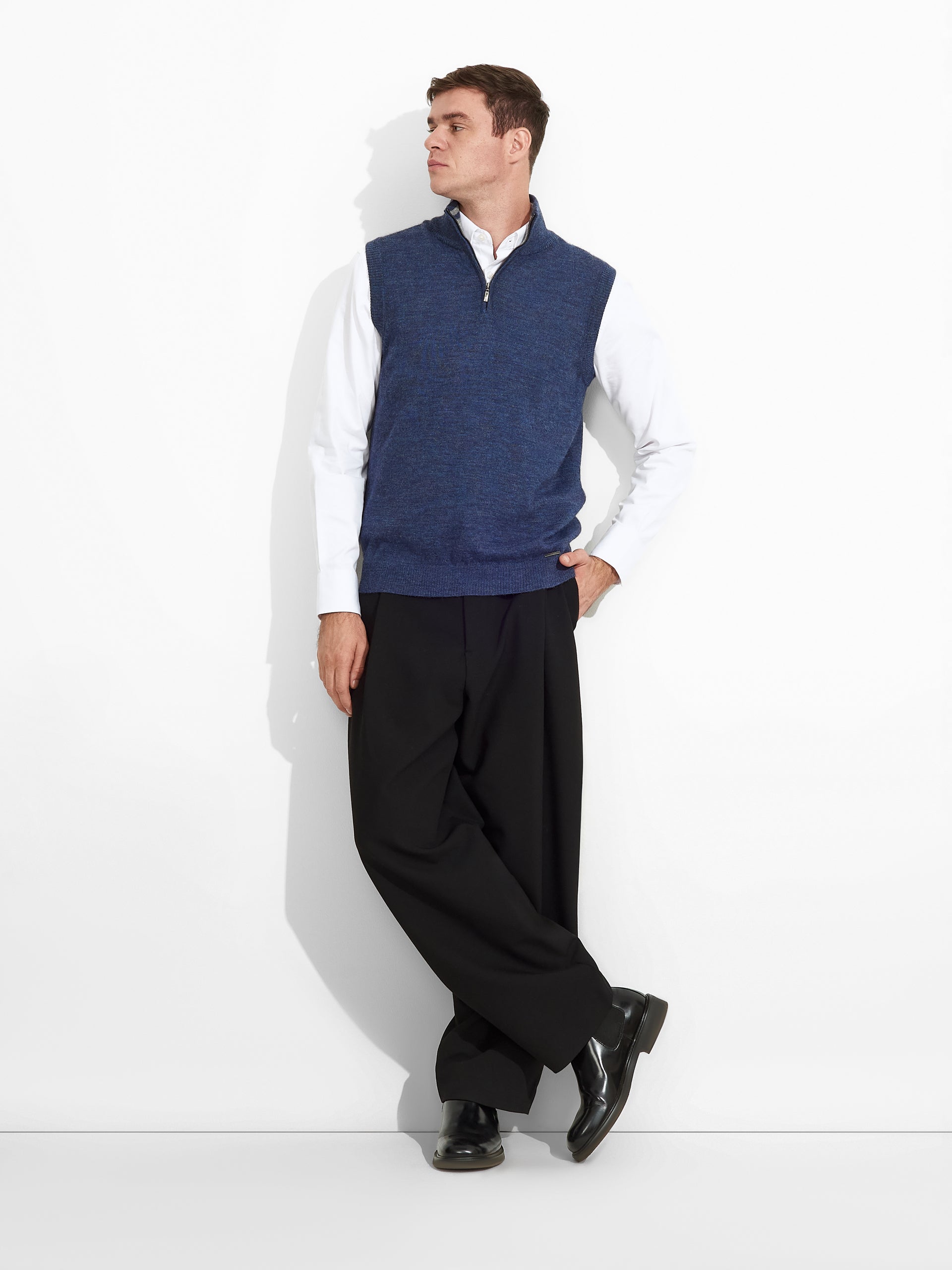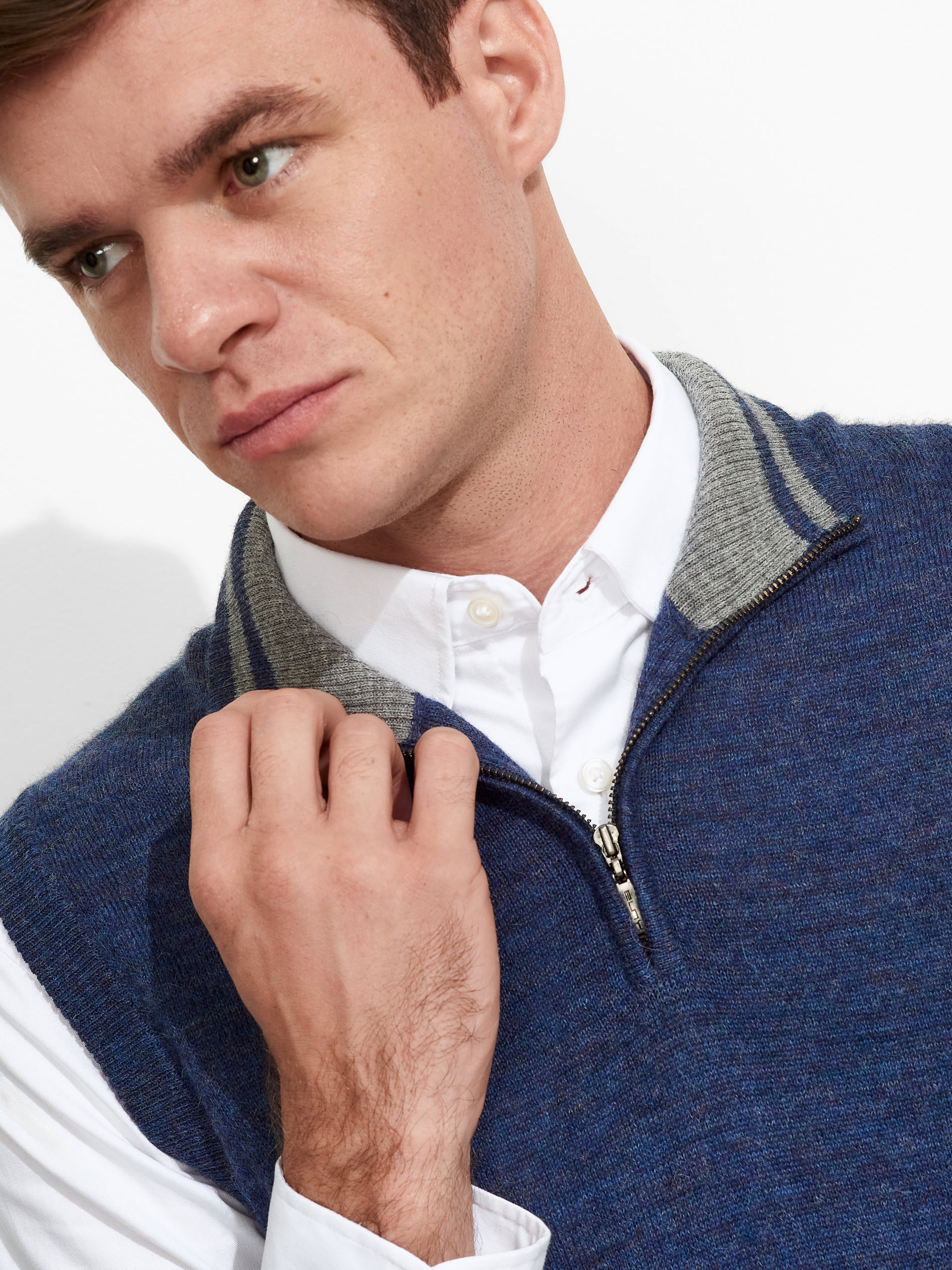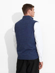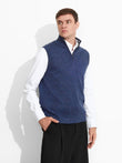Chaleco Zenith en tonalidad azul, de diseño en color entero con cierre de cremallera corta en la parte superior delantera y contraste de color en el cuello. Confeccionado en baby alpaca, brinda calidez y suavidad. | Material predominante: Baby Alpaca