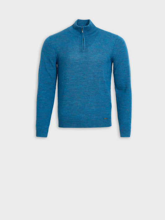 Suéter Albert en tonalidad azul, con cuello alto y cremallera parcial. Confeccionado en baby alpaca,...