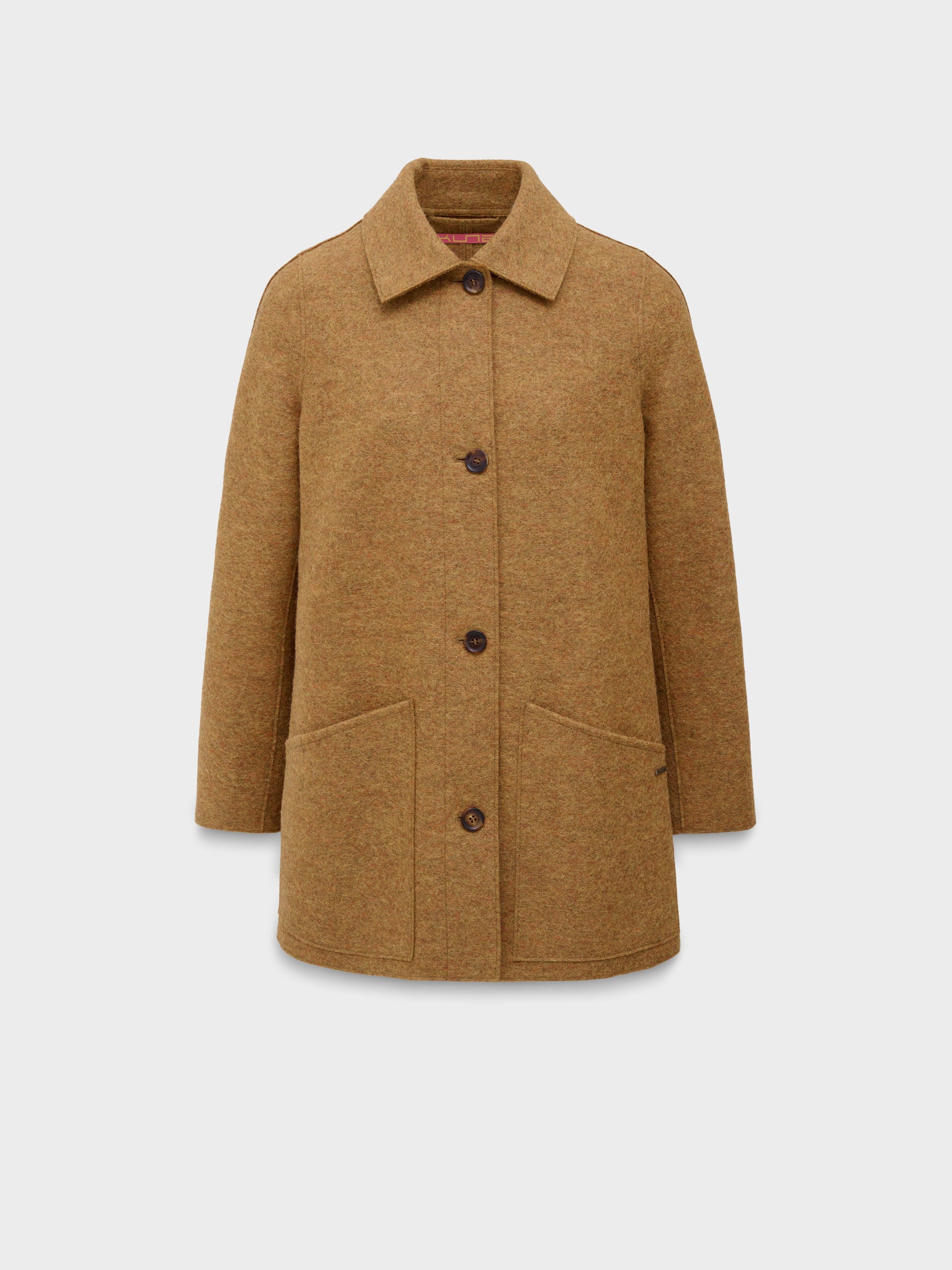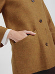 Saco Catalina en tonalidad amarillo, tejido en una mezcla de alpaca y lana. Esta prenda de mujer destaca por su diseño estructurado con cuello camisero, abotonadura frontal y bolsillos de parche con corte diagonal. Una pieza que equilibra la sobriedad con un toque moderno, ofreciendo una textura firme pero suave que garantiza una calidez ideal y una elegancia duradera. | Material predominante: AlpacayLana