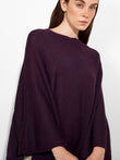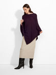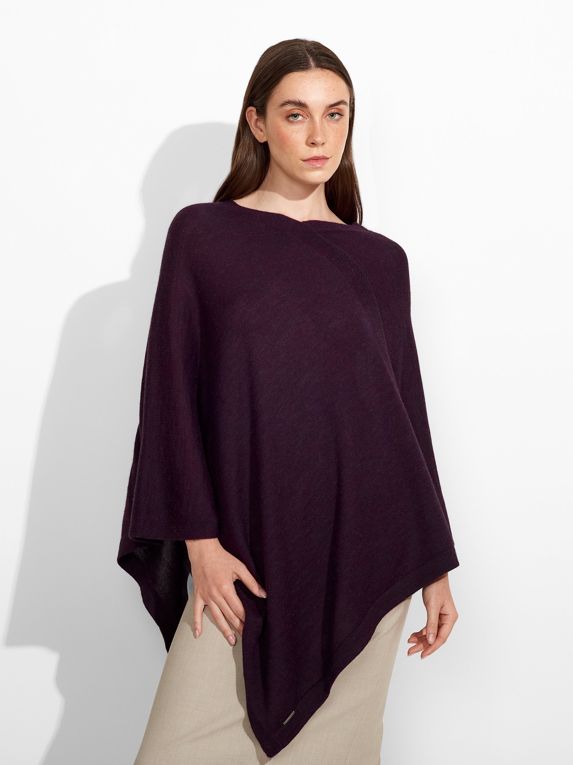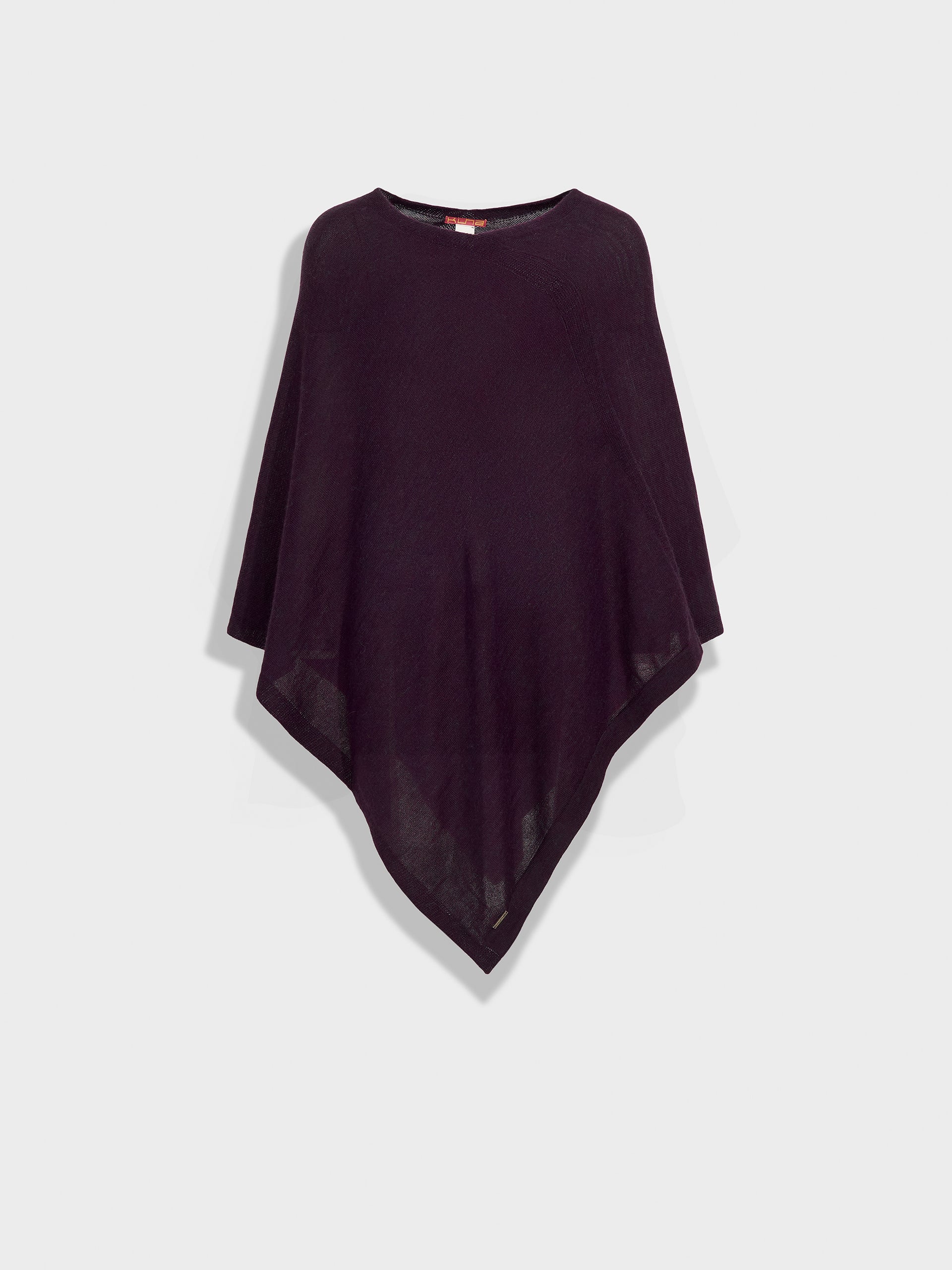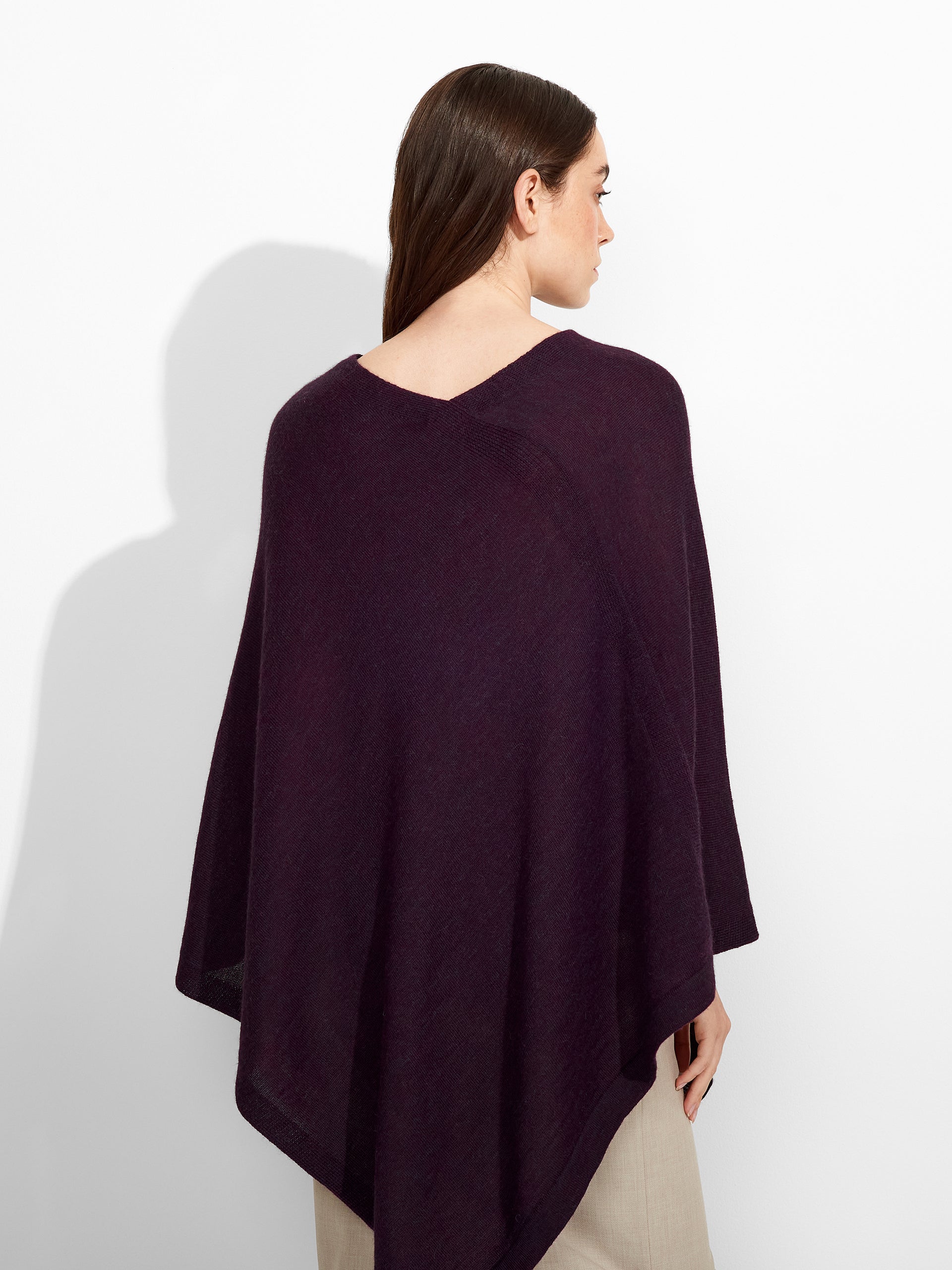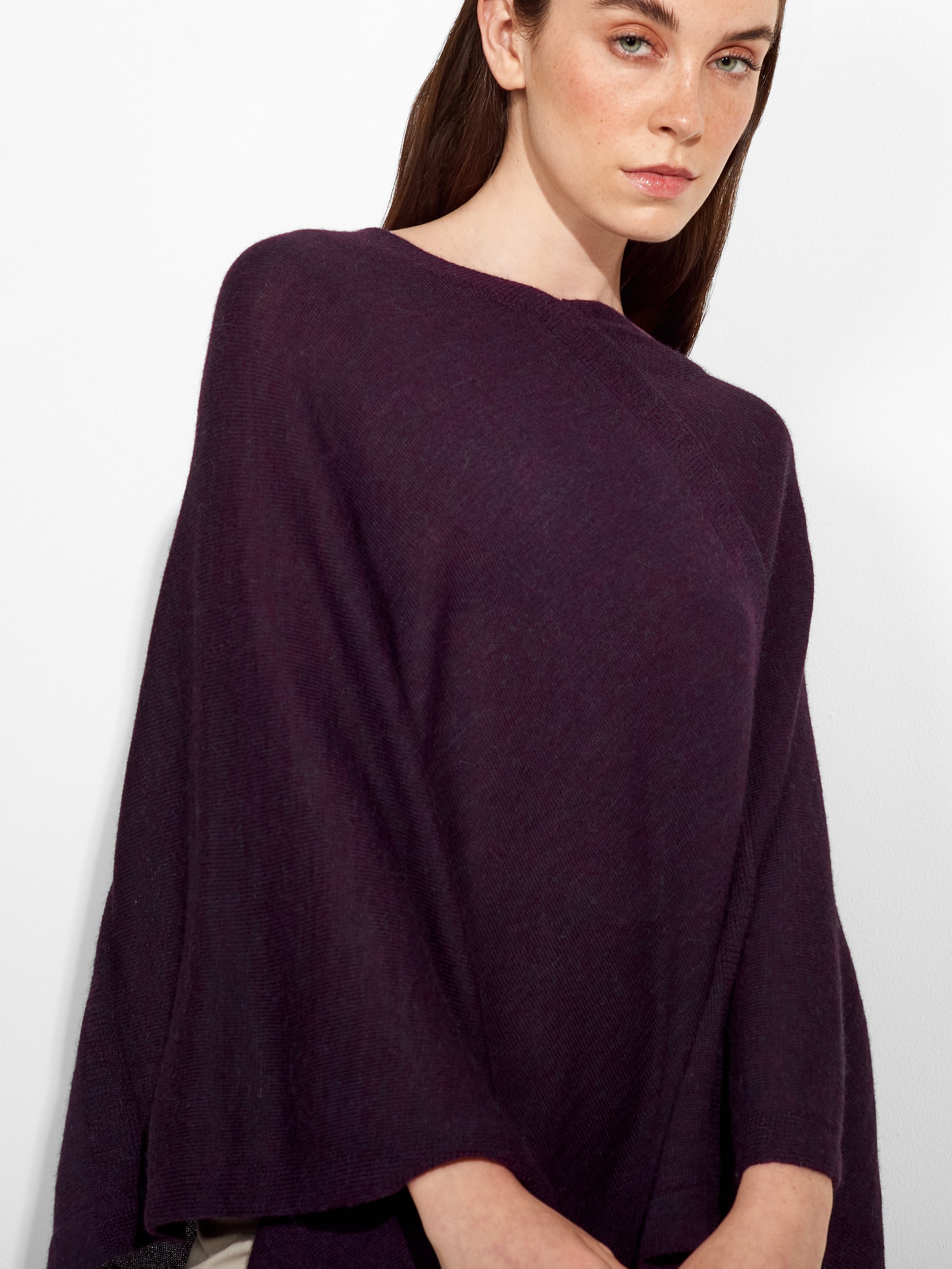 Poncho Almendra en tonalidad morado, de color entero y silueta suelta, presenta un diseño con terminación en forma de punta en la parte delantera y trasera. Confeccionado en baby alpaca brinda calidez y suavidad. | Material predominante: Baby Alpaca