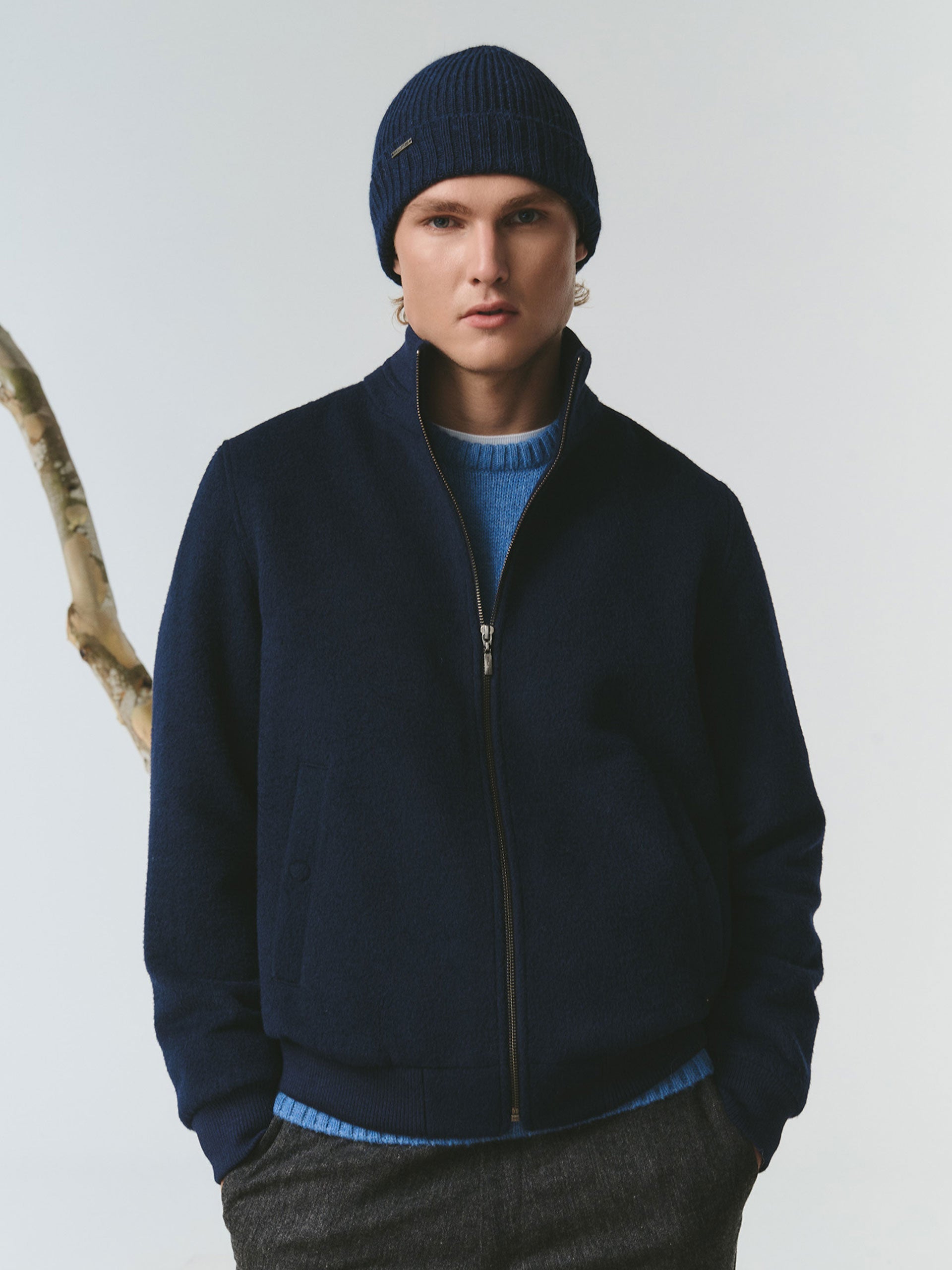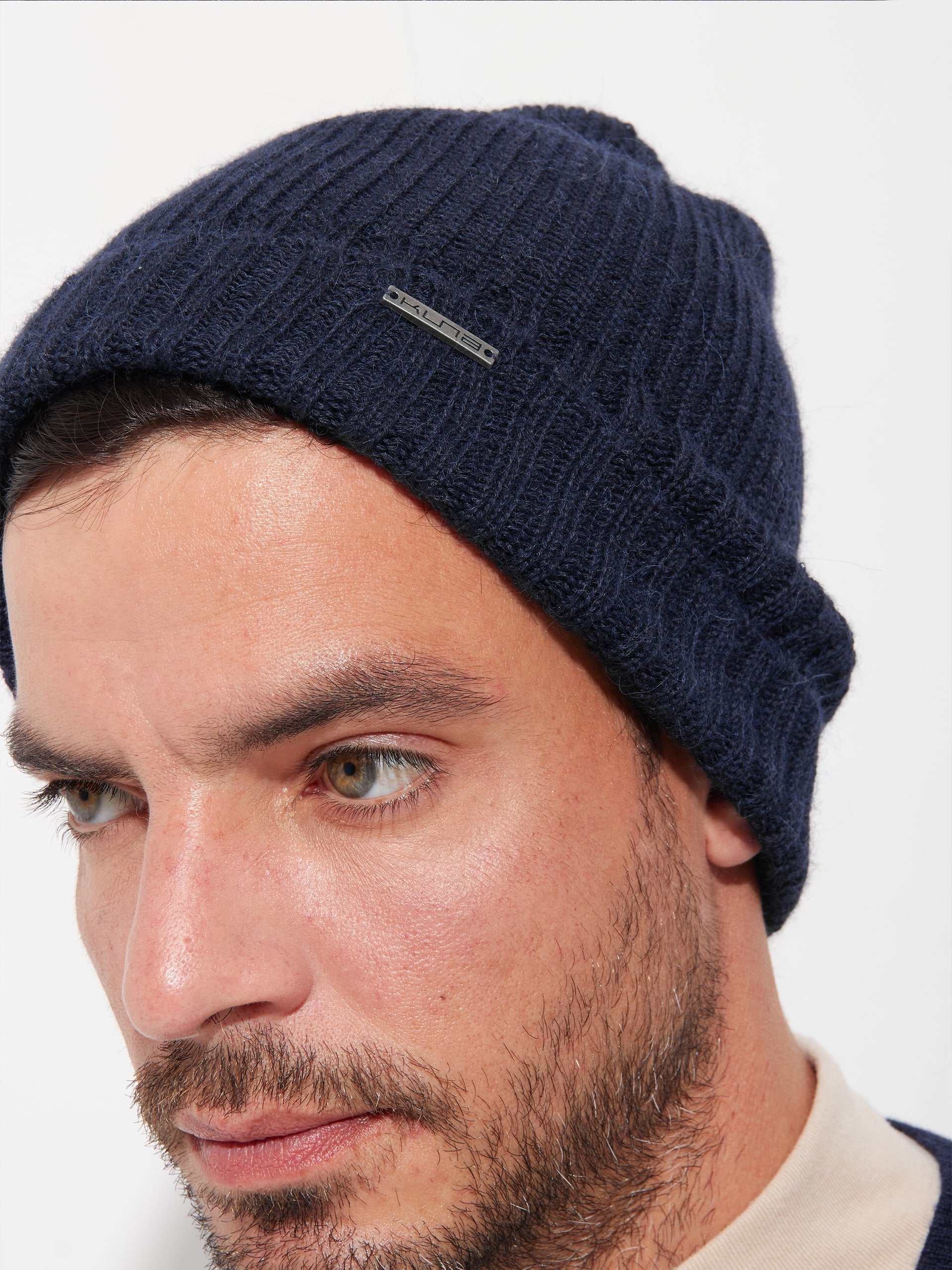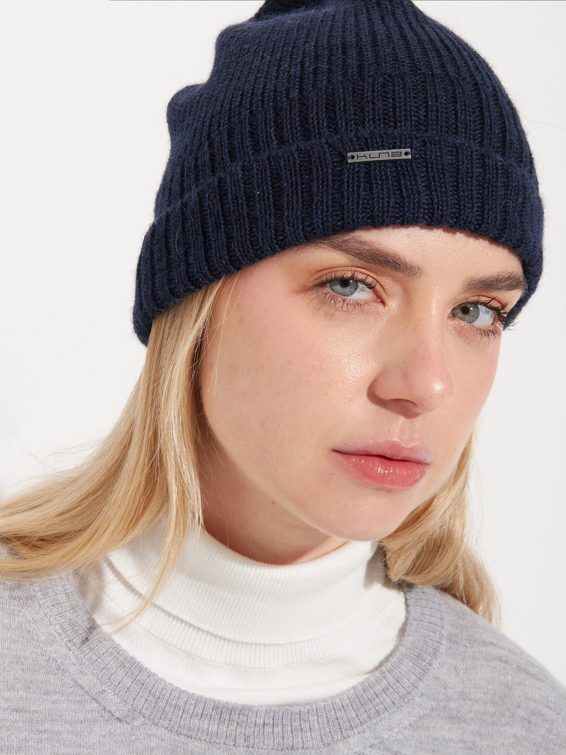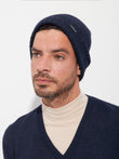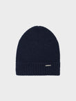 Gorro Apostrofe en tonalidad azul, confeccionado en 100% baby alpaca. Este accesorio de punto destaca por su ajuste ceñido y pretina doblada, ofreciendo un diseño minimalista de color entero. | Material predominante: Baby Alpaca