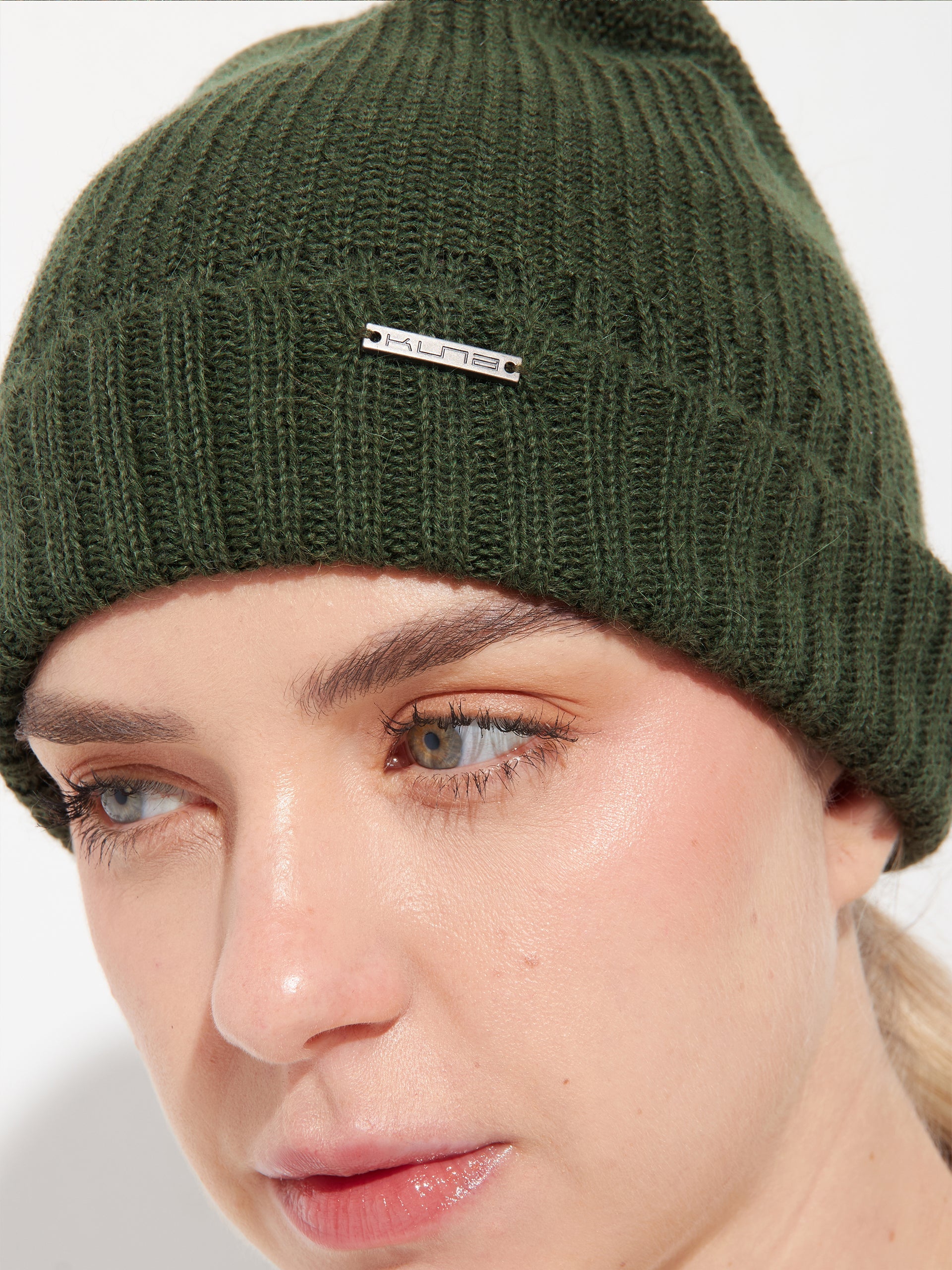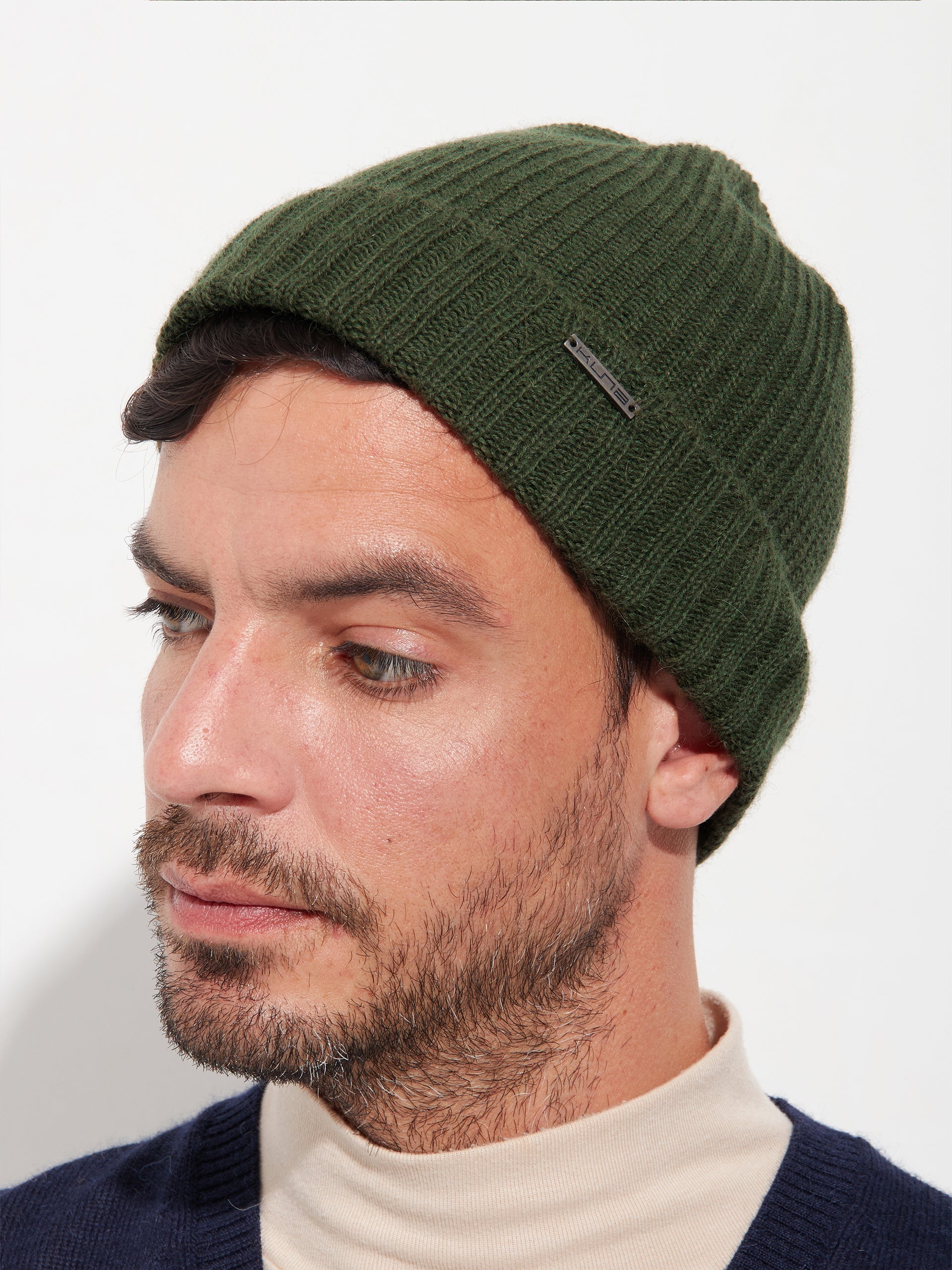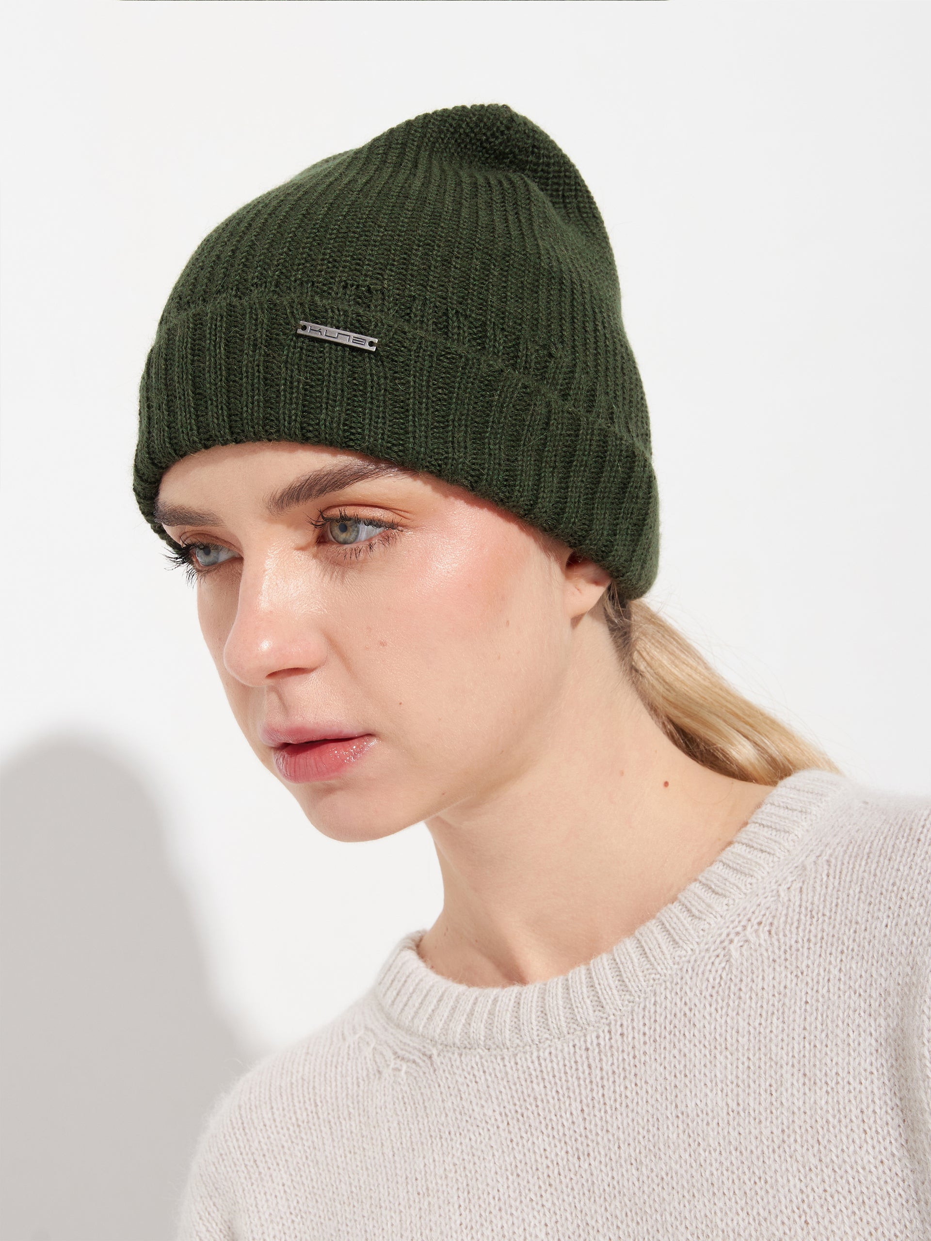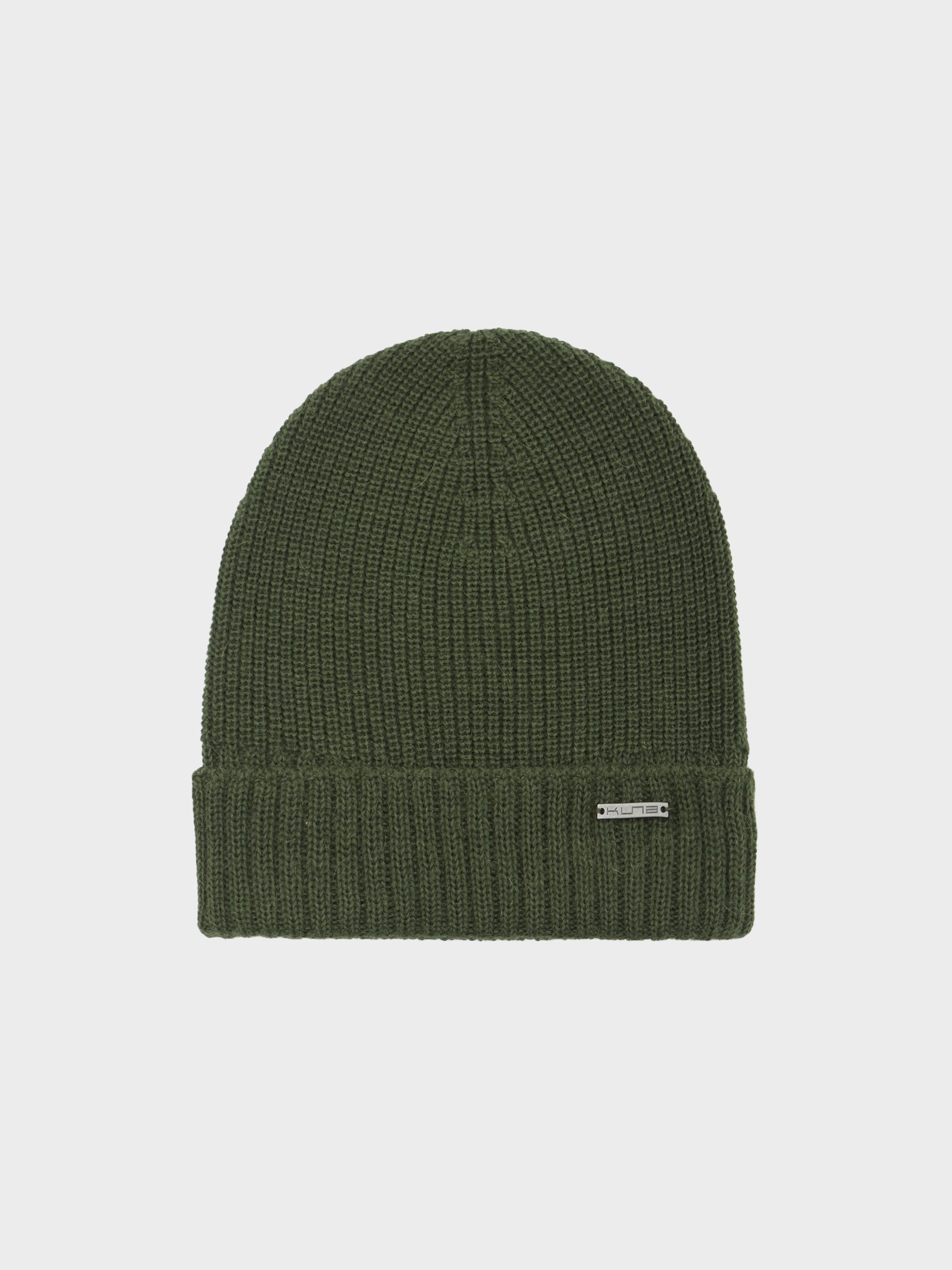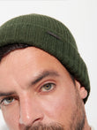 Gorro Apostrofe en tonalidad verde, confeccionado en 100% baby alpaca. Este accesorio de punto destaca por su ajuste ceñido y pretina doblada, ofreciendo un diseño minimalista de color entero. | Material predominante: Baby Alpaca