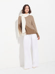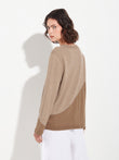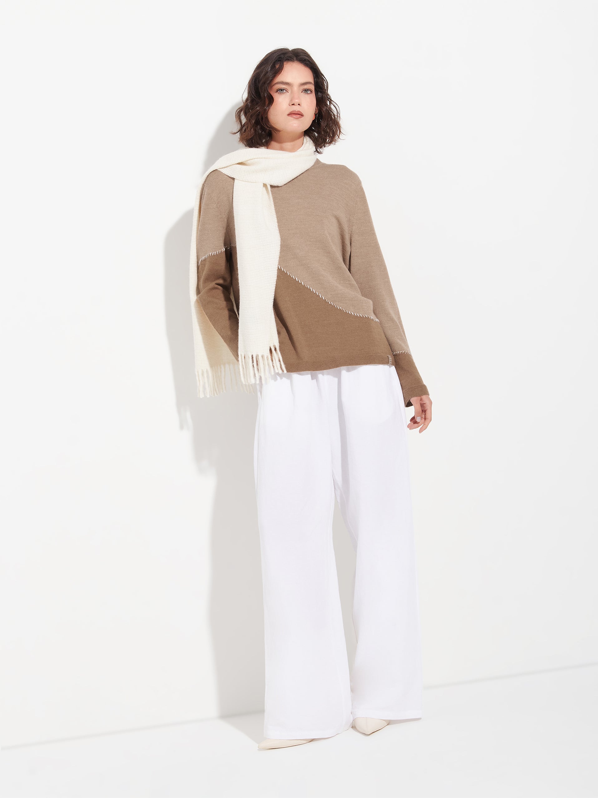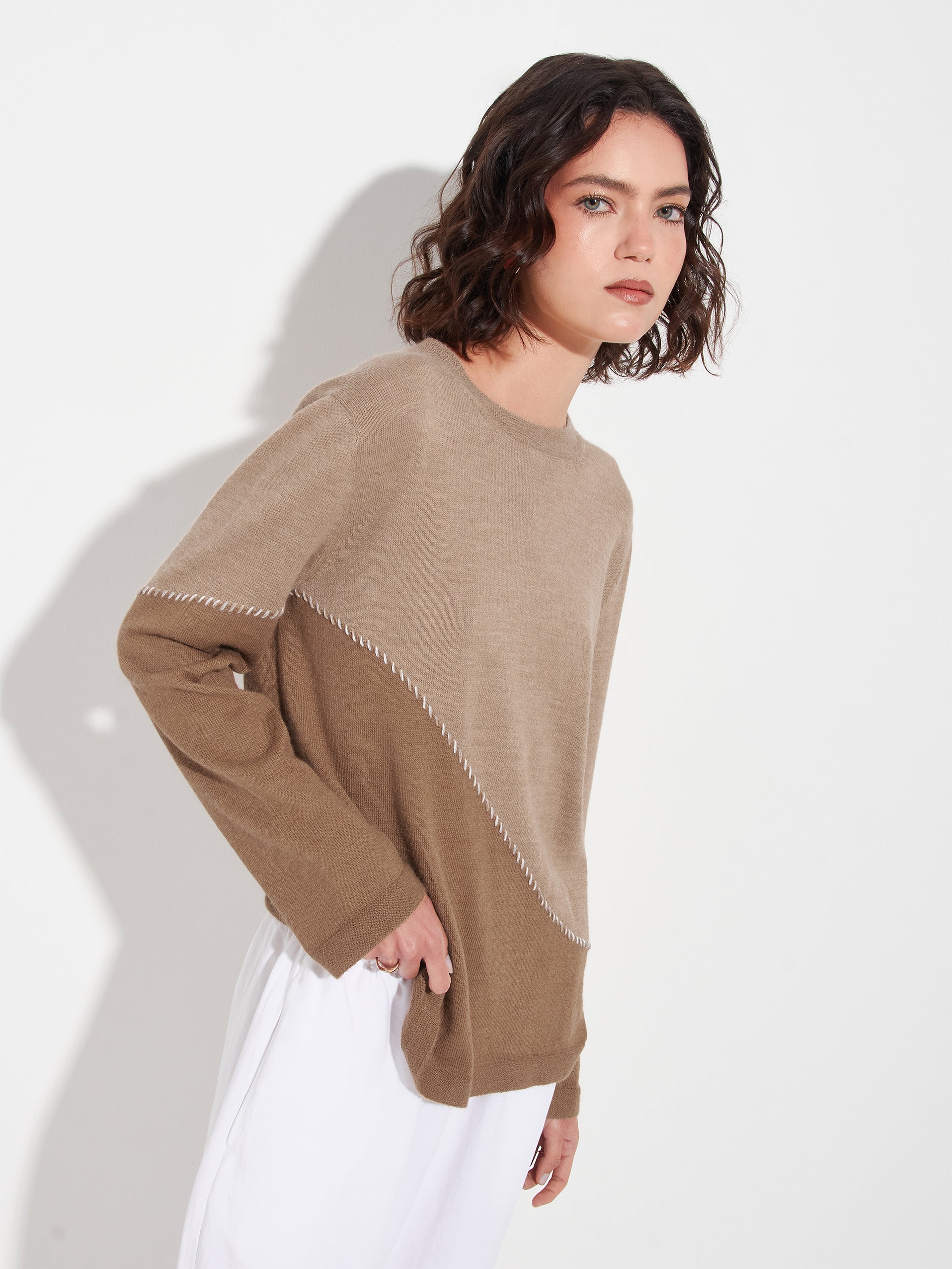 Suéter Basilea en tonalidad camel, con cuello redondo y diseño tejido en intarsia. Confeccionado en 100% baby alpaca RAS para brindar suavidad y confort. Incluye delicado detalle de bordado a mano que realza su diseño | Material predominante: Baby Alpaca