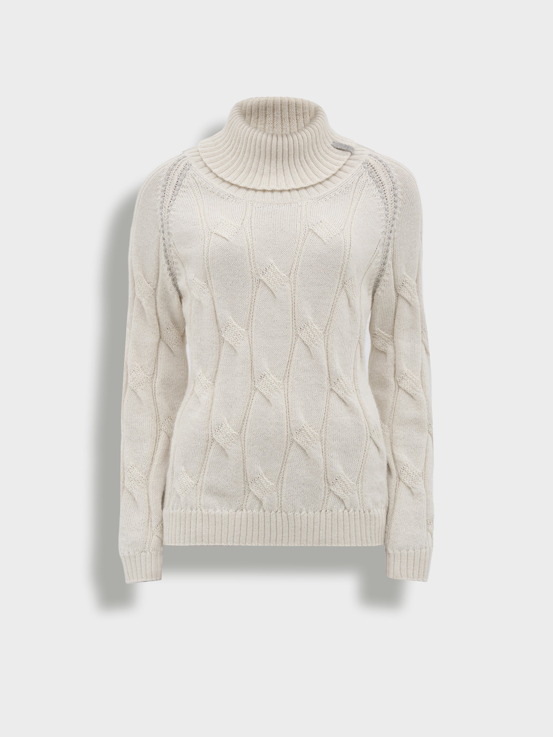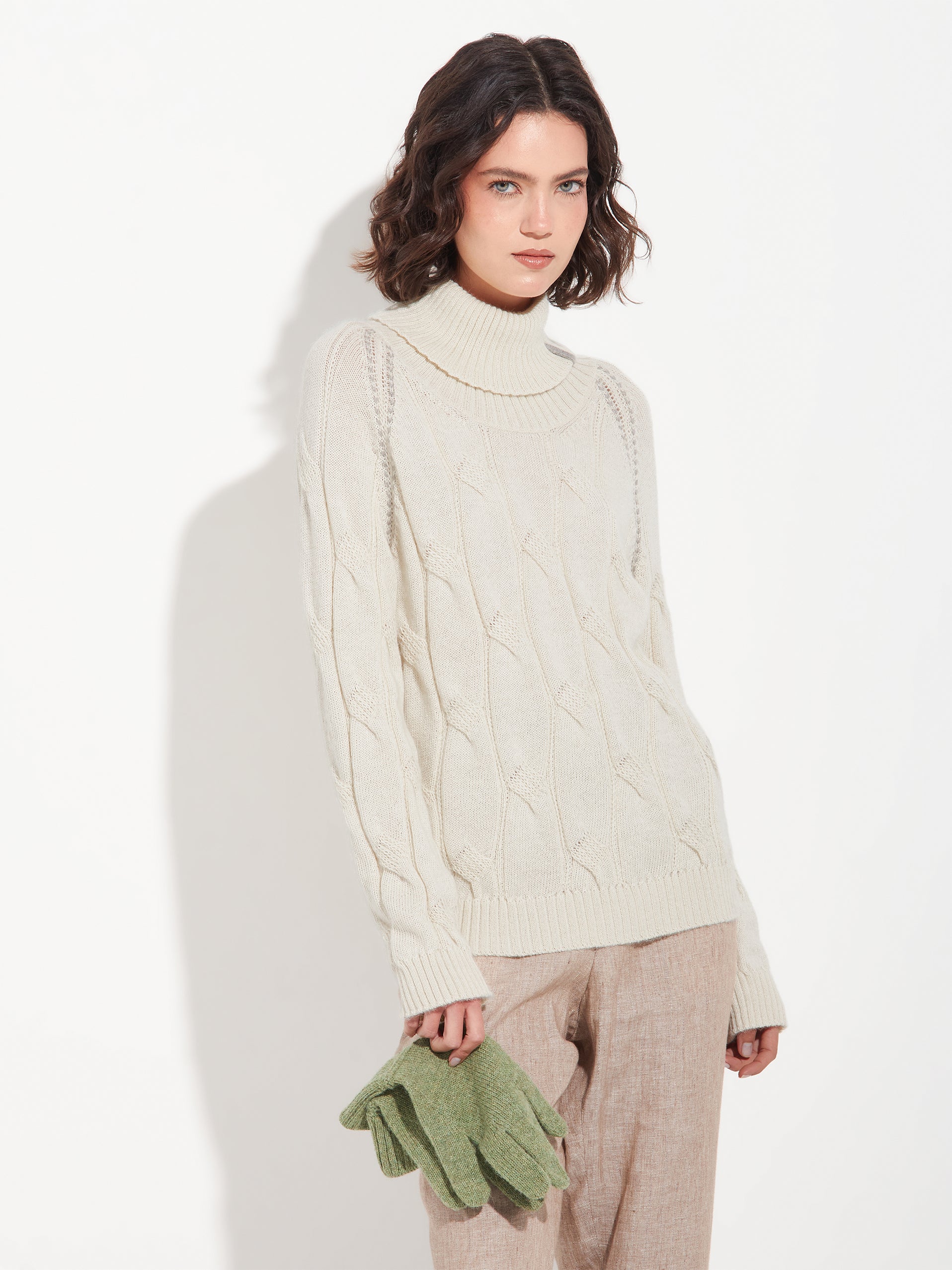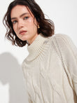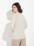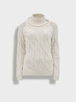 Suéter Bettina en tonalidad beige, con cuello tortuga y tejido en punto trenzado. Confeccionado en 100% baby alpaca RAS para brindar calidez y suavidad. Incluye sisa raglán y delicado bordado a mano que acentúa su diseño exclusivo. | Material predominante: Baby Alpaca