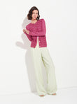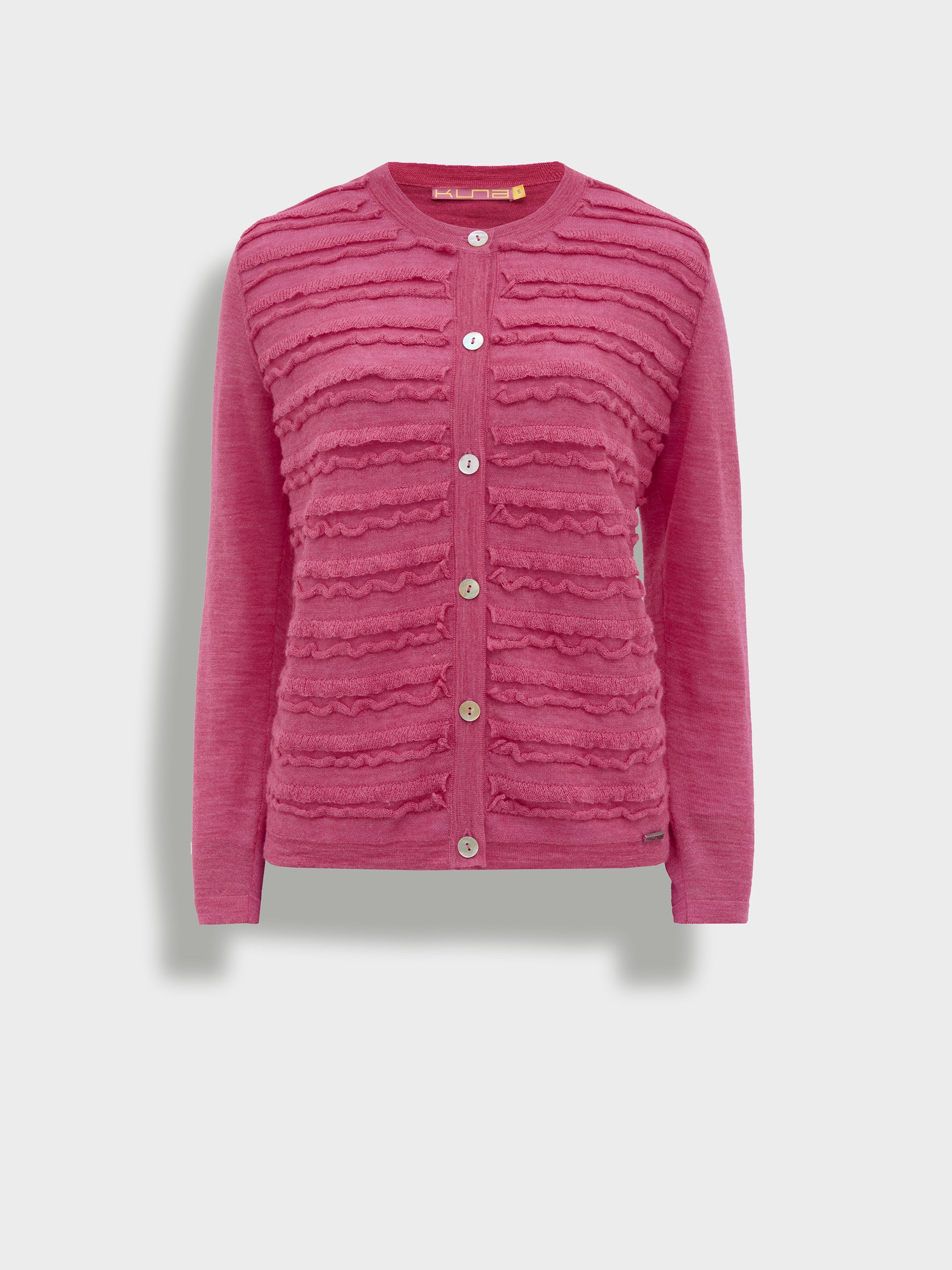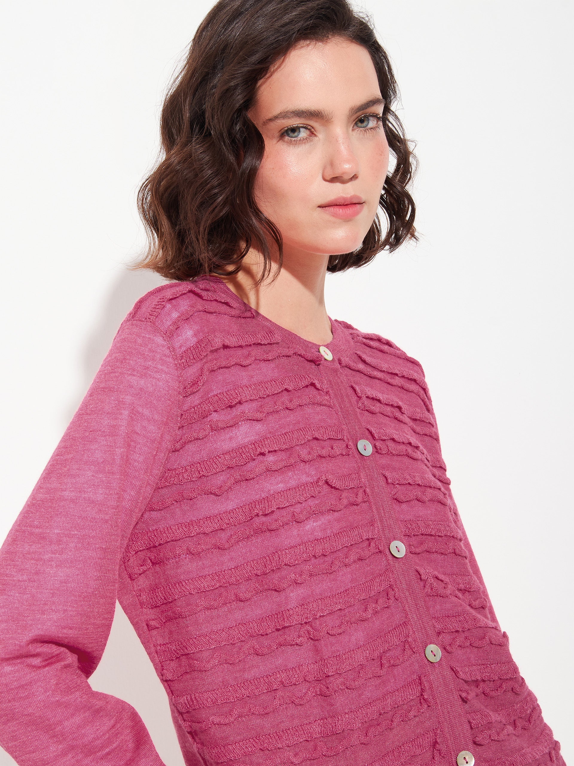 Cardigan Zarina en tonalidad fucsia, confeccionado en baby alpaca y seda. Presenta cuello redondo con botones, un delicado punto en relieve en la parte delantera y punto llano en la espalda y mangas. Su diseño combina textura y suavidad, ideal para un estilo clásico y refinado. | Material predominante: Baby Alpaca