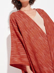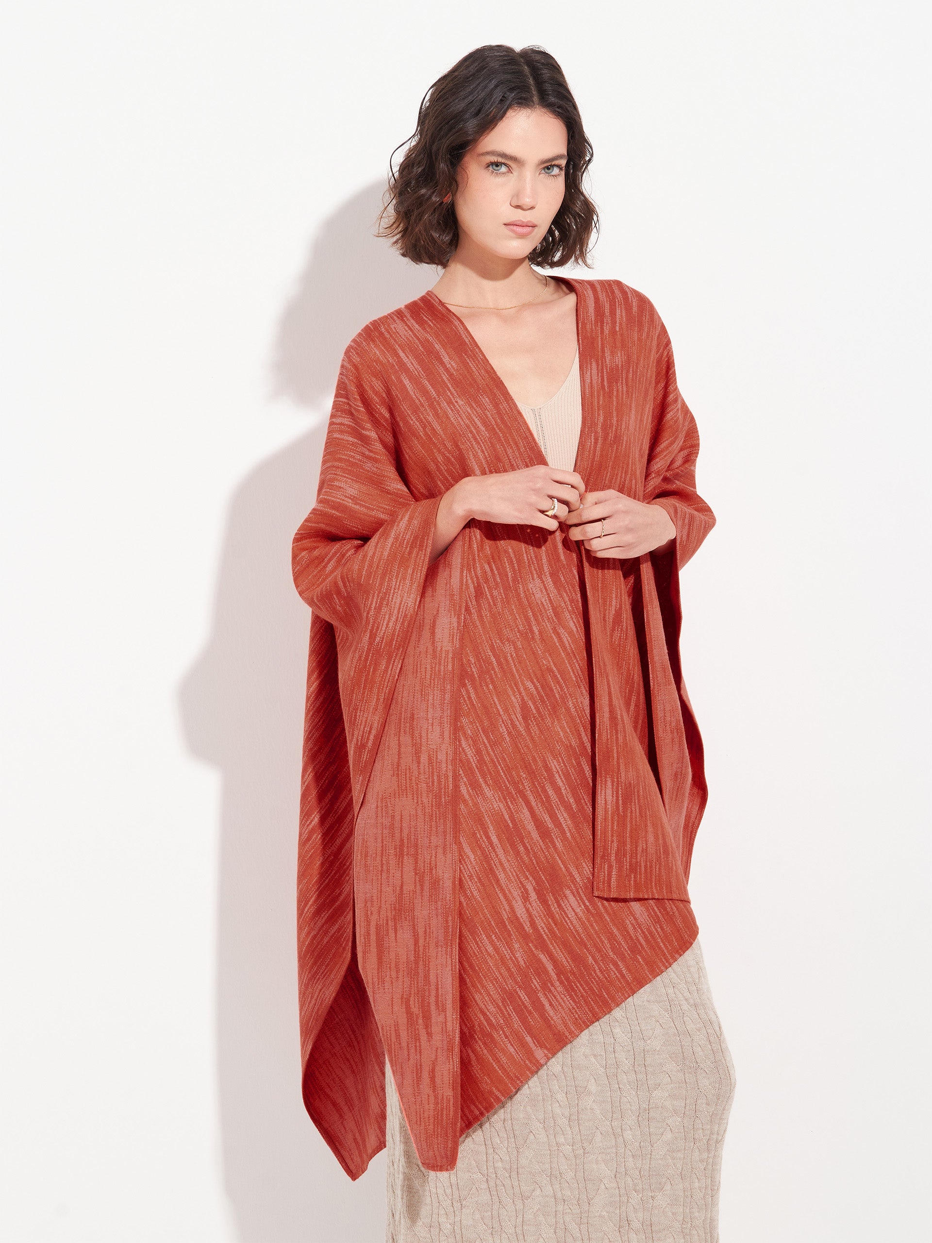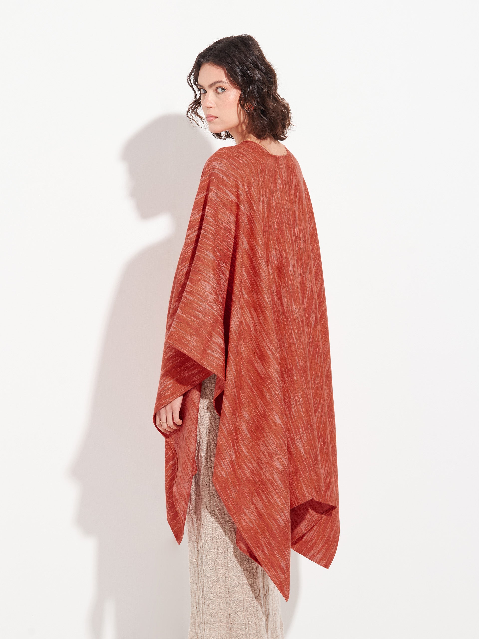 Capa Zareli en tonalidad naranja, confeccionada en baby alpaca y seda. Es una capa doble faz con diseño jacquard a tres colores, que combina calidez, textura y elegancia atemporal. | Material predominante: Baby Alpaca