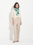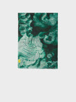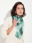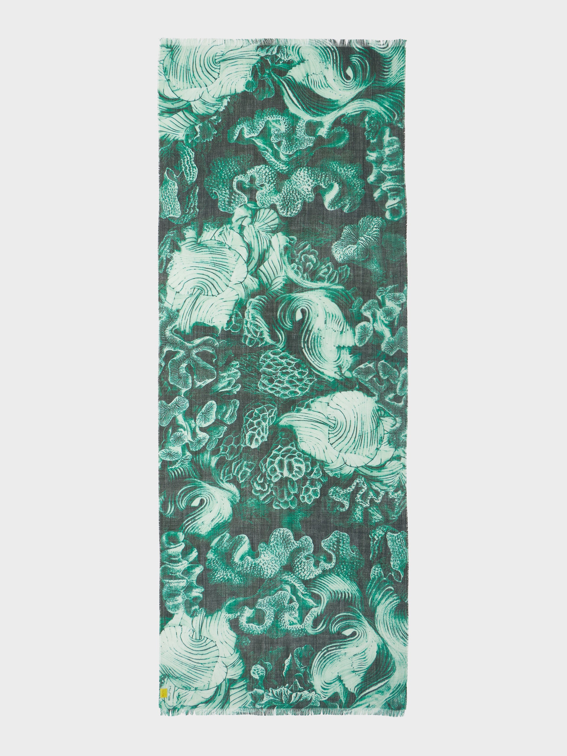 Estola Zanone en tonalidad verde, confeccionada en baby alpaca y seda. Presenta un delicado estampado digital y volantes que aportan movimiento y fluidez. Ideal para añadir un toque artístico y sofisticado. | Material predominante: Baby Alpaca