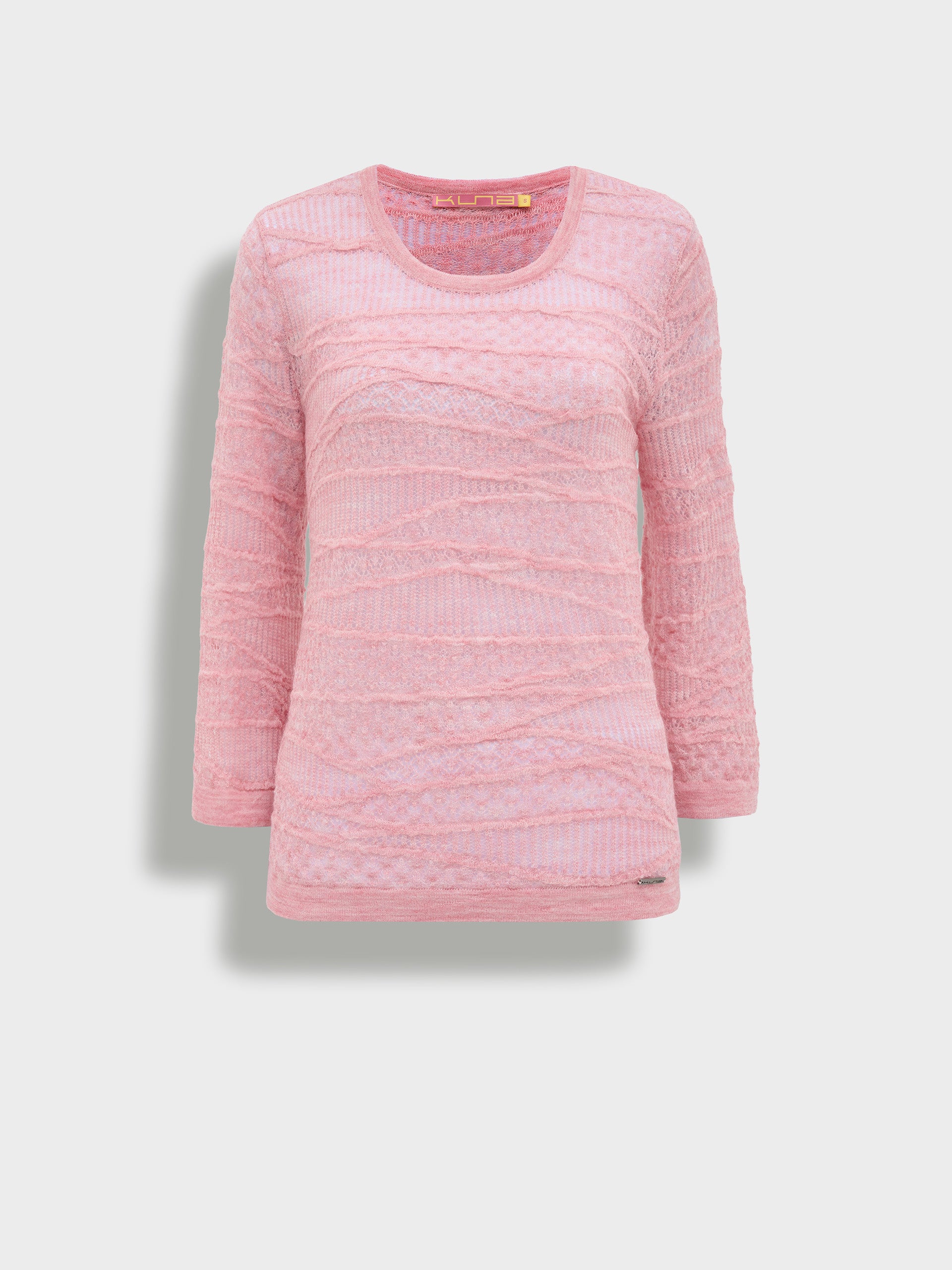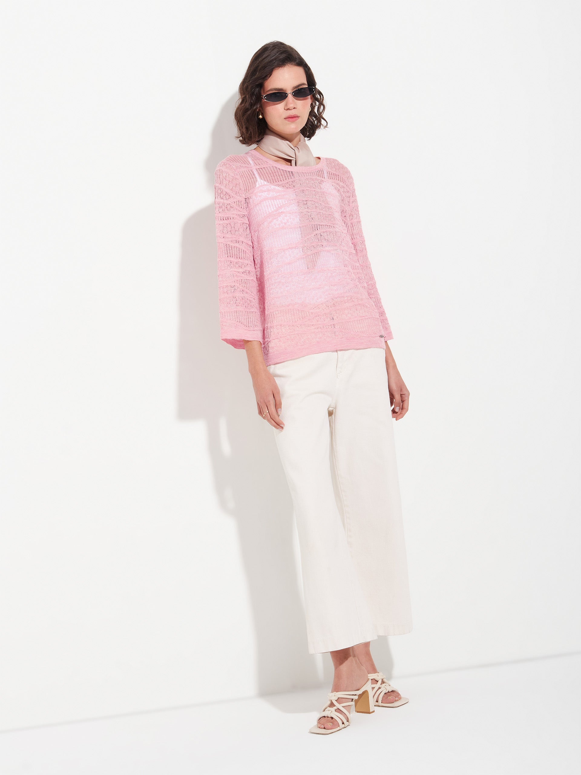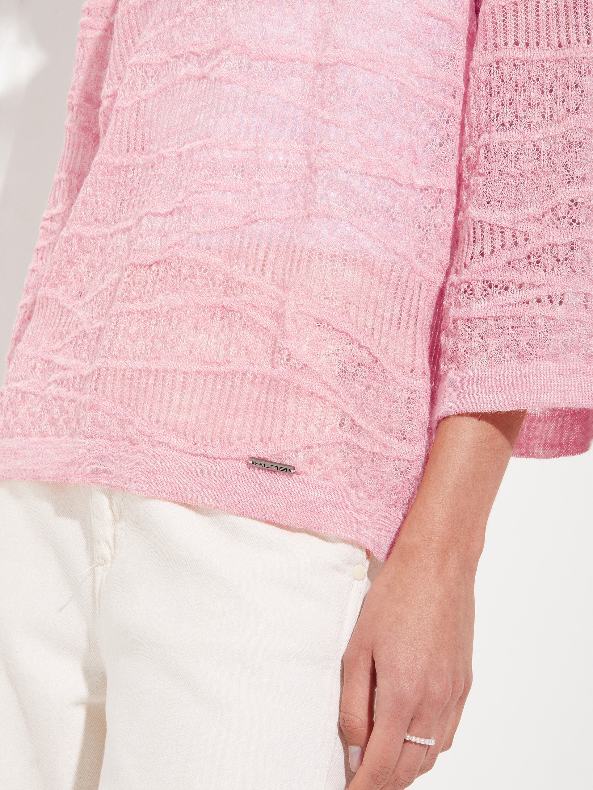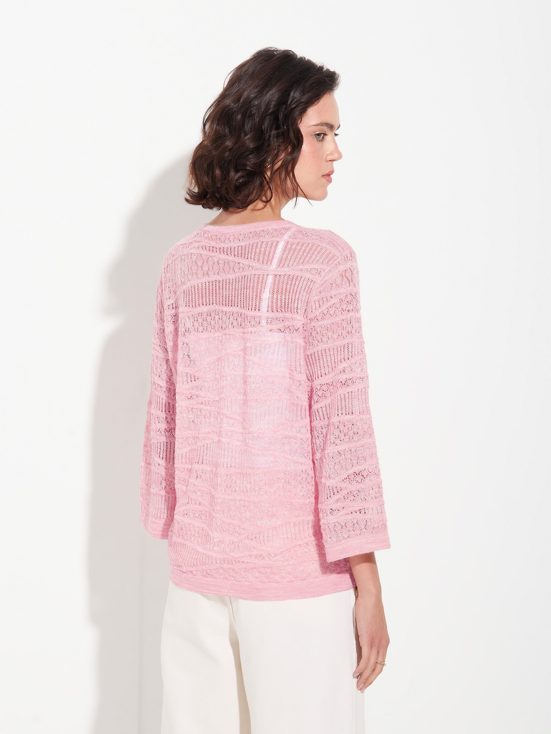 Suéter Zample en tonalidad rosada, confeccionado en una mezcla de baby alpaca y seda. Presenta cuello redondo y un delicado diseño con puntos diversos de pointelle, junto a mangas tres cuartos. Su textura suave y su acabado refinado lo convierten en una prenda femenina y elegante. | Material predominante: Baby Alpaca