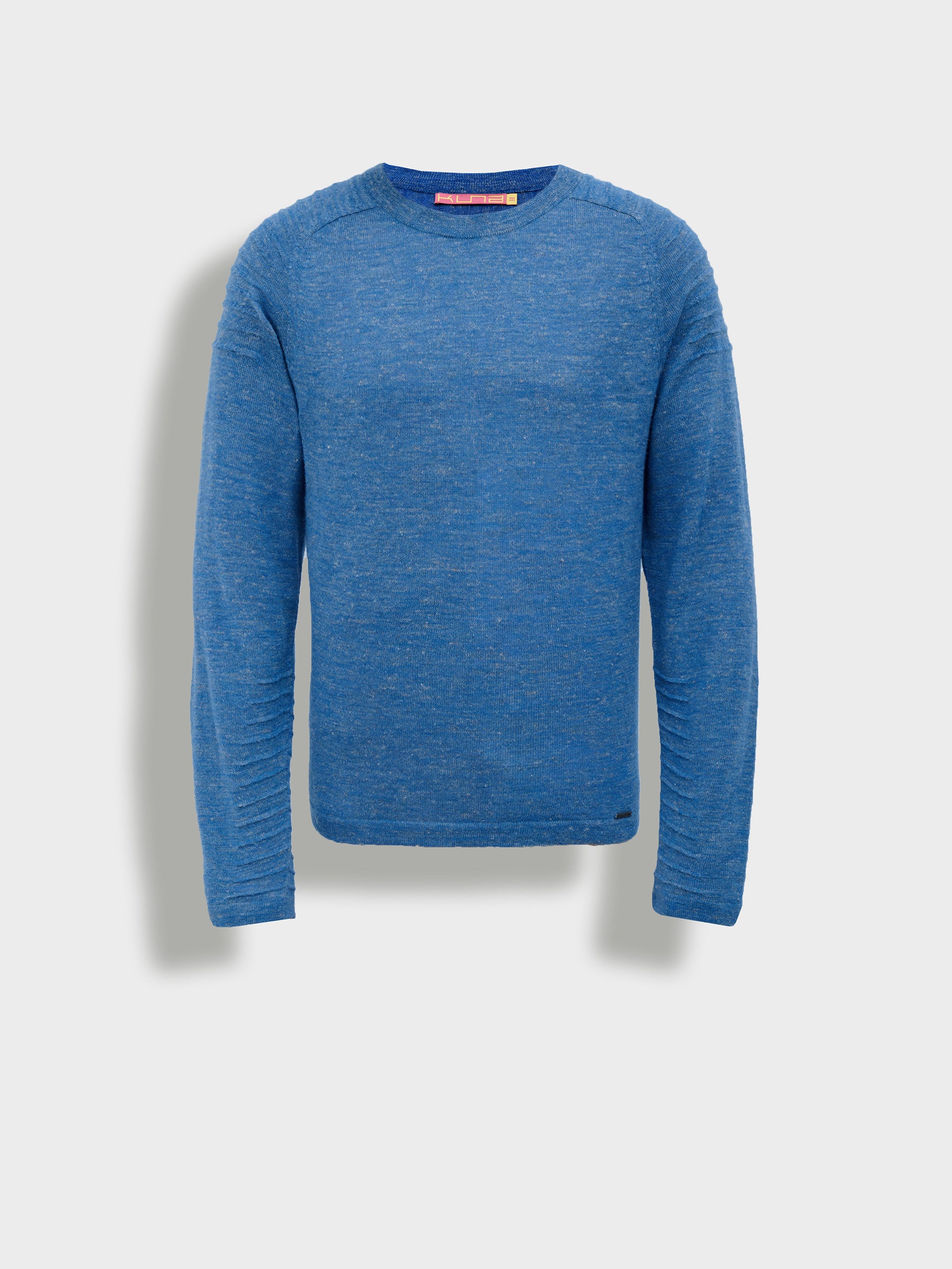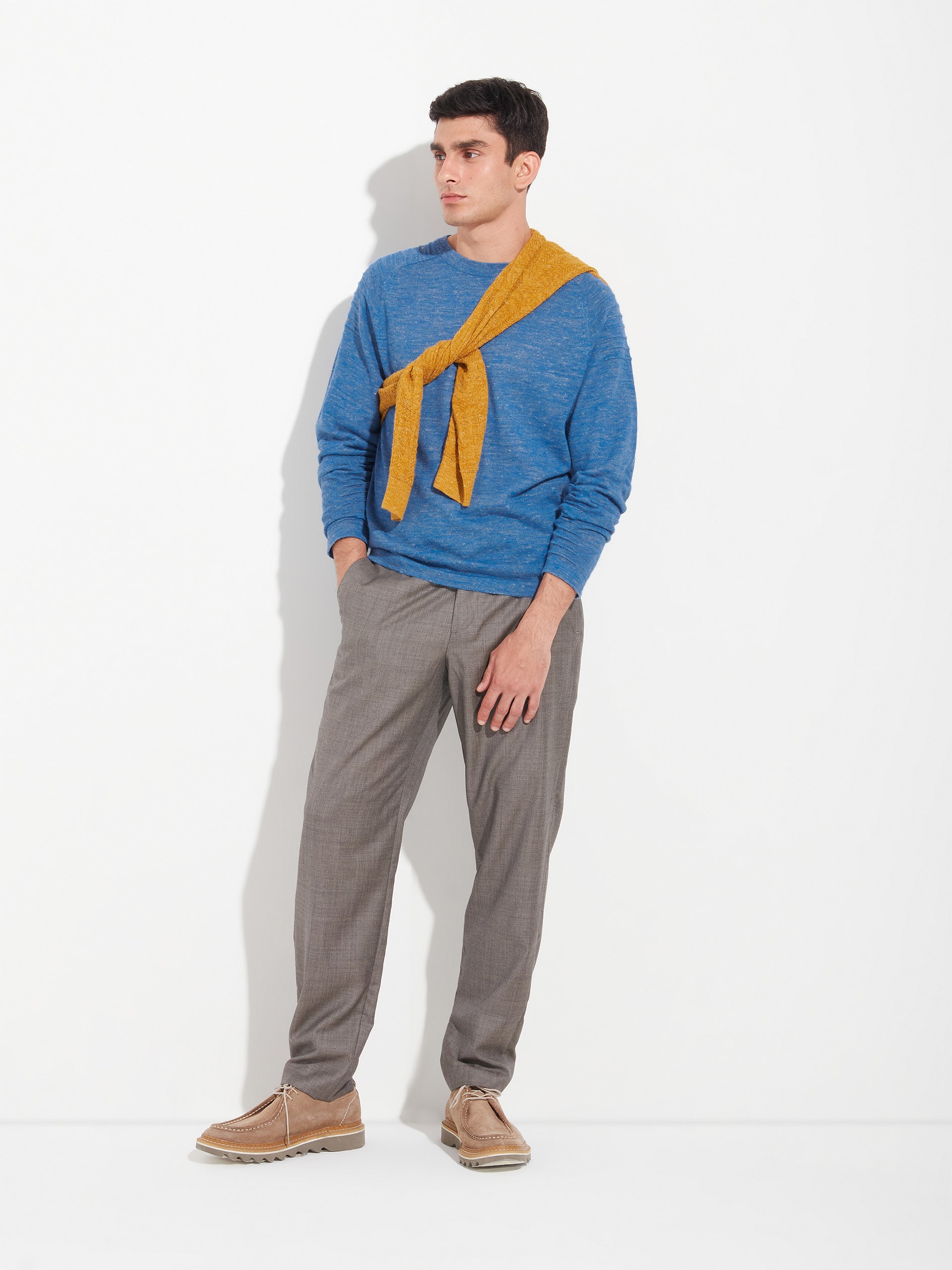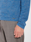 Suéter Zwei en tonalidad blue, confeccionado en una mezcla de baby alpaca y lino. Presenta cuello redondo en punto llano con un delicado detalle estructurado en los hombros y mangas. Su textura suave y ligera brinda comodidad y un estilo refinado. | Material predominante: Baby Alpaca