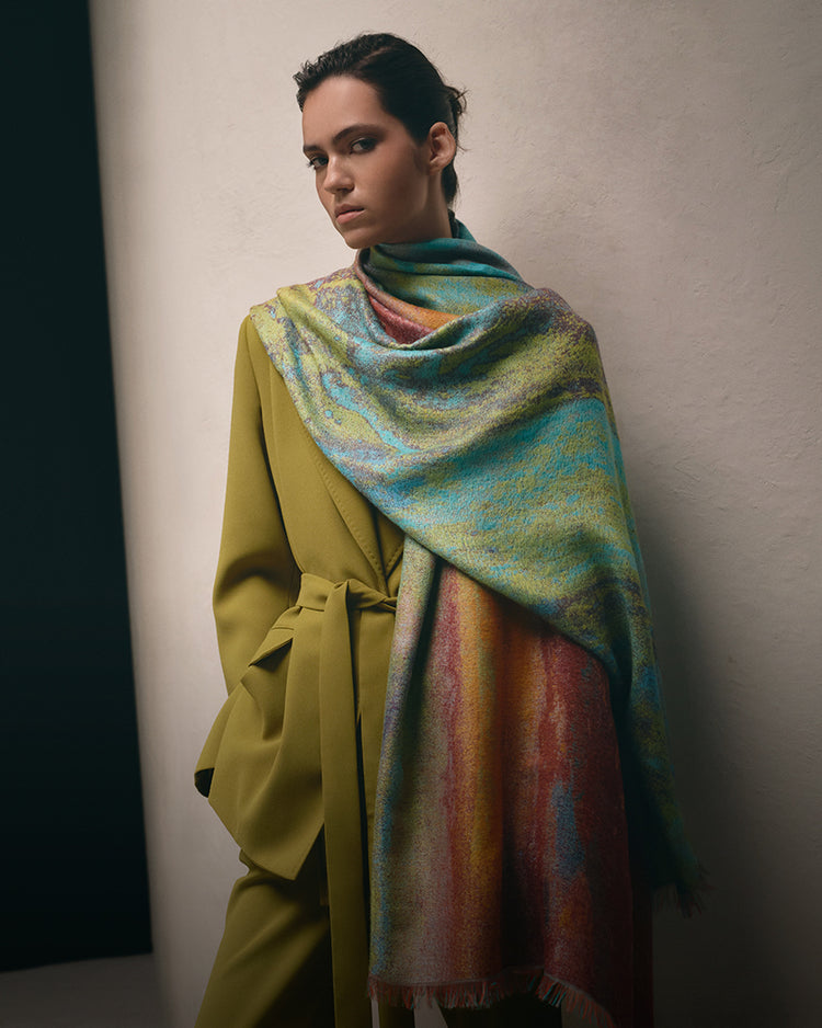 Manta Chimu 13 en tonalidad turqueza, elaborada en 100% baby alpaca con técnica Jacquard en...