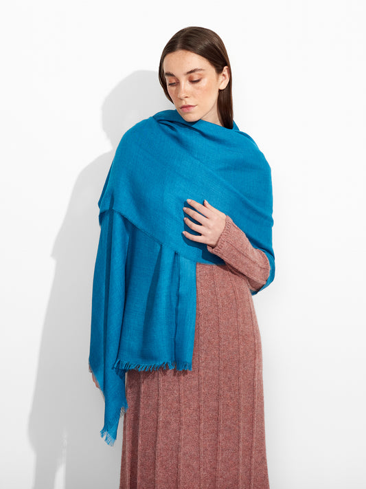 Estola Teaberry en tonalidad turquesa, de color entero, presenta bordes con flecos finos que aportan...