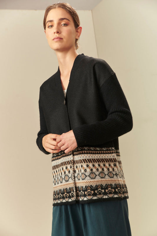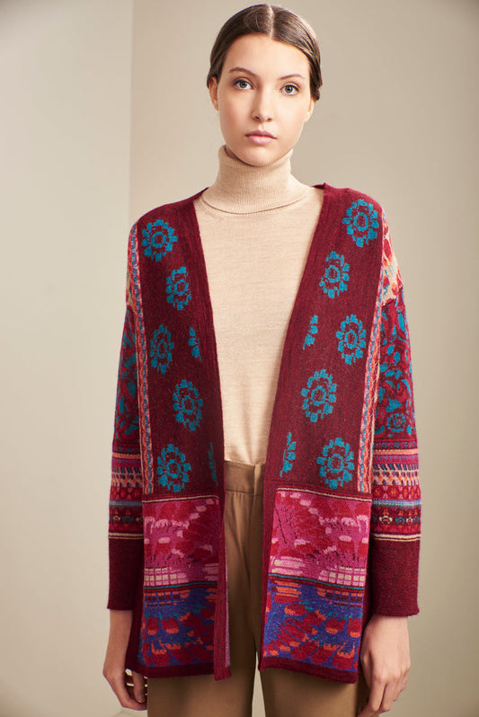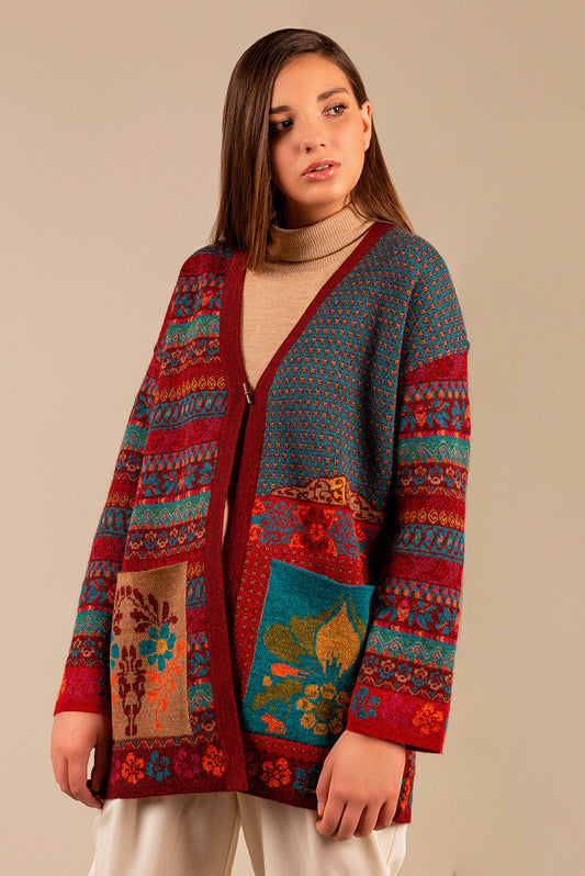 The soft baby alpaca threads of this colourful jacquard cardigan make it the perfect garment...
