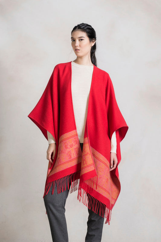 Poncho Chimu 12 en tonalidad rojo, elaborado en 100% Alpaca Royal con técnica Jacquard satín...