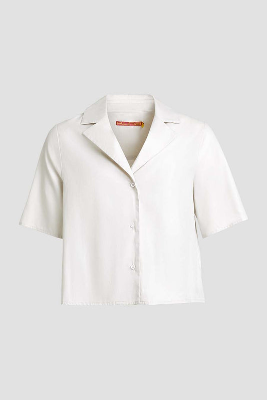 Clásica blusa de manga corta, corte recto, con cuello estilo camisero y escote tipo pico...