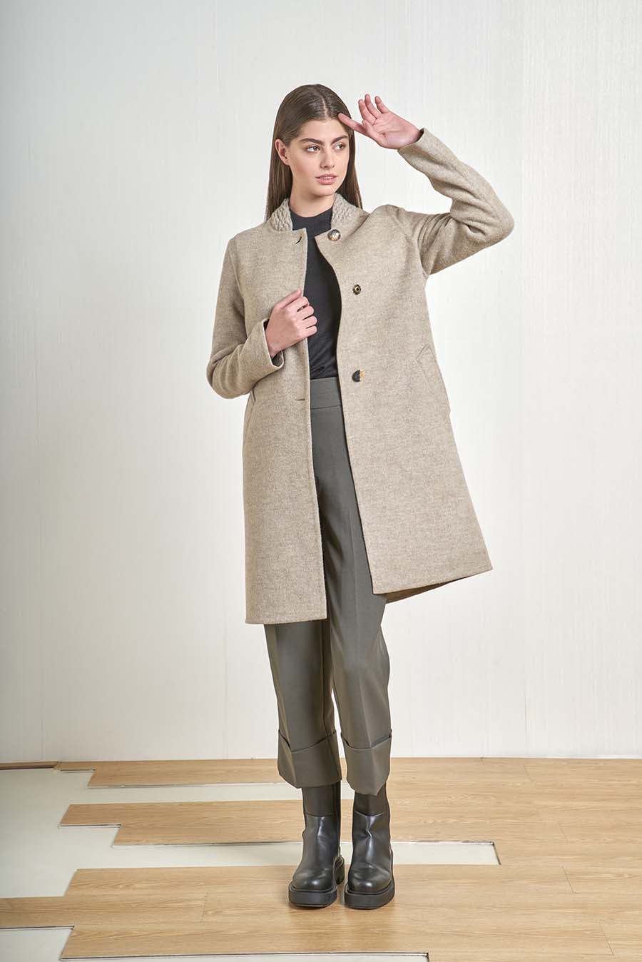 The Vanadis coat is one the most distinguished pieces of our collection. The knitted neck makes it truly cosy, and the button adds the elegant touch.