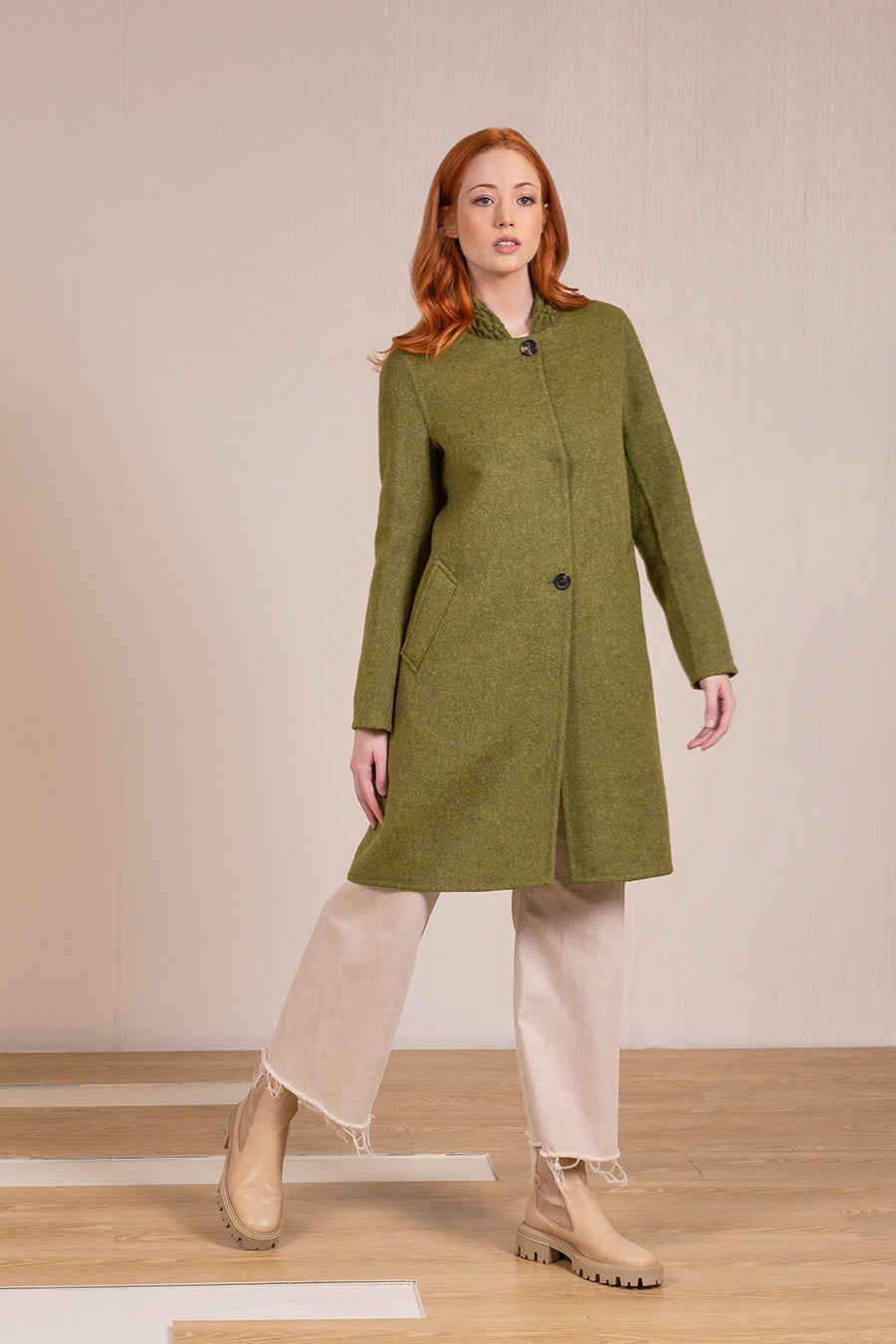 The Vanadis coat is one the most distinguished pieces of our collection. The knitted neck makes it truly cosy, and the button adds the elegant touch.