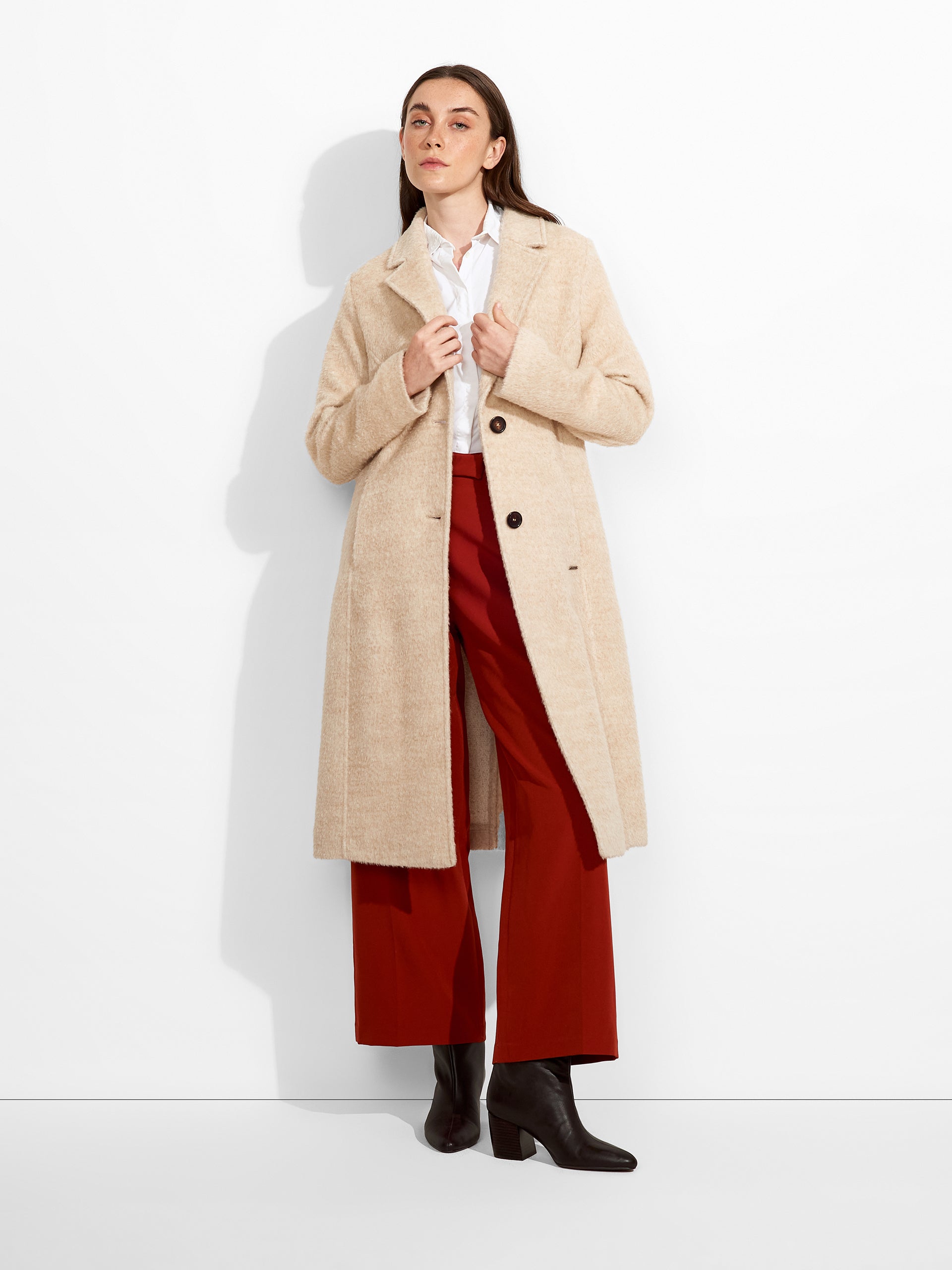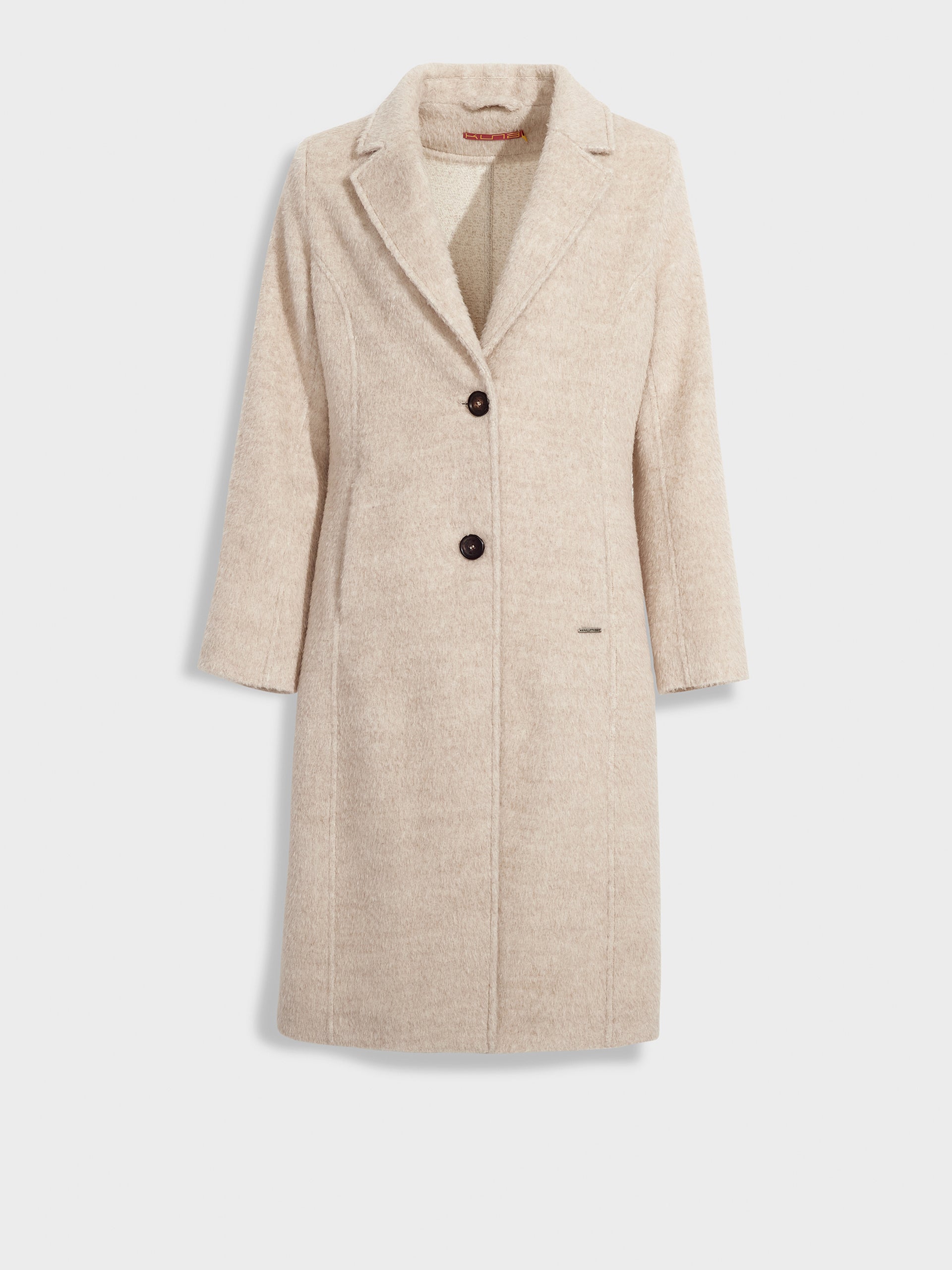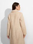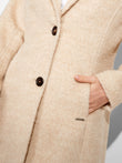 Abrigo Zen en tonalidad beige, de largo clásico y corte princesa que estiliza la silueta. Presenta un diseño semi entallado con botones de cacho visibles. Elaborado en tela eco sin teñir, no lleva forro. Confeccionado en suri alpaca eco y lana eco. | Material predominante: Lana
