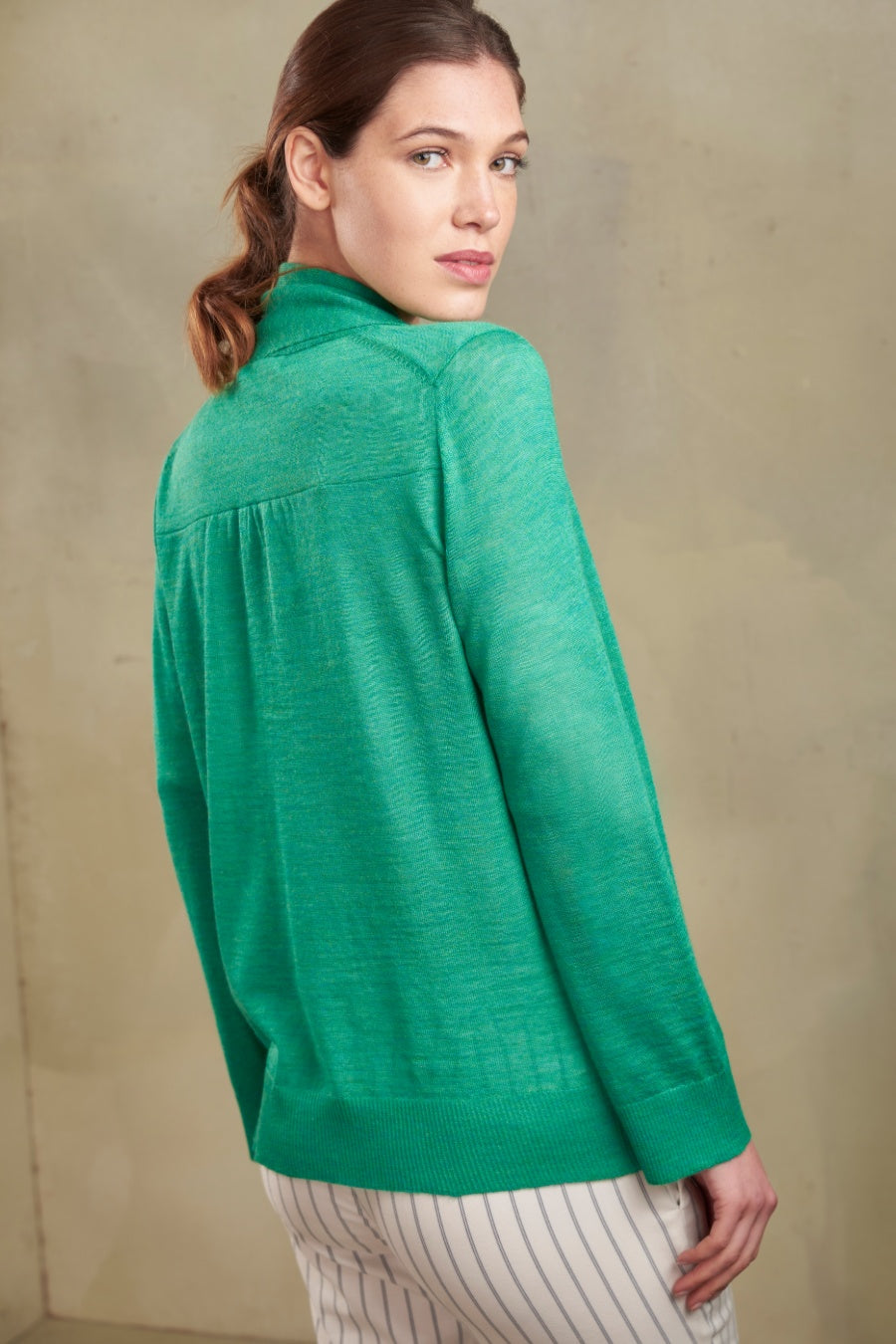 Our Thalassa cardigan, made with baby alpaca fibers and silk, through the versatility in colors and their designs, harmonizes with the rest of your outfit.