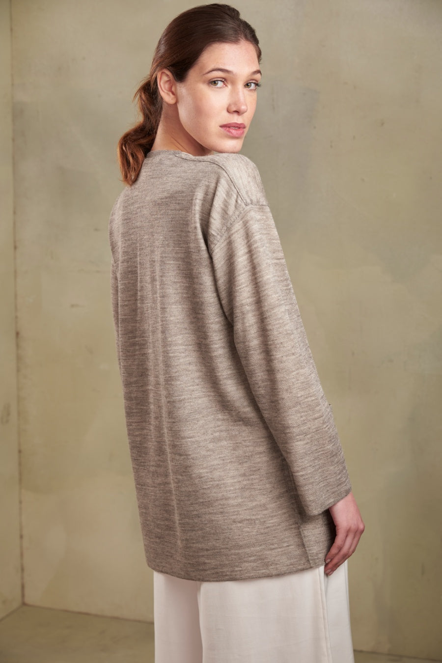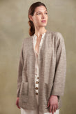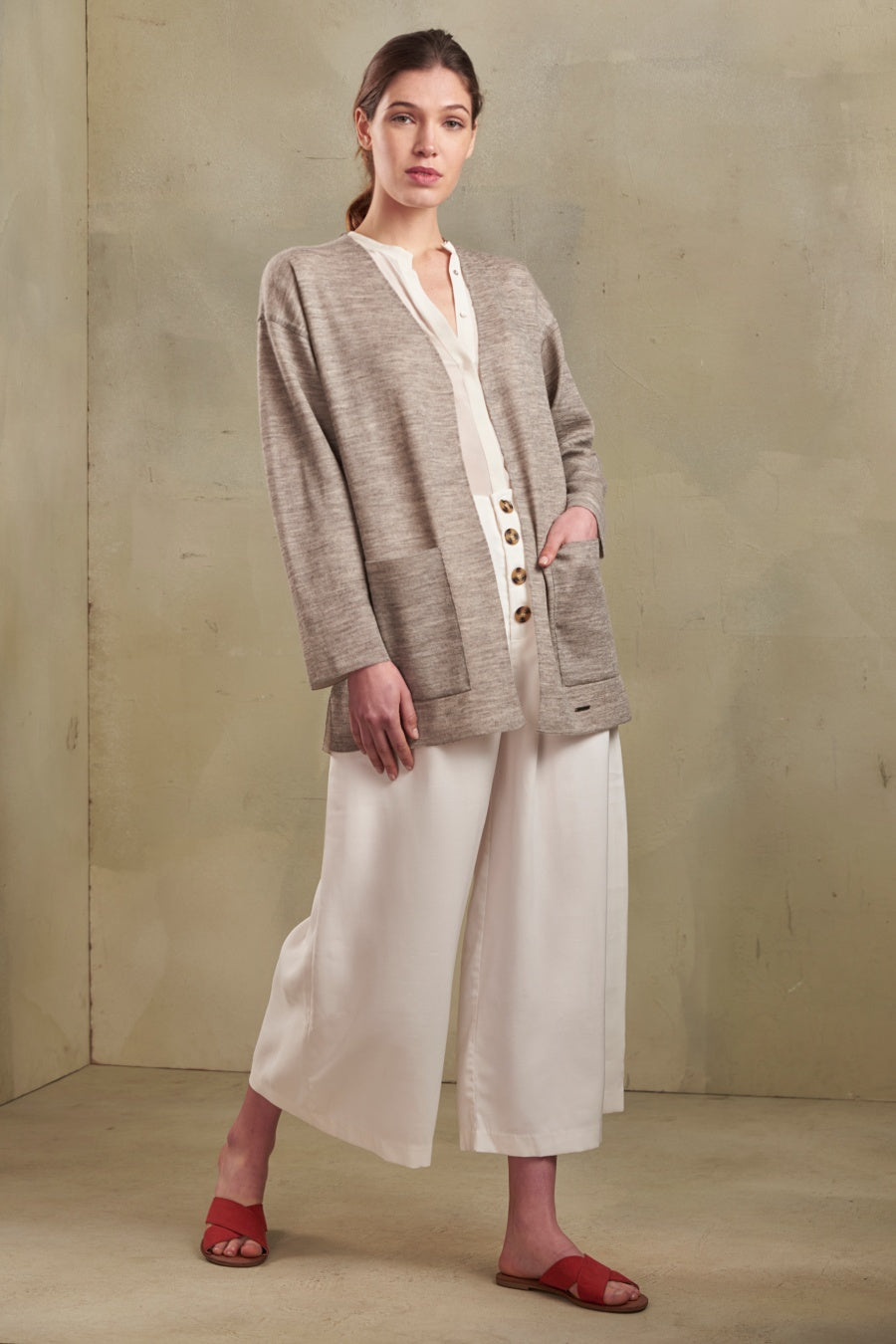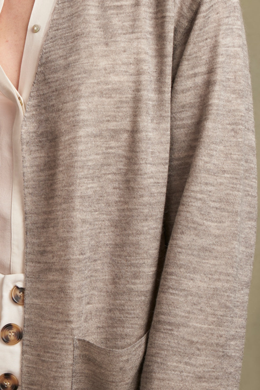Enhance your style with this elegant and sober double-sided cardigan. Versatile long-sleeved piece with wide pockets, made of noble baby alpaca fibers and silk.