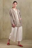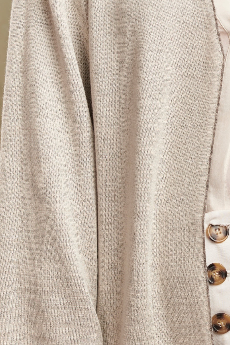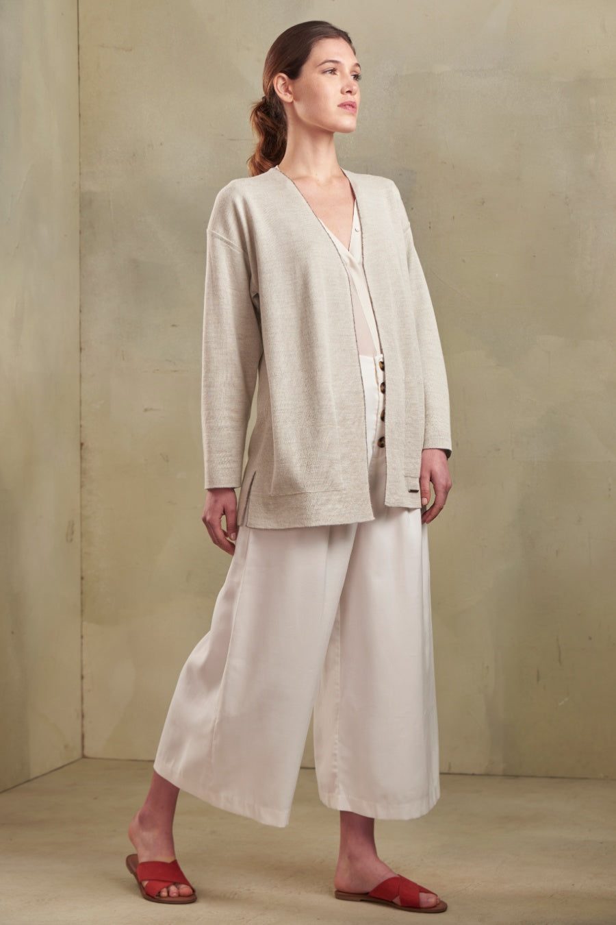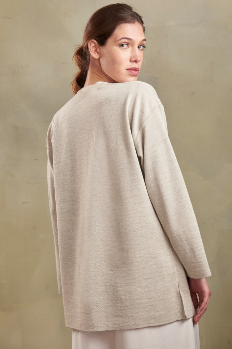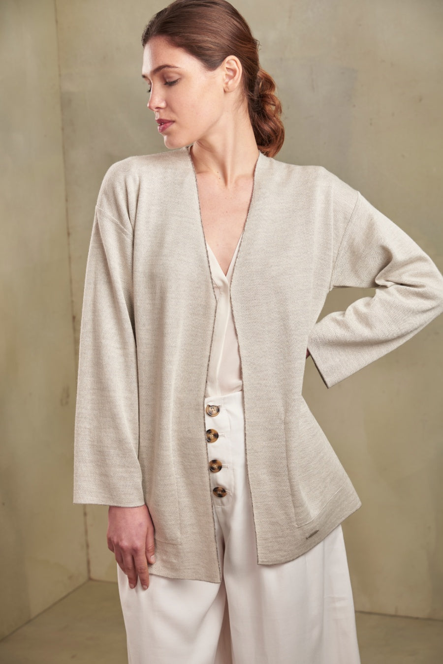 Enhance your style with this elegant and sober double-sided cardigan. Versatile long-sleeved piece with wide pockets, made of noble baby alpaca fibers and silk.