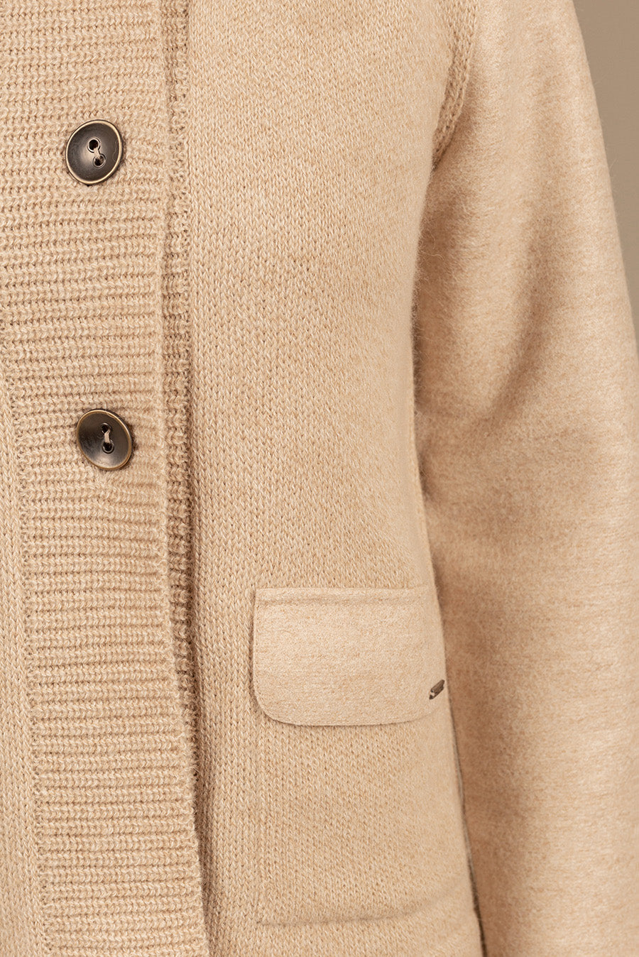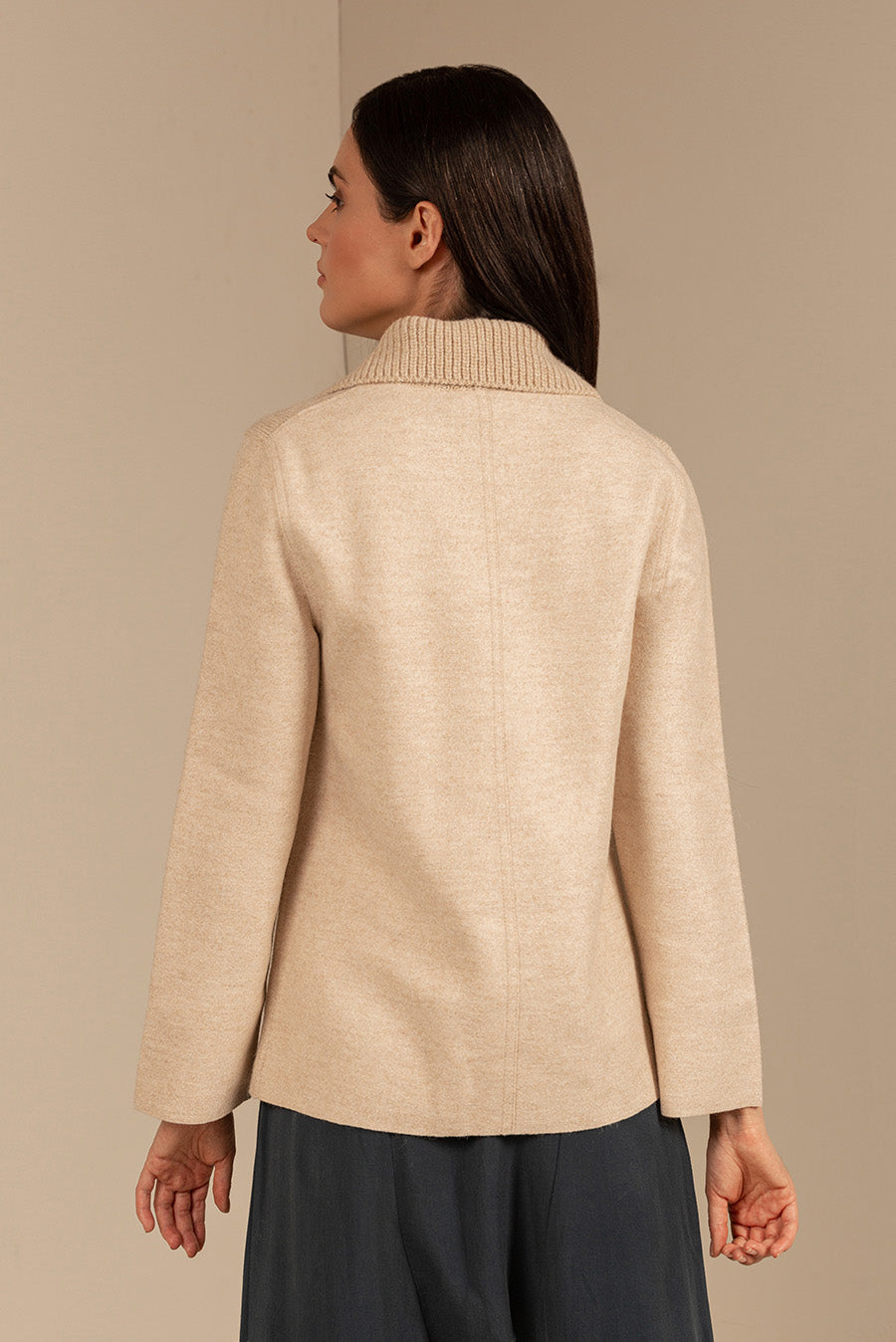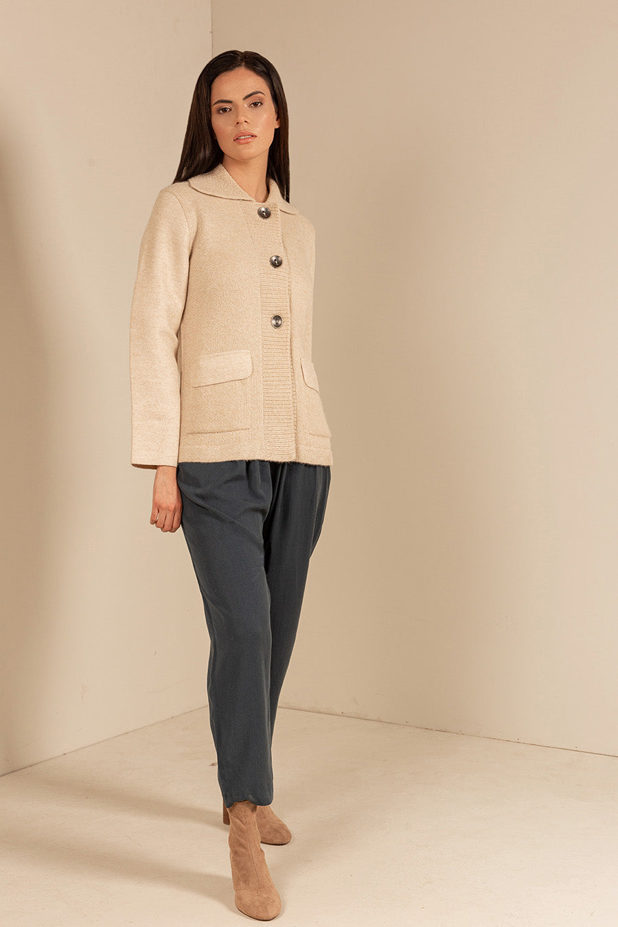 Unico is the perfect example of a coatigan: the combination of a cardigan and a coat. We made ours of felted fabric to add a unique style. The knitted collar, straight cut and bold metallic buttons finish this special piece.
