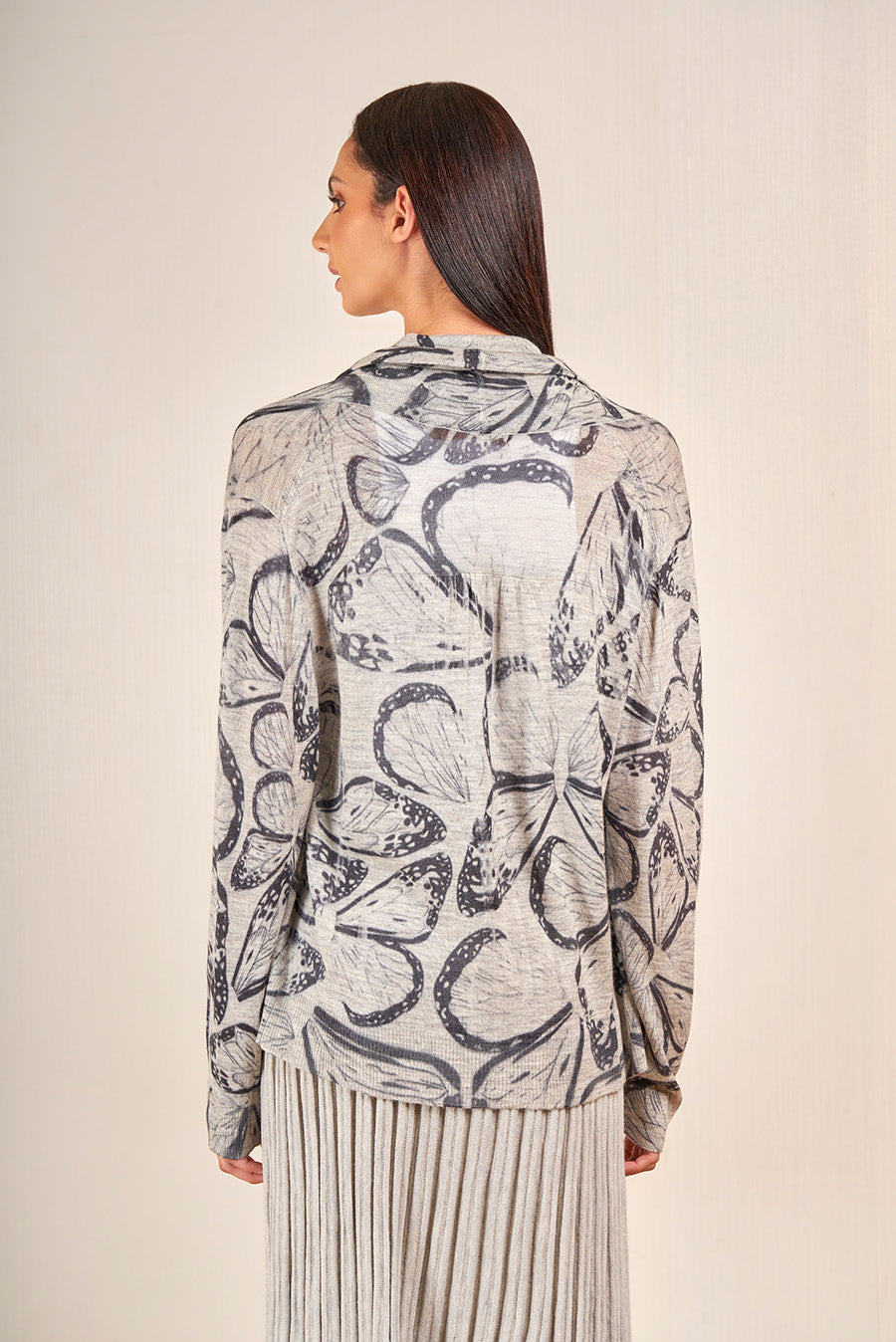 Made of select baby alpaca and silk fibres, our Volar cardigan is beautifully embellished by butterfly wings in cool colours.
