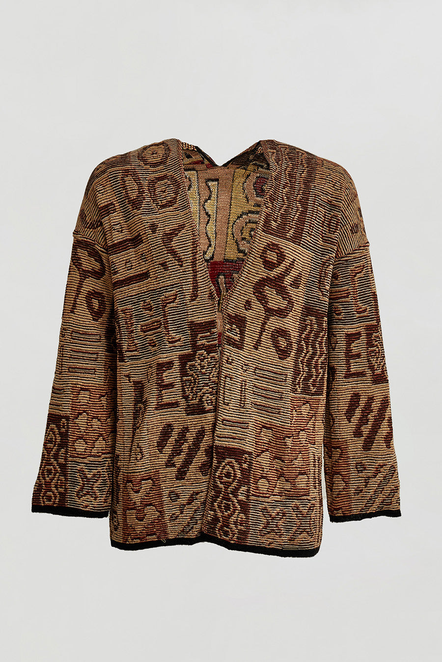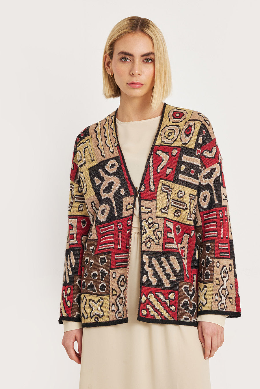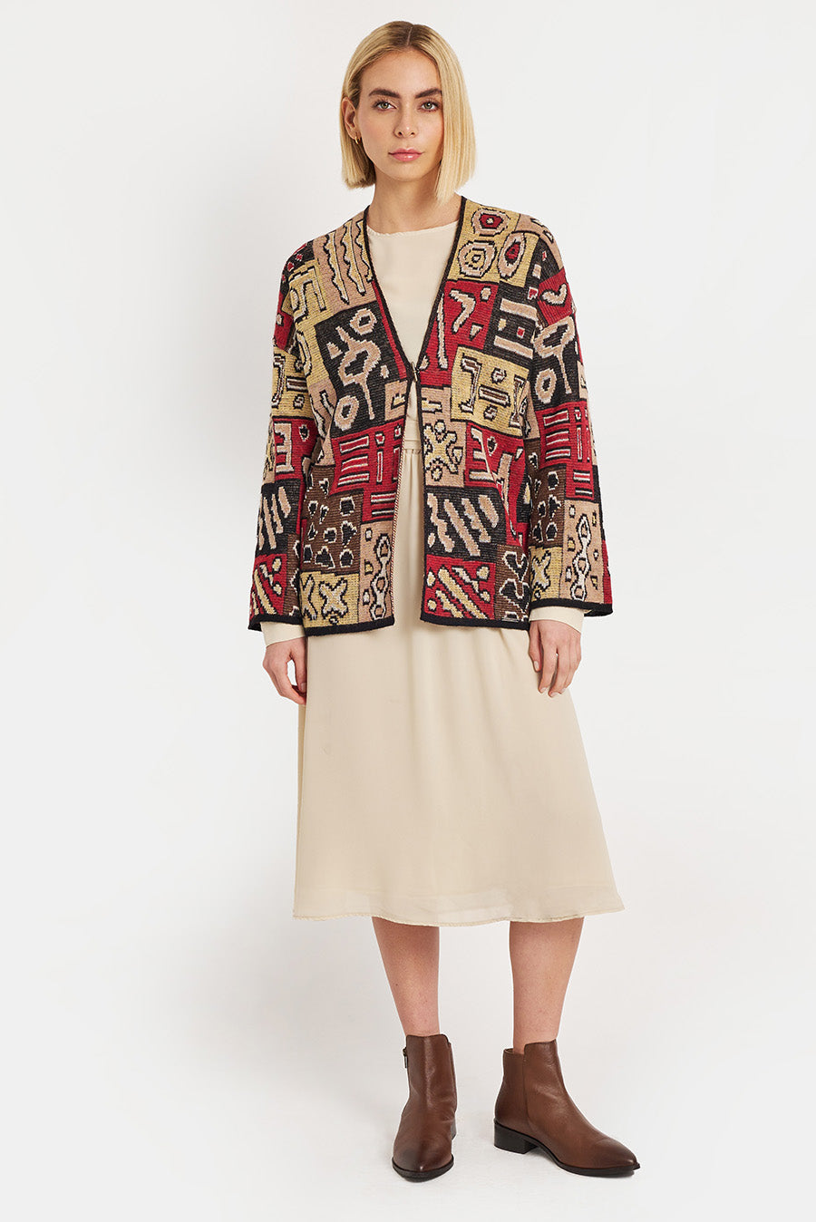 Our reversible Winika cardigan is one of the most representative pieces of this collection. Inspired by Afro Peruvian shapes and colours, this unique piece will make you stand out.