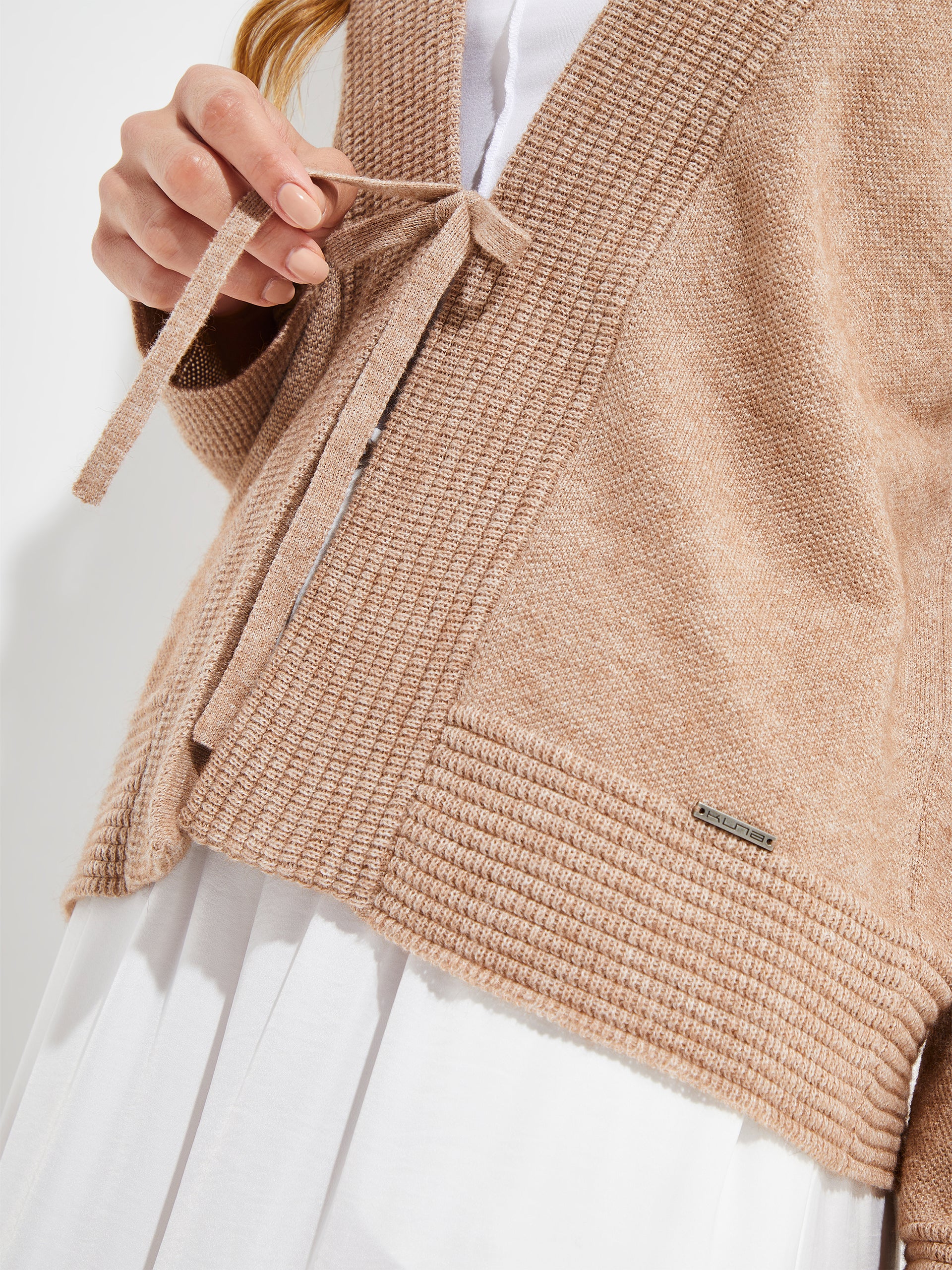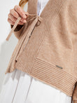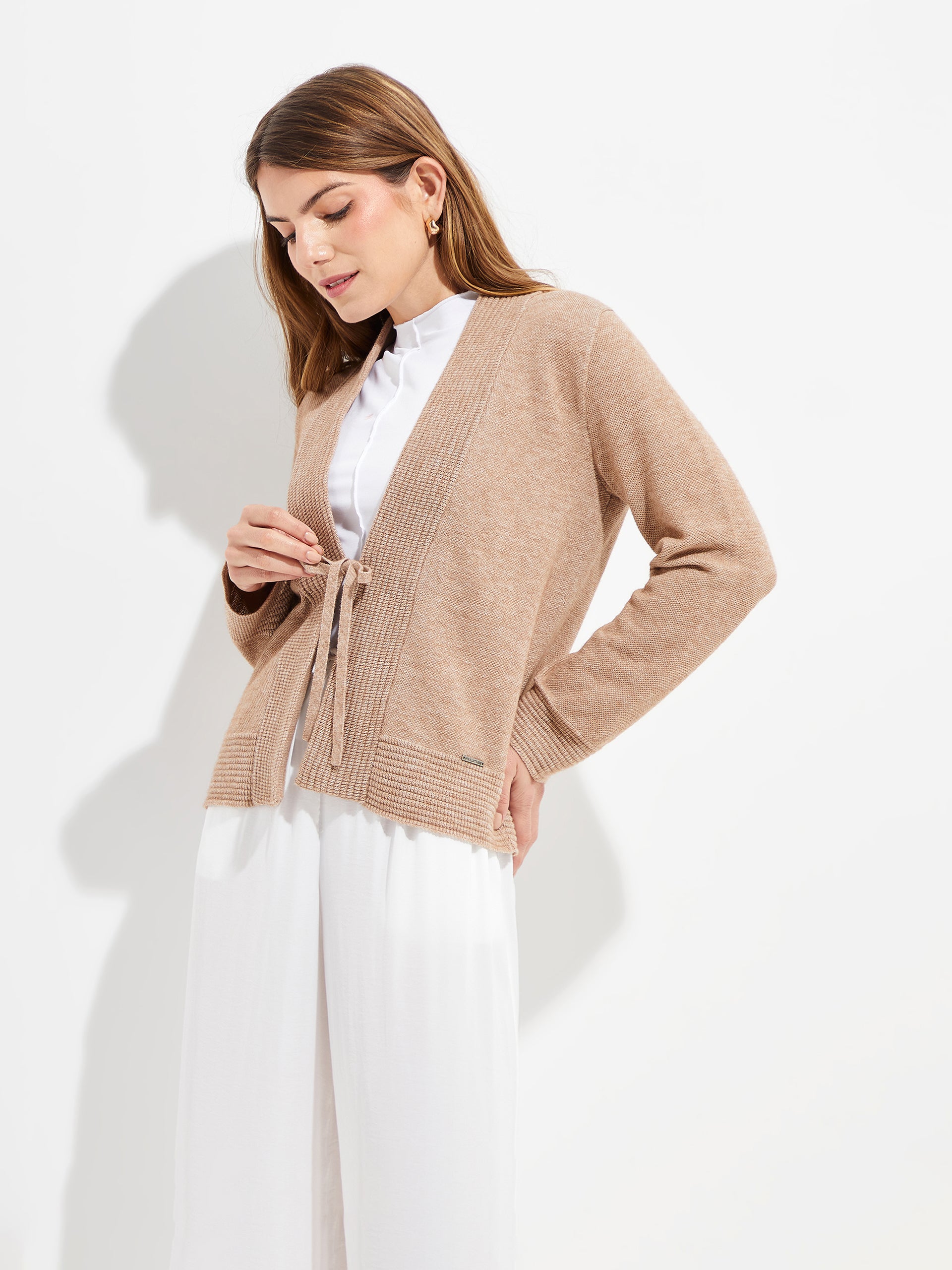 El cárdigan Yalika, disponible en dos colores característicos de la colección, esta elaborado con una mezcla de algodón orgánico y baby alpaca. Presenta detalles en las pretinas y el cuello con una combinación de puntos de medio inglés reverso y jersey. Además, cuenta con dos lazos tejidos en la parte central, añadiendo un toque distintivo. | Material predominante: Algodon