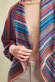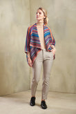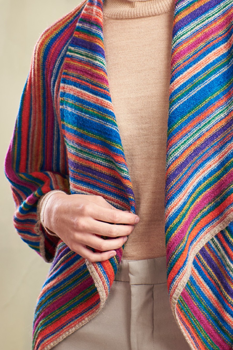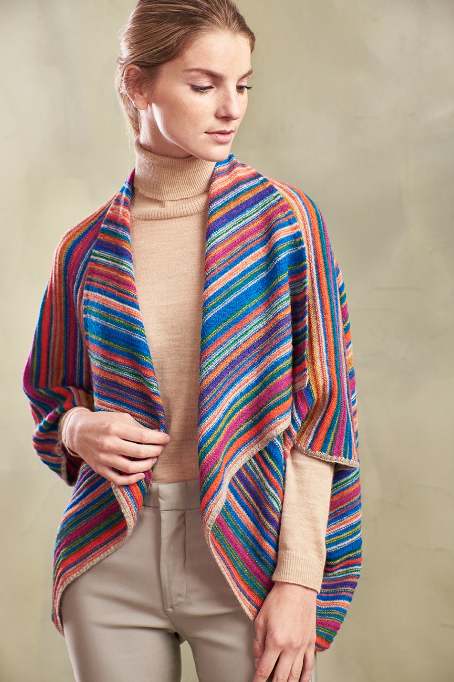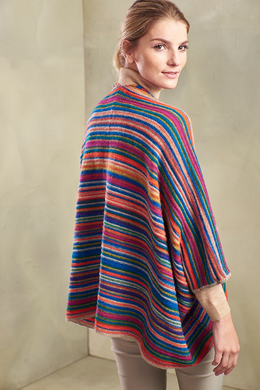 Our baby alpaca Random poncho, with its cleverly combined colours, features an excellent drop with an opening.