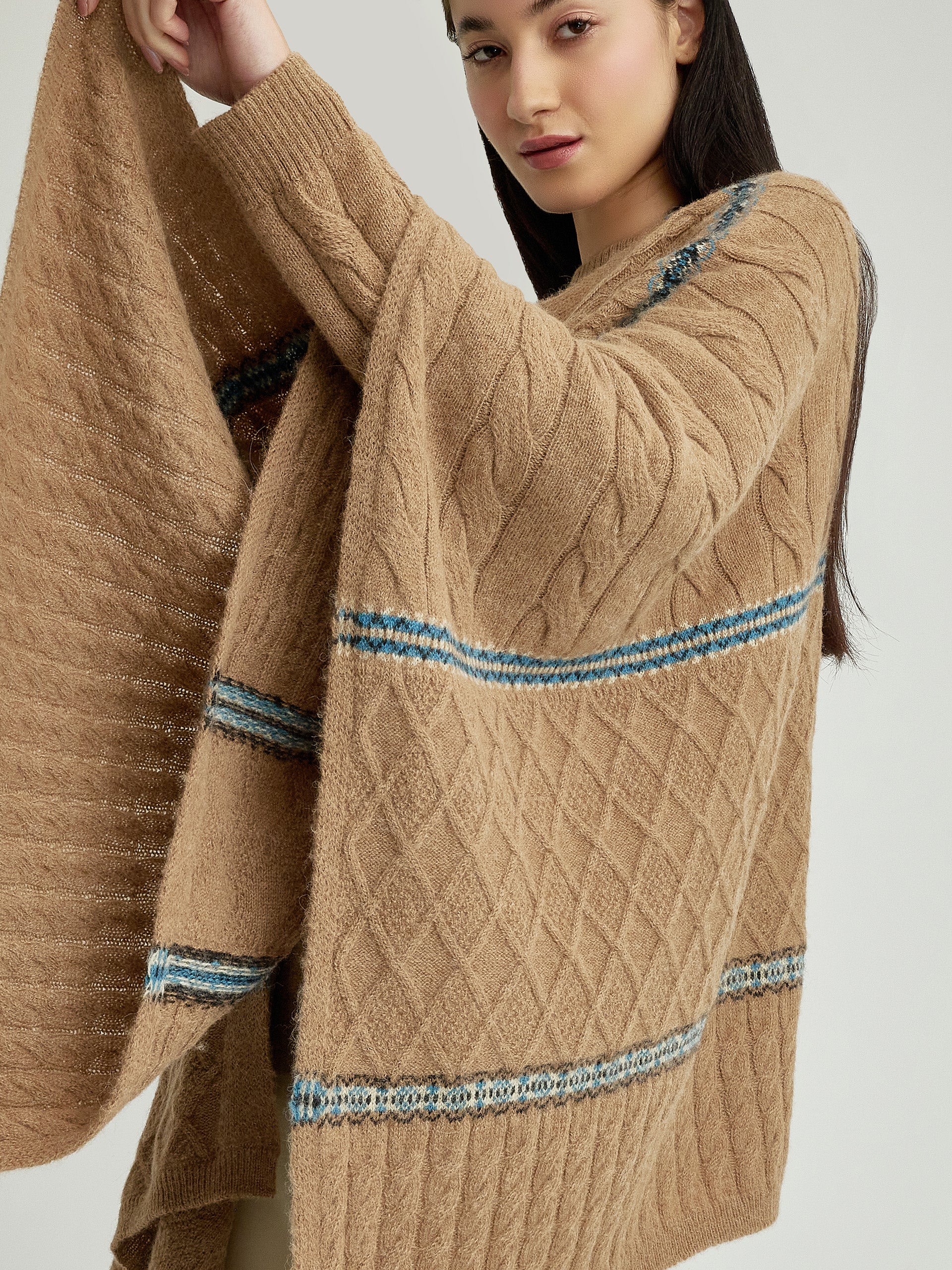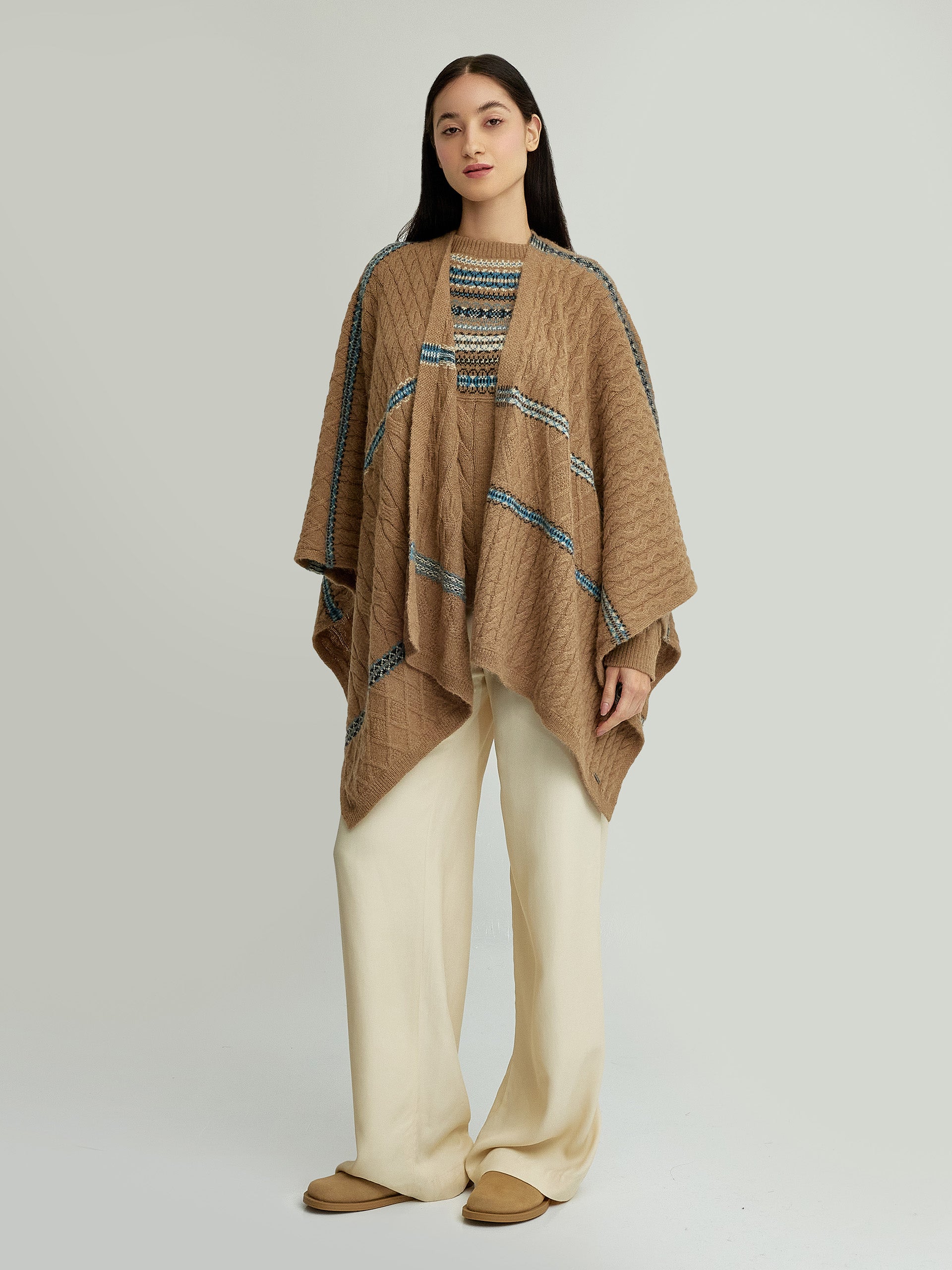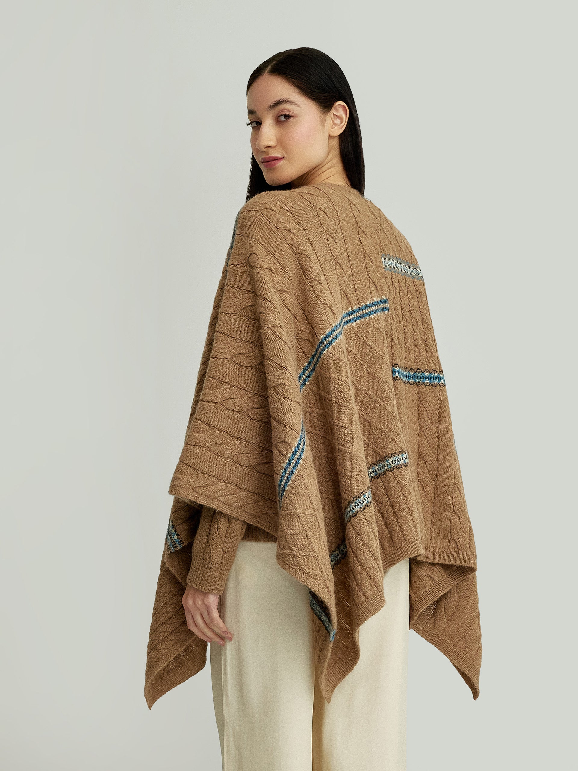 La capa Yael, confeccionada en suave baby alpaca, es una obra maestra de estilo y confort. Su diseño trenzado en color natural, realzado con detalles de colores, añade un toque de sofisticación y originalidad a cualquier conjunto. Es la pieza perfecta para lucir con elegancia durante los días más fríos del año. | Material predominante: Baby Alpaca
