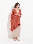 Capa Zareli en tonalidad naranja, confeccionada en baby alpaca y seda. Es una capa doble faz con diseño jacquard a tres colores, que combina calidez, textura y elegancia atemporal. | Material predominante: Baby Alpaca