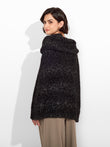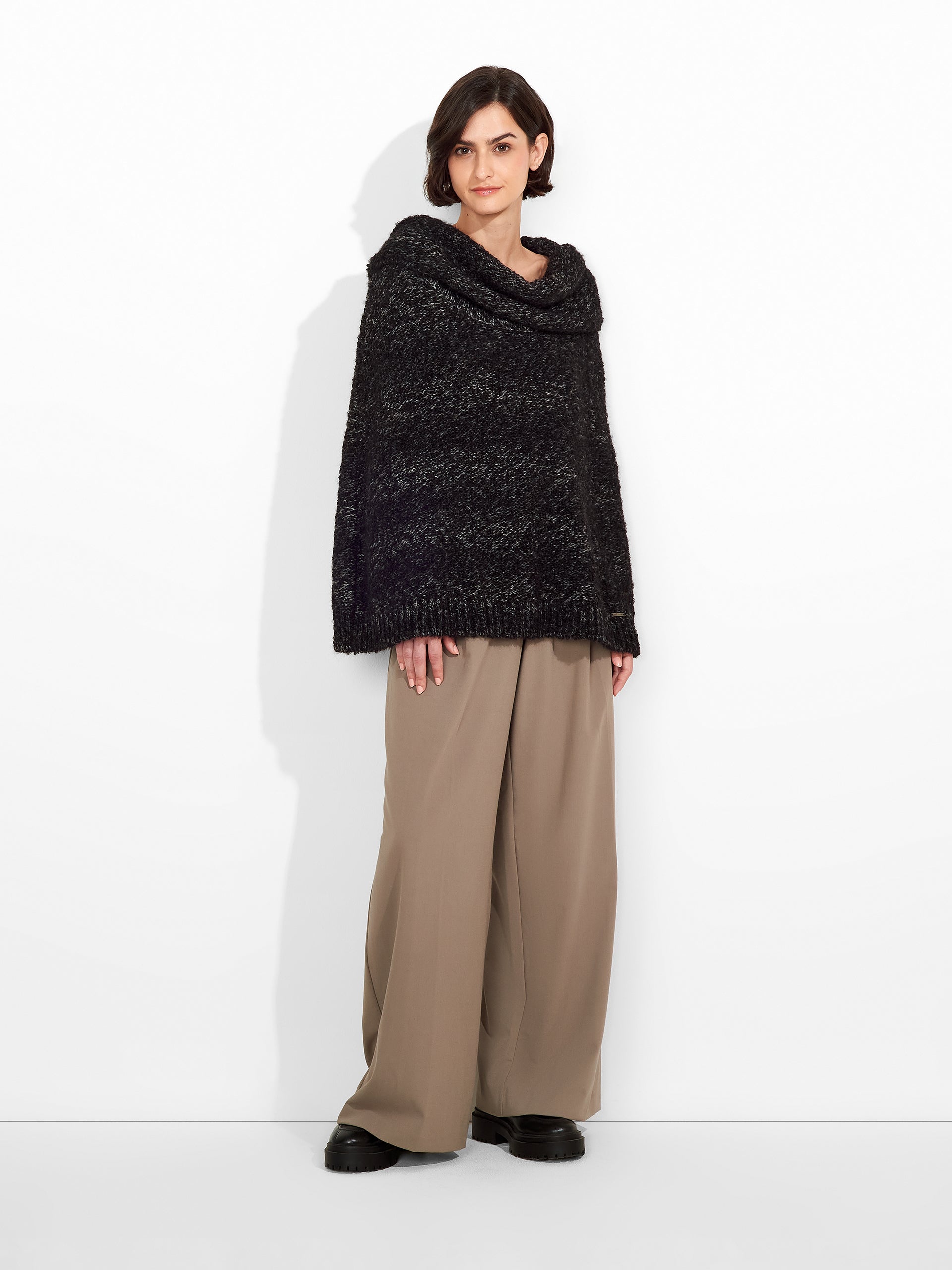 Poncho Zaira en tonalidad negro, de silueta amplia y diseño abierto que se adapta al cuerpo. Presenta un acabado ligero y textura suave. Confeccionado en una mezcla de suri alpaca, baby alpaca y lana, brinda calidez y comodidad. | Material predominante: Suri Alpaca