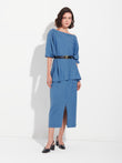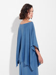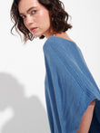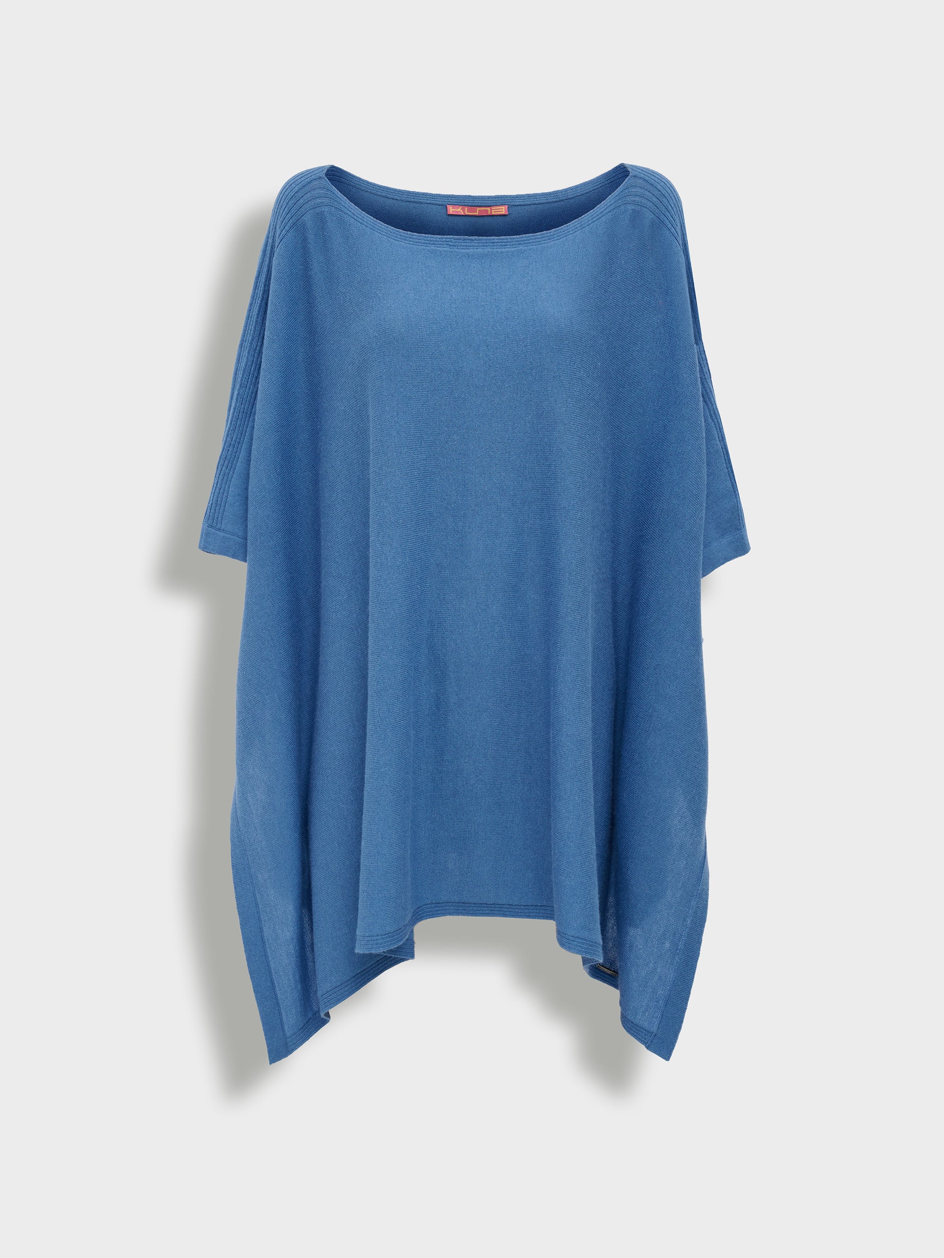 Poncho Zarah en tonalidad azul, confeccionado en algodón orgánico y baby alpaca. Es un poncho cerrado de punto llano, ligero y suave, ideal para un estilo relajado y contemporáneo. | Material predominante: Algodon
