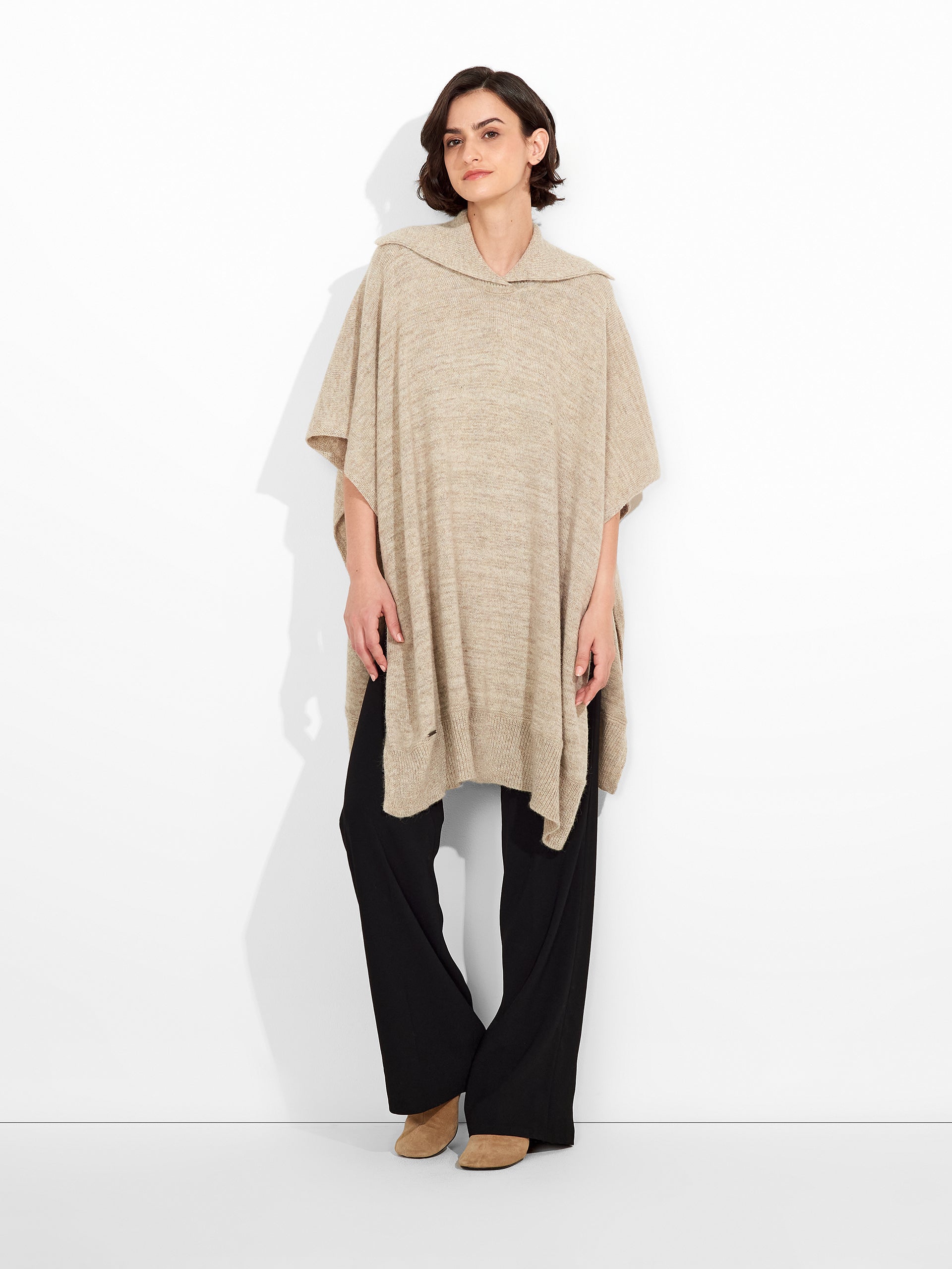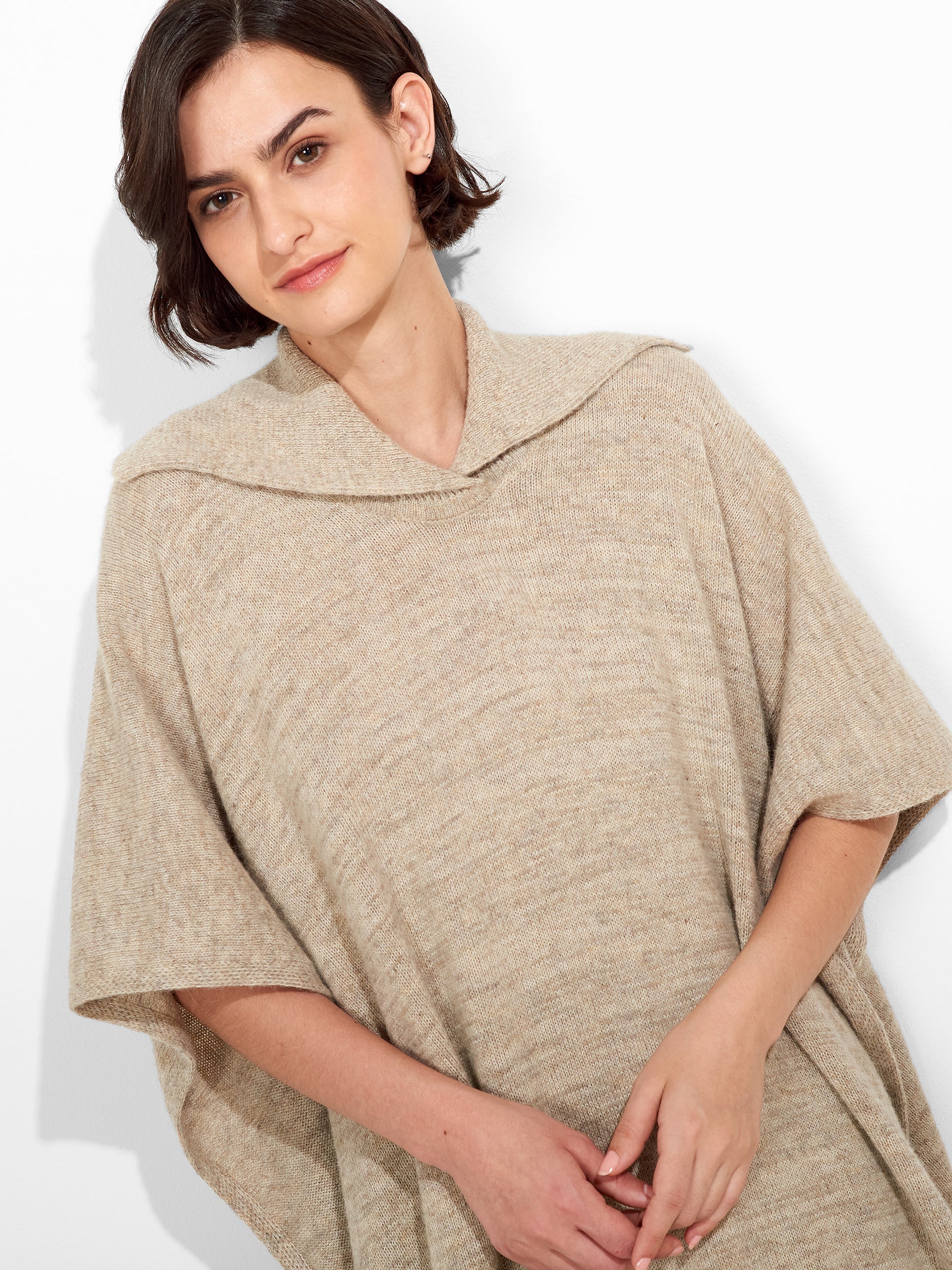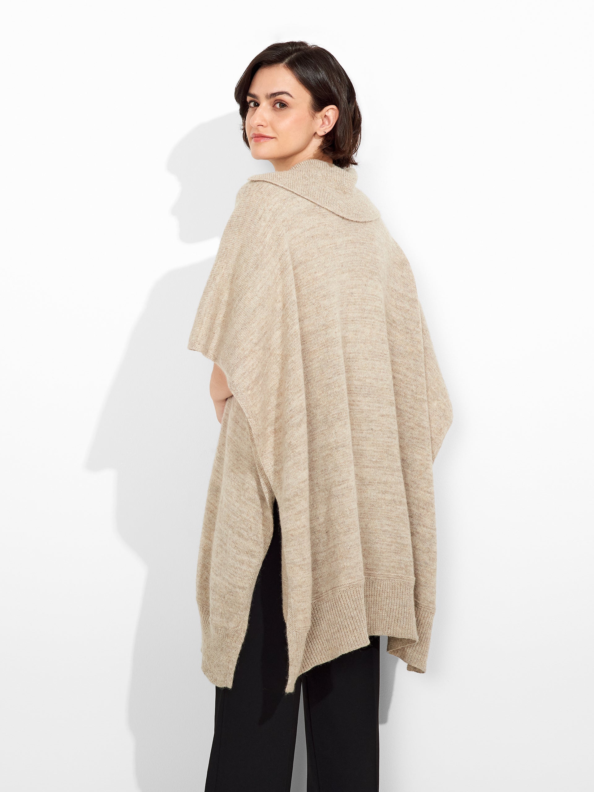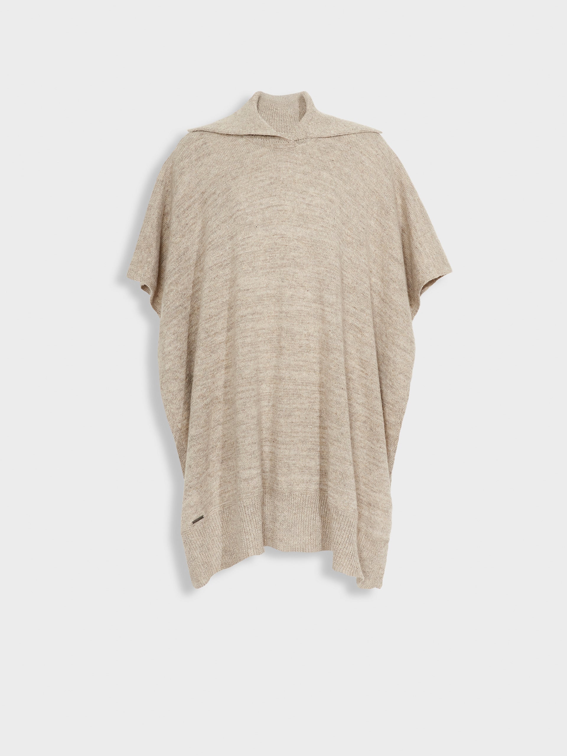 Poncho Zoila en tonalidad beige, presenta una silueta amplia y diseño abierto en color entero. Confeccionado en baby alpaca, brinda calidez y suavidad. | Material predominante: Baby Alpaca
