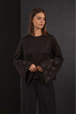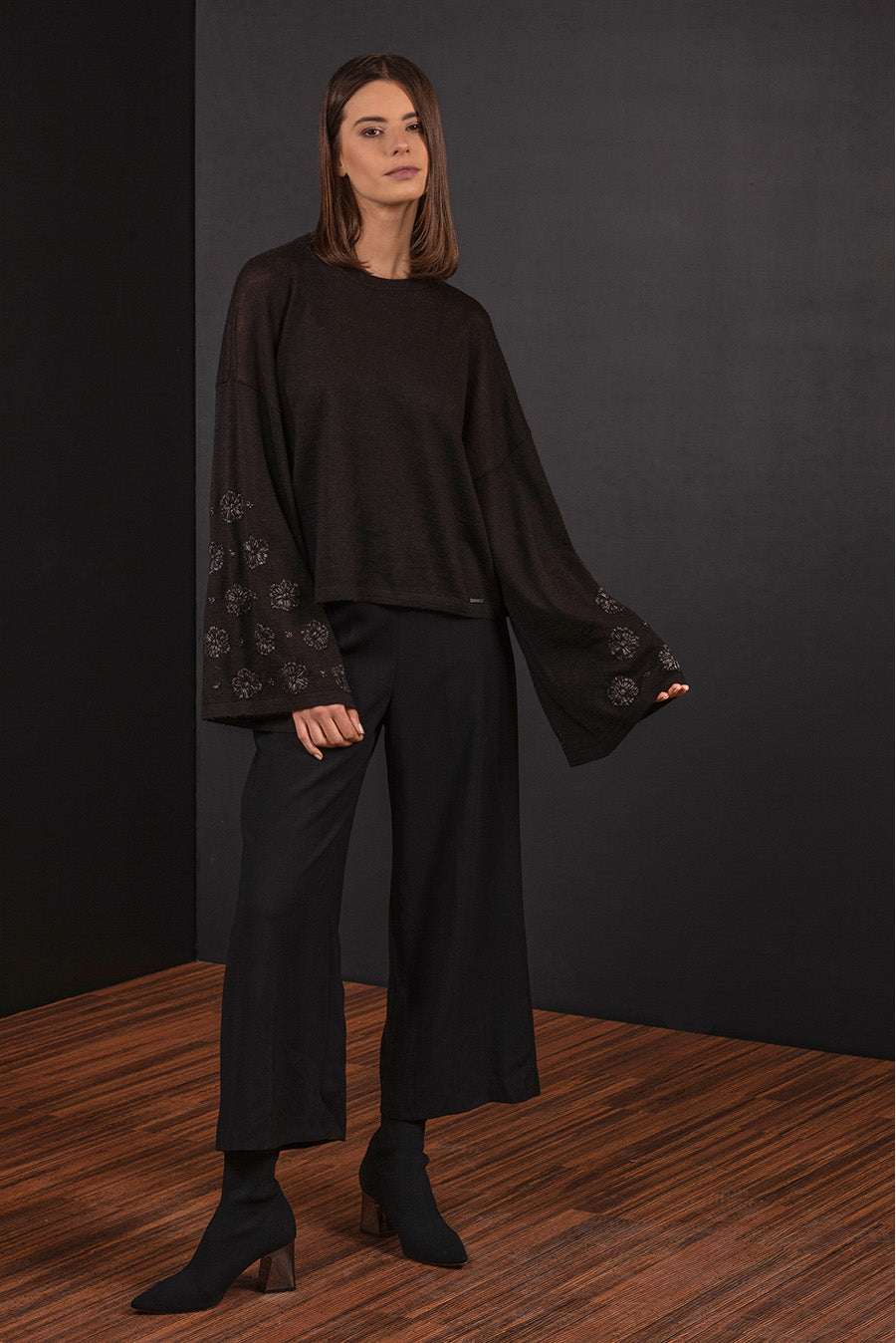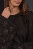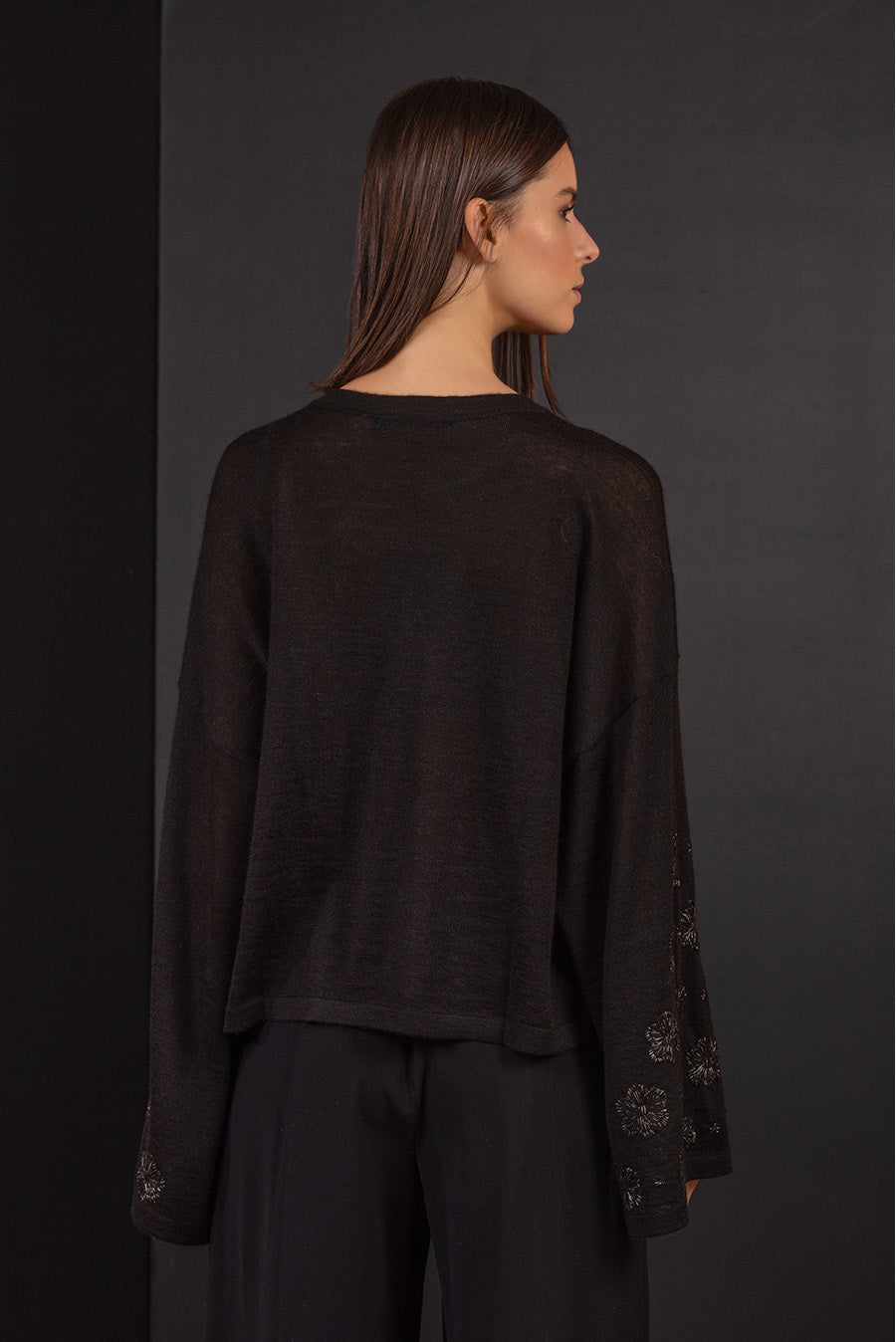 Our Baku sweater features a round neck and oversized sleeves. Handcrafted floral motifs in lurex embellish this unique piece, part of our Black Alpaka collection