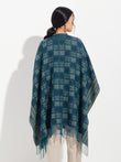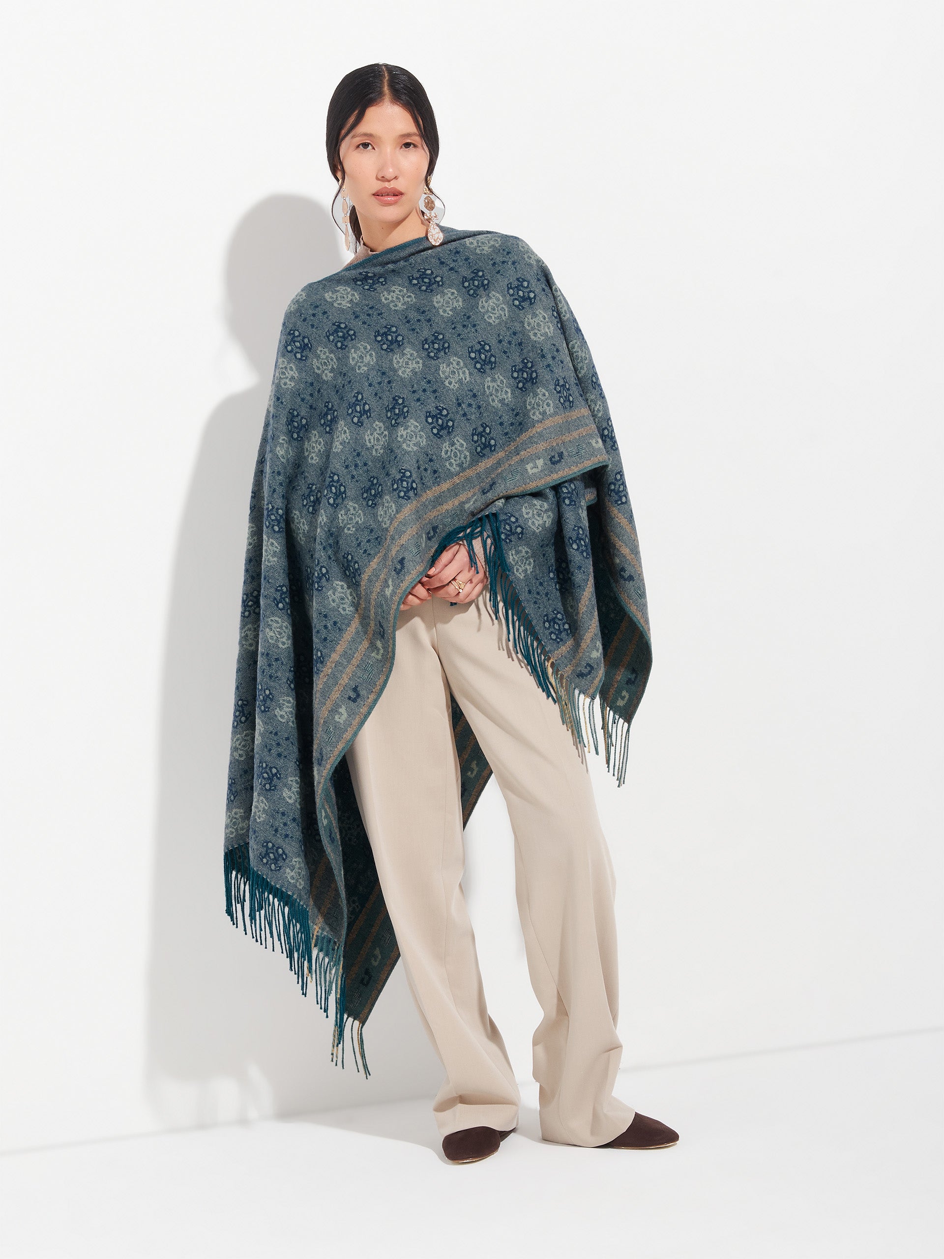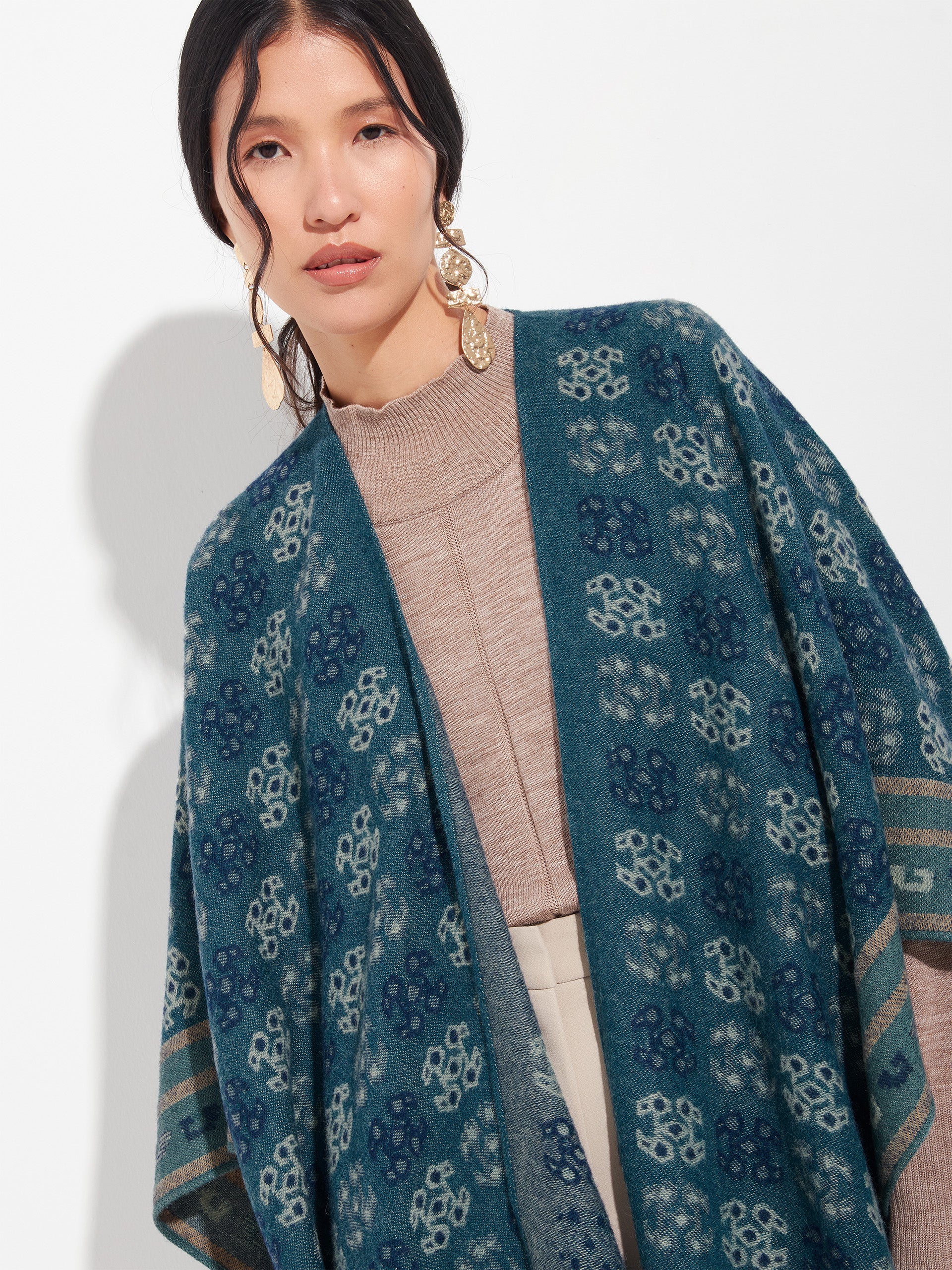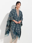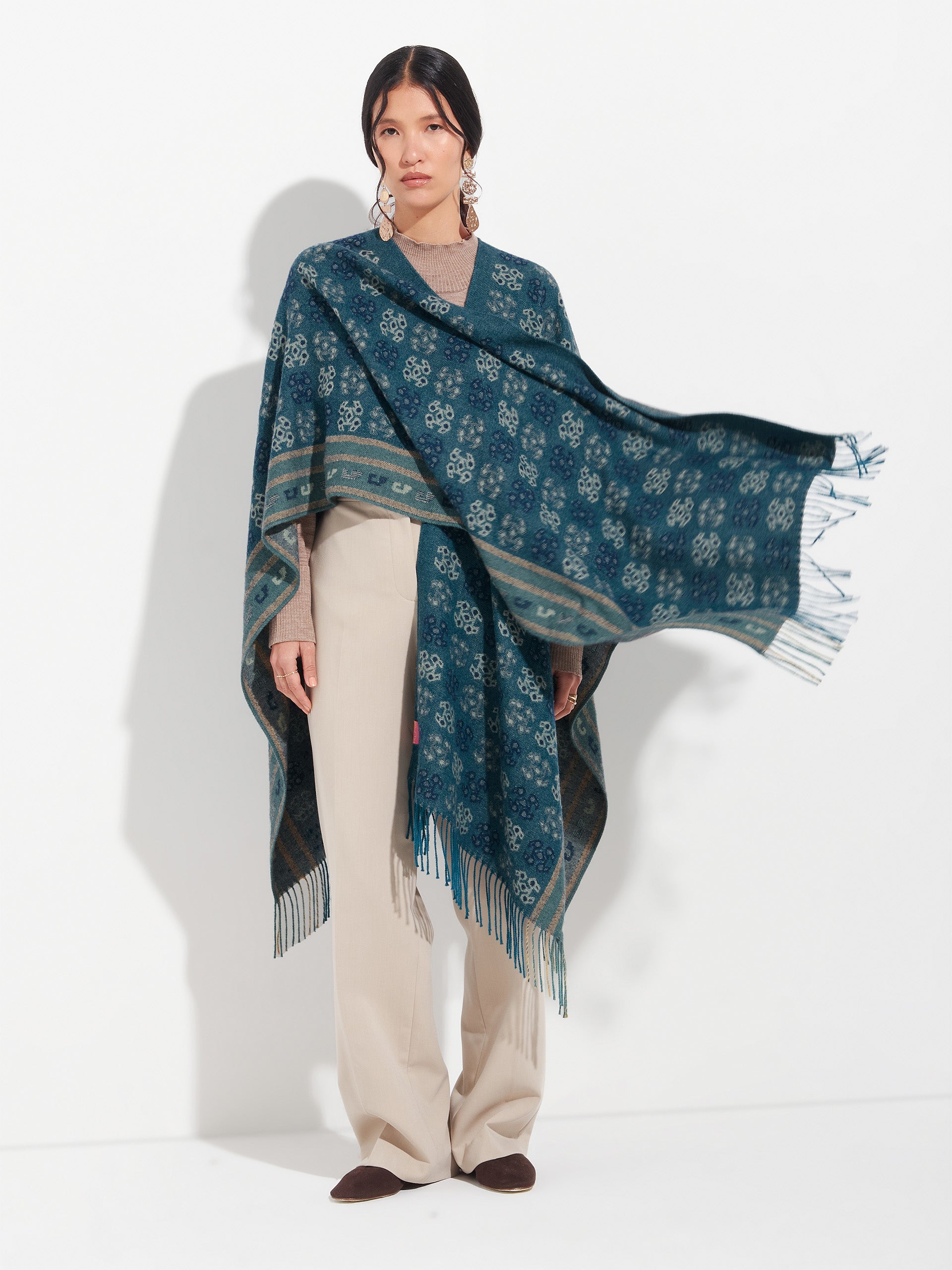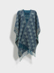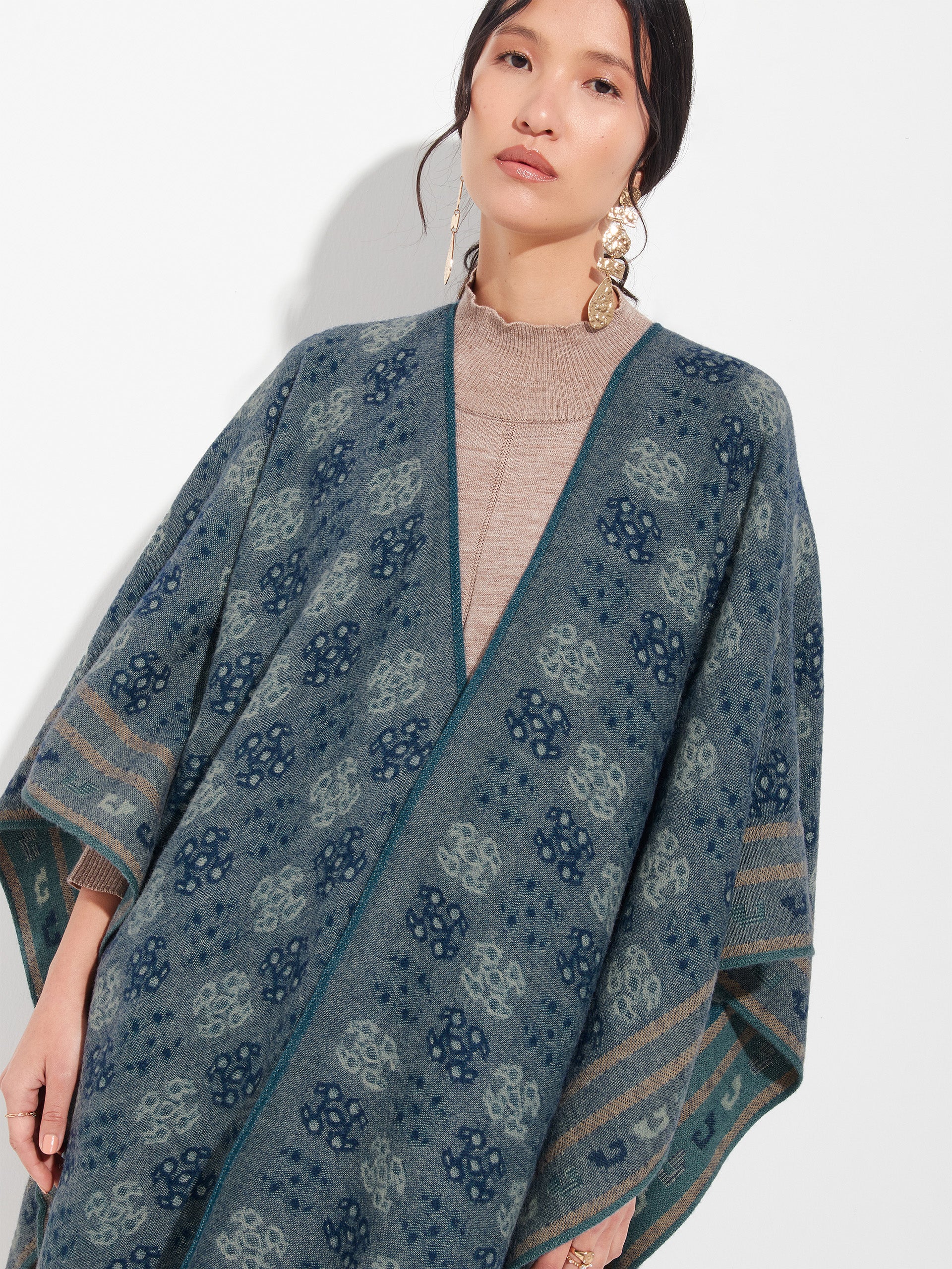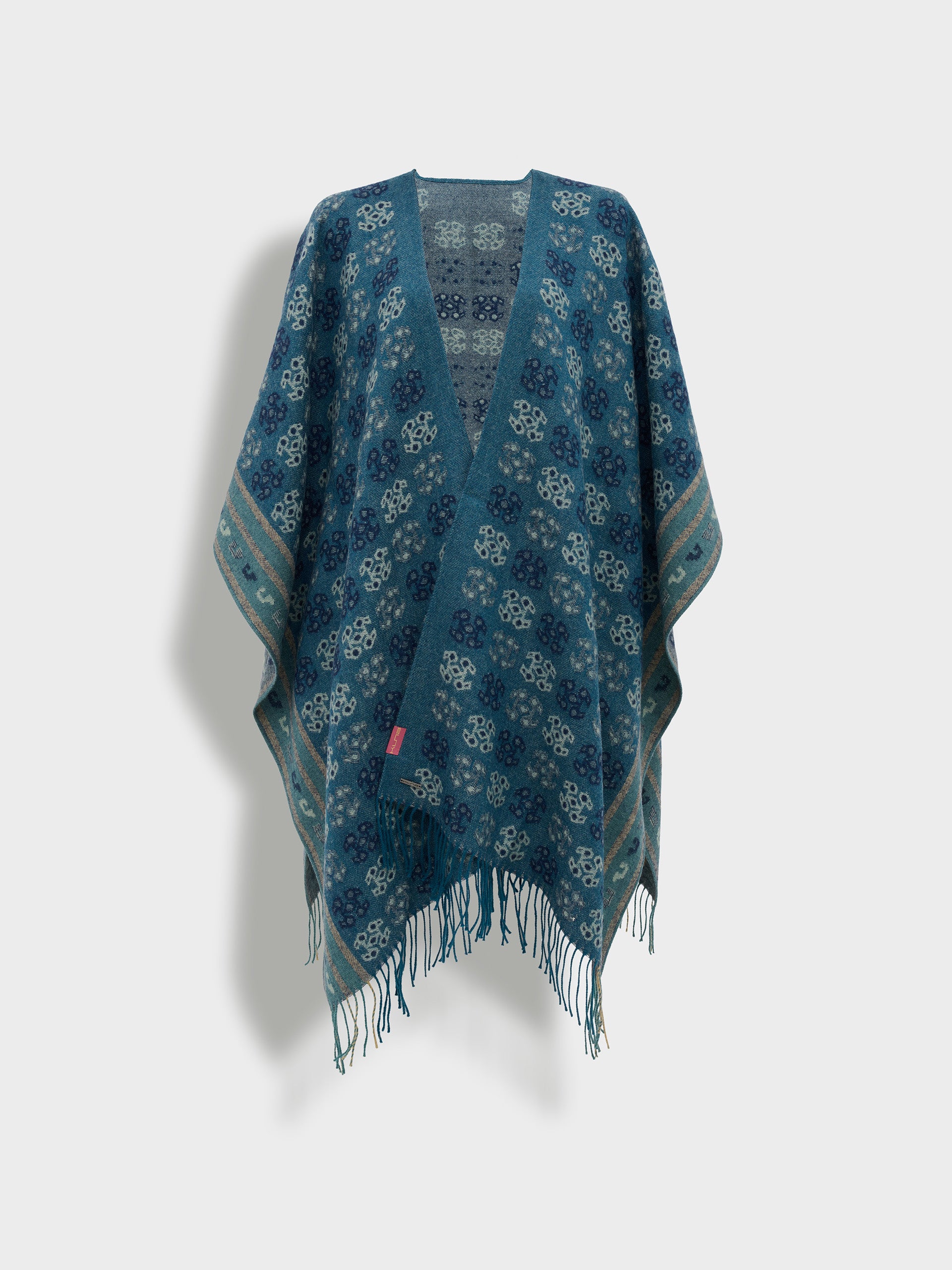 Poncho Chancay 35 en tonalidad azul, elaborado en 100% baby alpaca con técnica Jacquard en doble cara. Es una prenda reversible, inspirada en la Cultura Chancay, que mantiene viva la tradición ancestral en un diseño representativo de la identidad cultural. | Material predominante: Baby Alpaca