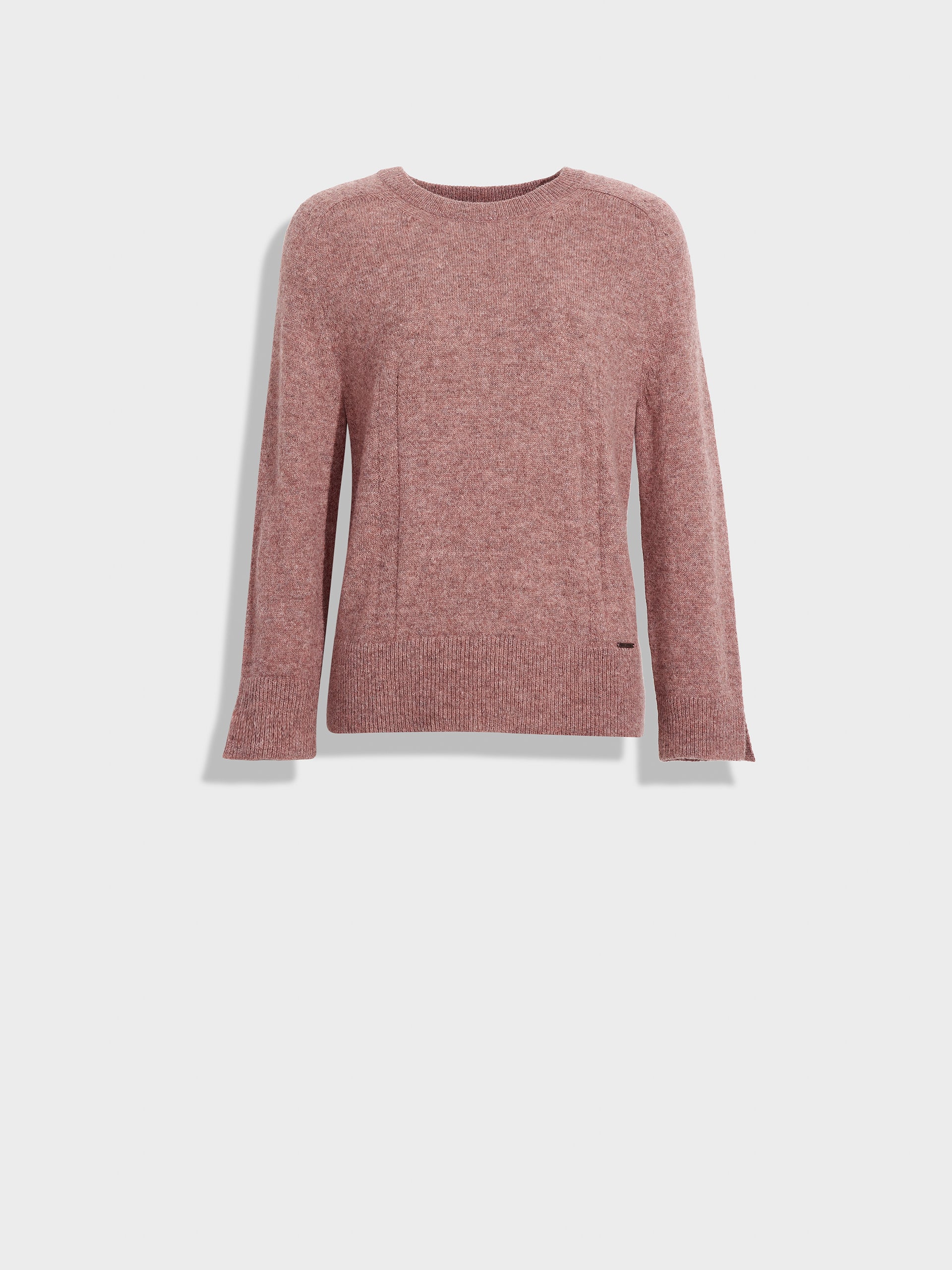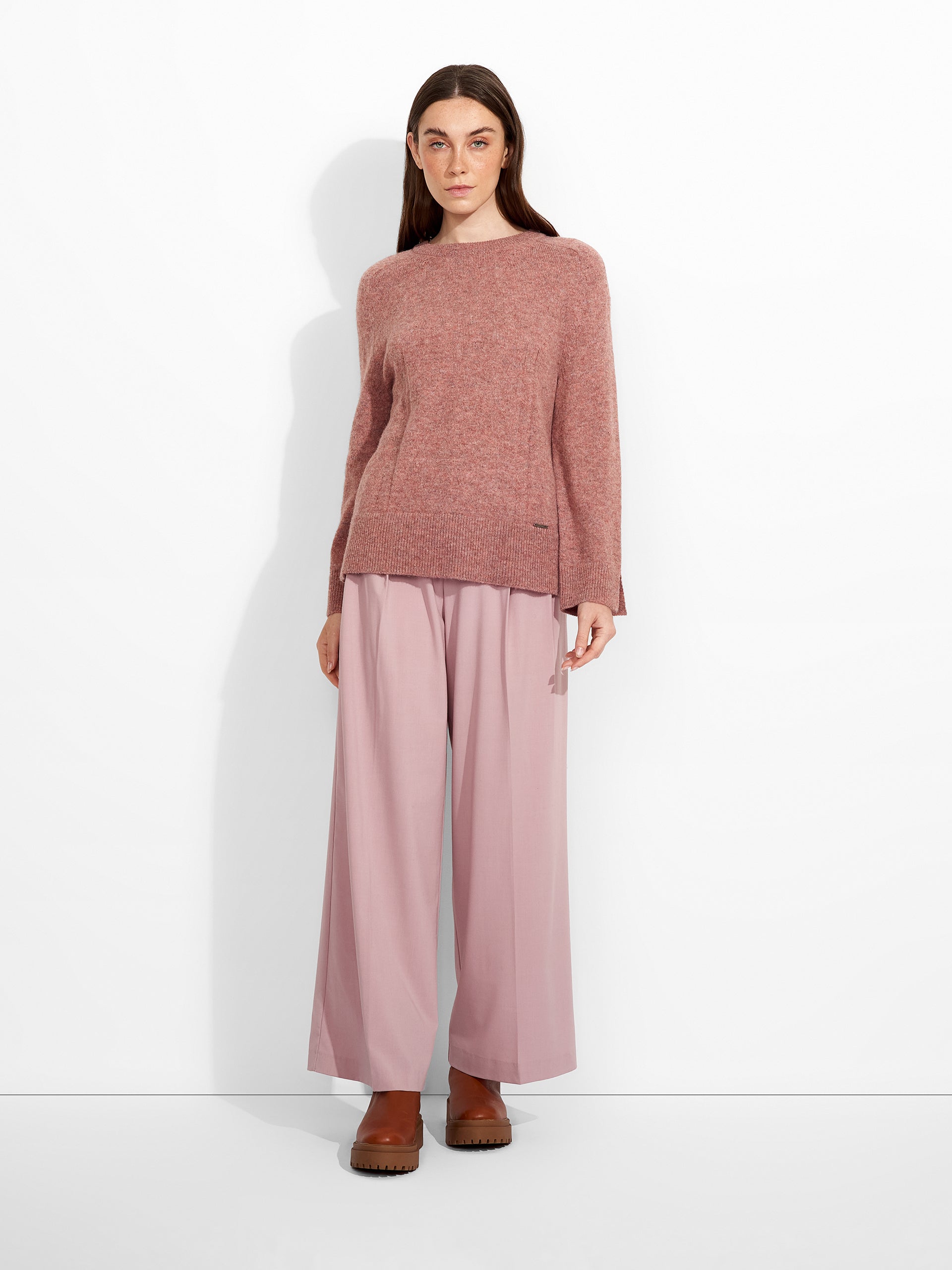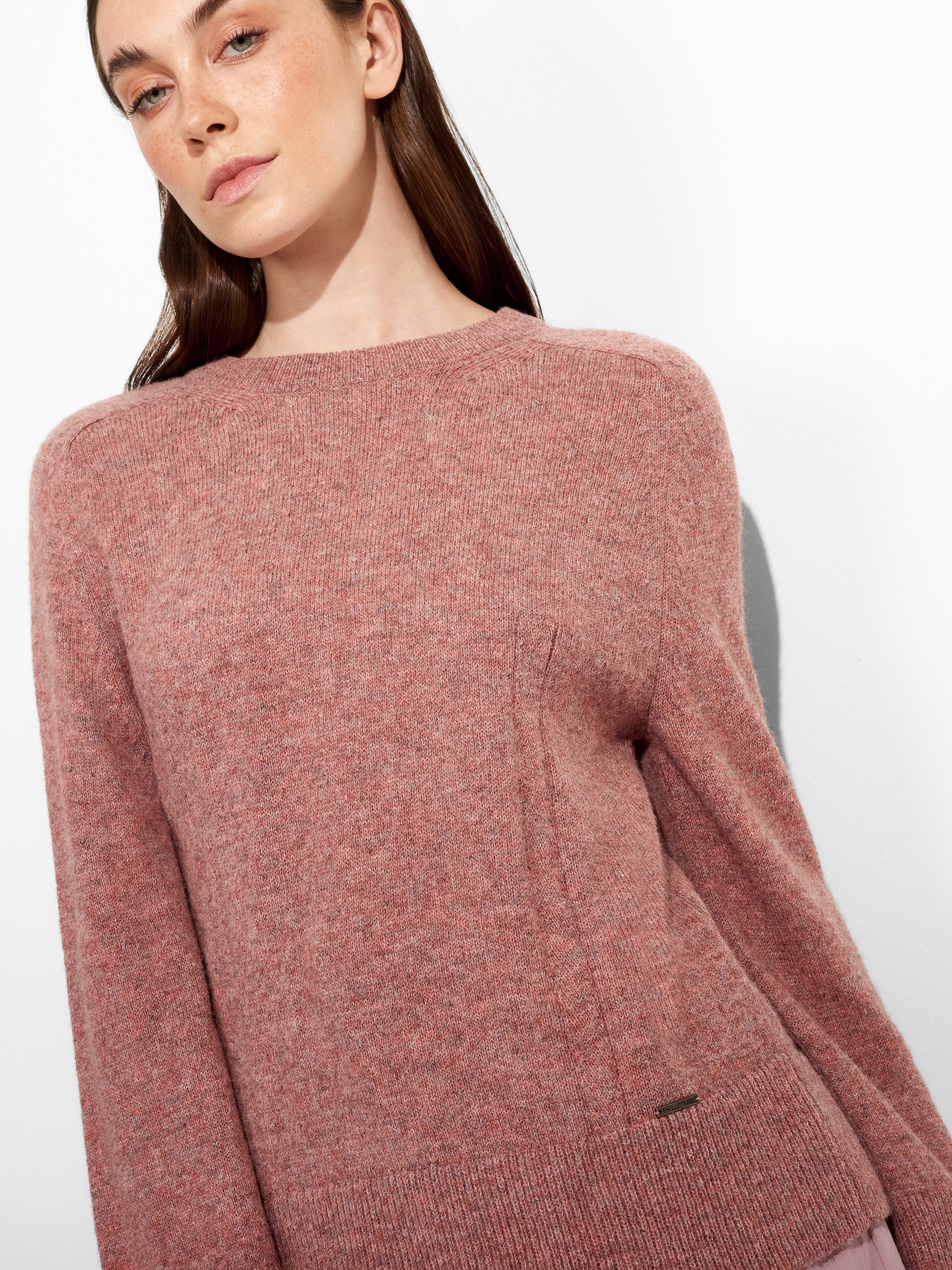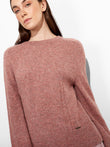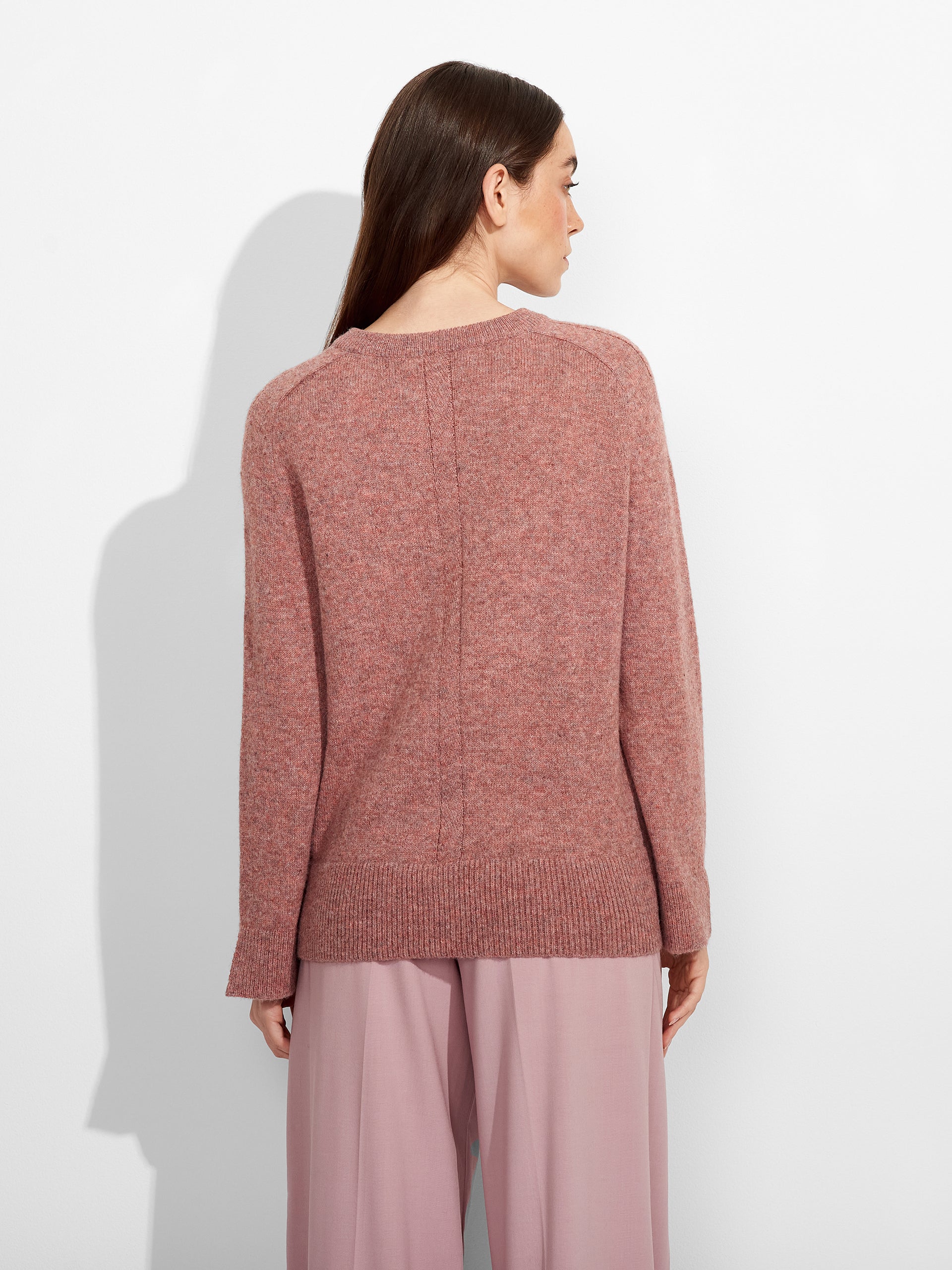 Suéter Zia en tonalidad rosado, diseñado en color entero con cuello redondo y mangas largas. Presenta ribetes en el cuello, puños y bajo. Confeccionado en baby alpaca, brinda calidez y suavidad | Material predominante: Baby Alpaca