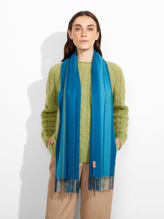 Chalina Perejil en tonalidad turquesa, con rayas verticales anchas. Los bordes con flecos gruesos ofrecen...