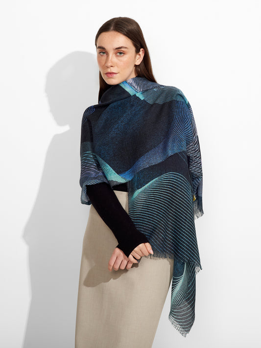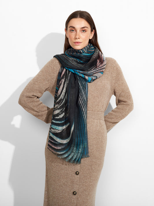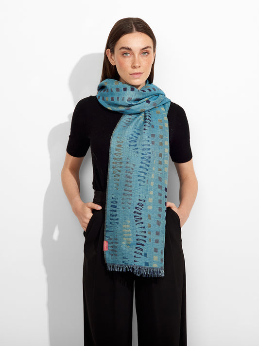 Estola Zane en tonalidad azul, presenta tejido jaquard con un diseño de líneas irregulares y...