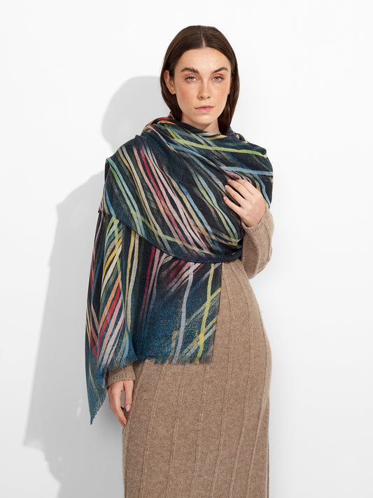 Estola Zulett en multicolor, presenta tejido jacquard con un diseño de líneas irregulares y bordes...