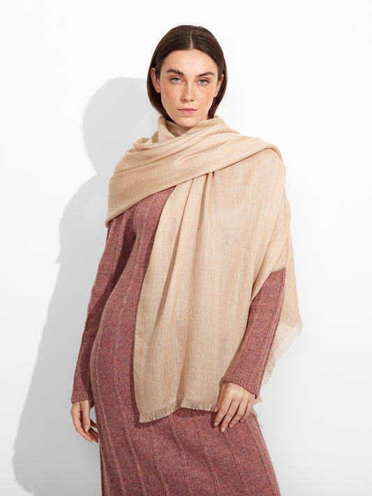 Estola Teaberry B en tonalidad beige, de color entero, presenta bordes con flecos finos que...