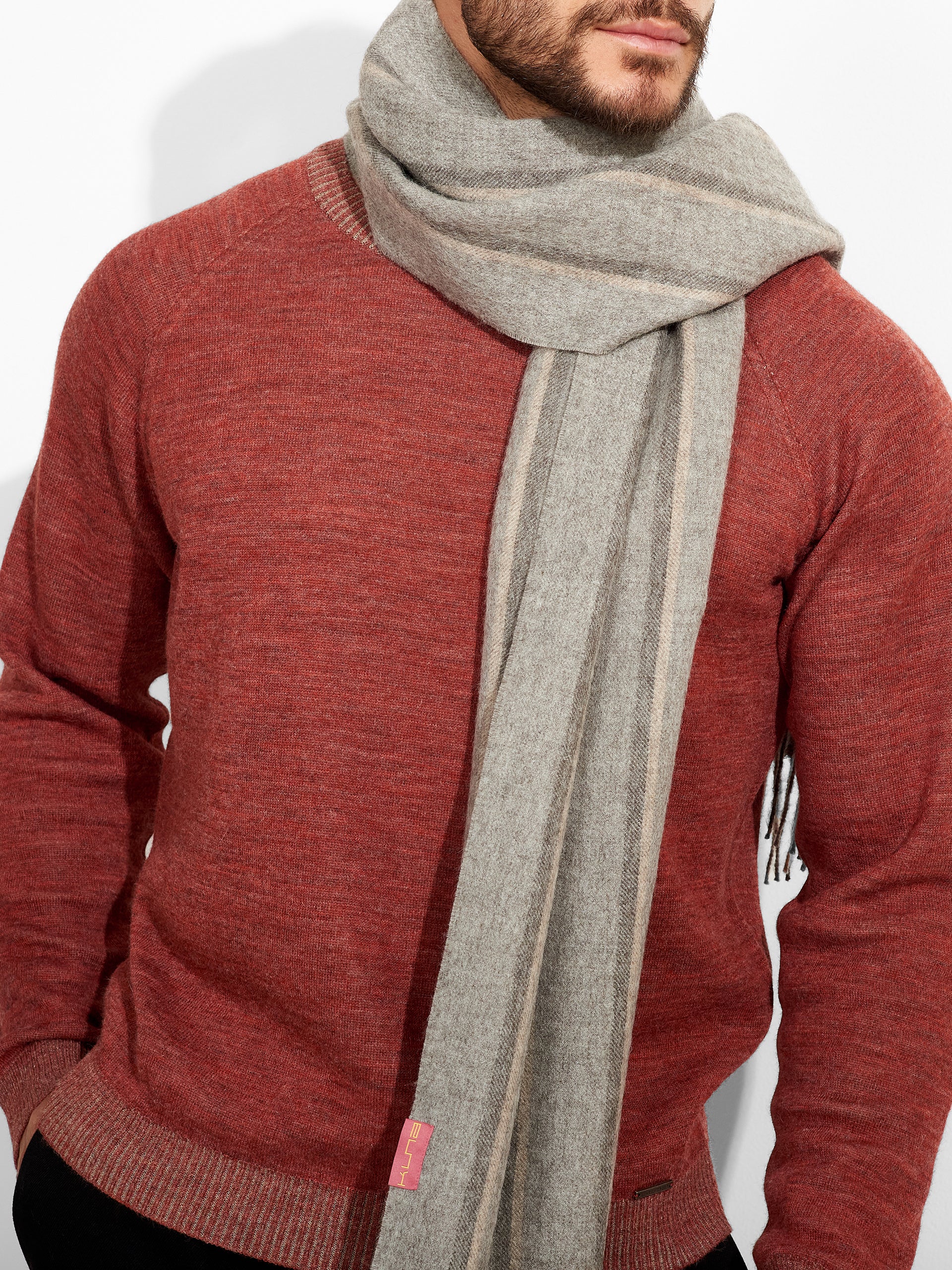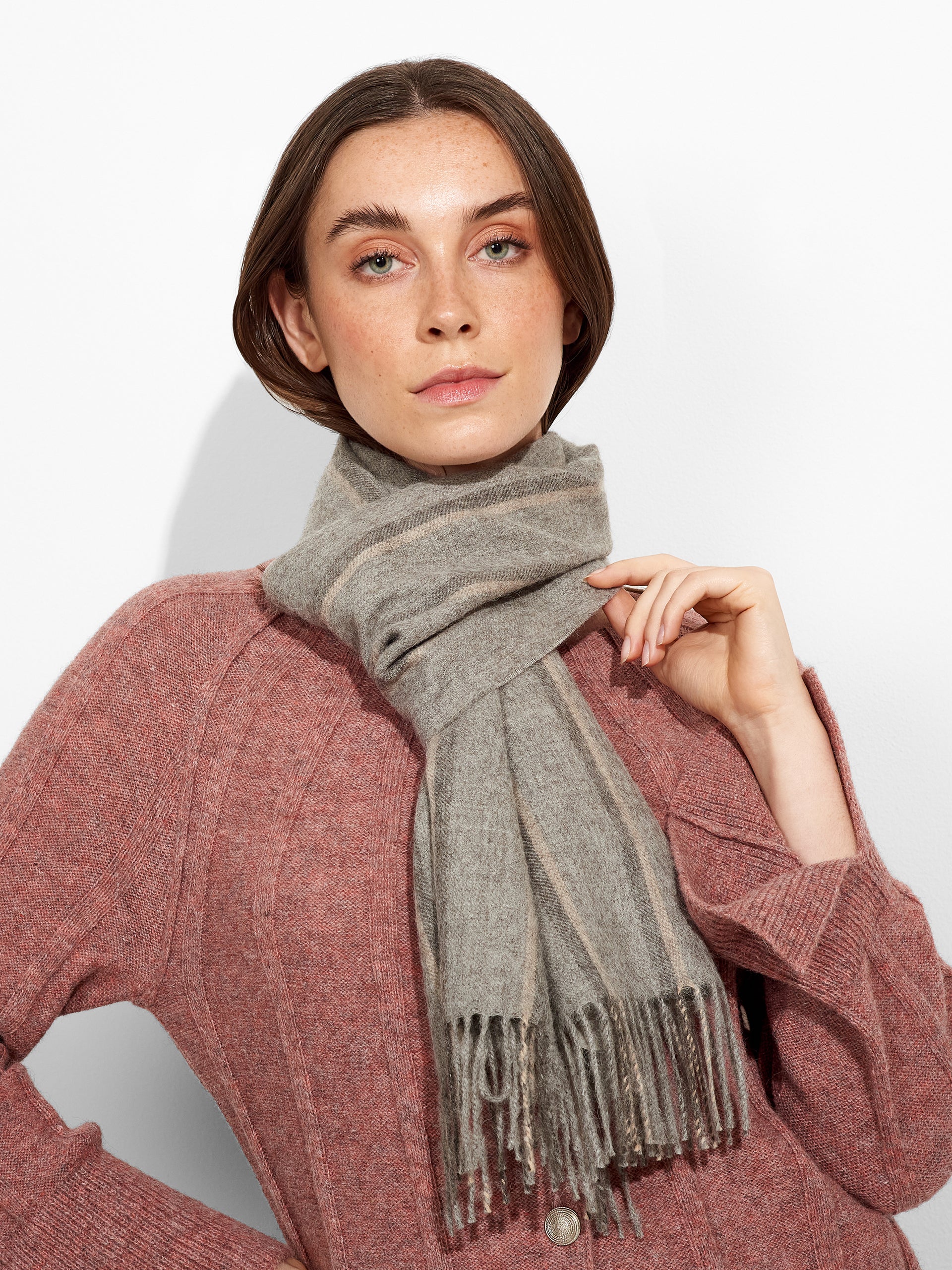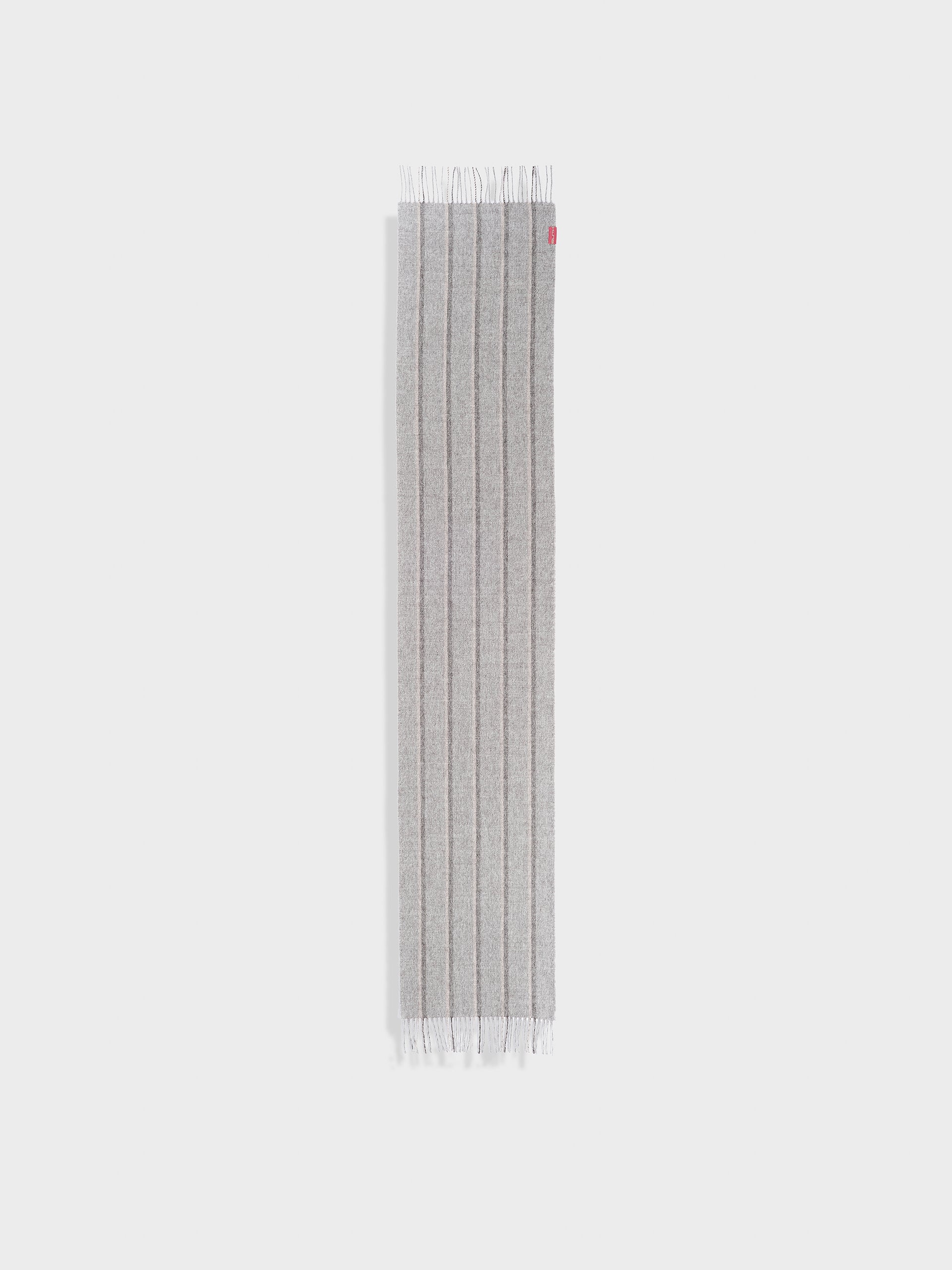 Chalina Jean en tonalidad gris, con diseño de rayas verticales finas que aportan un toque sutil de elegancia. Los bordes con flecos finos complementan su estilo. Confeccionada en baby alpaca eco, brinda calidez y suavidad. | Material predominante: Baby Alpaca