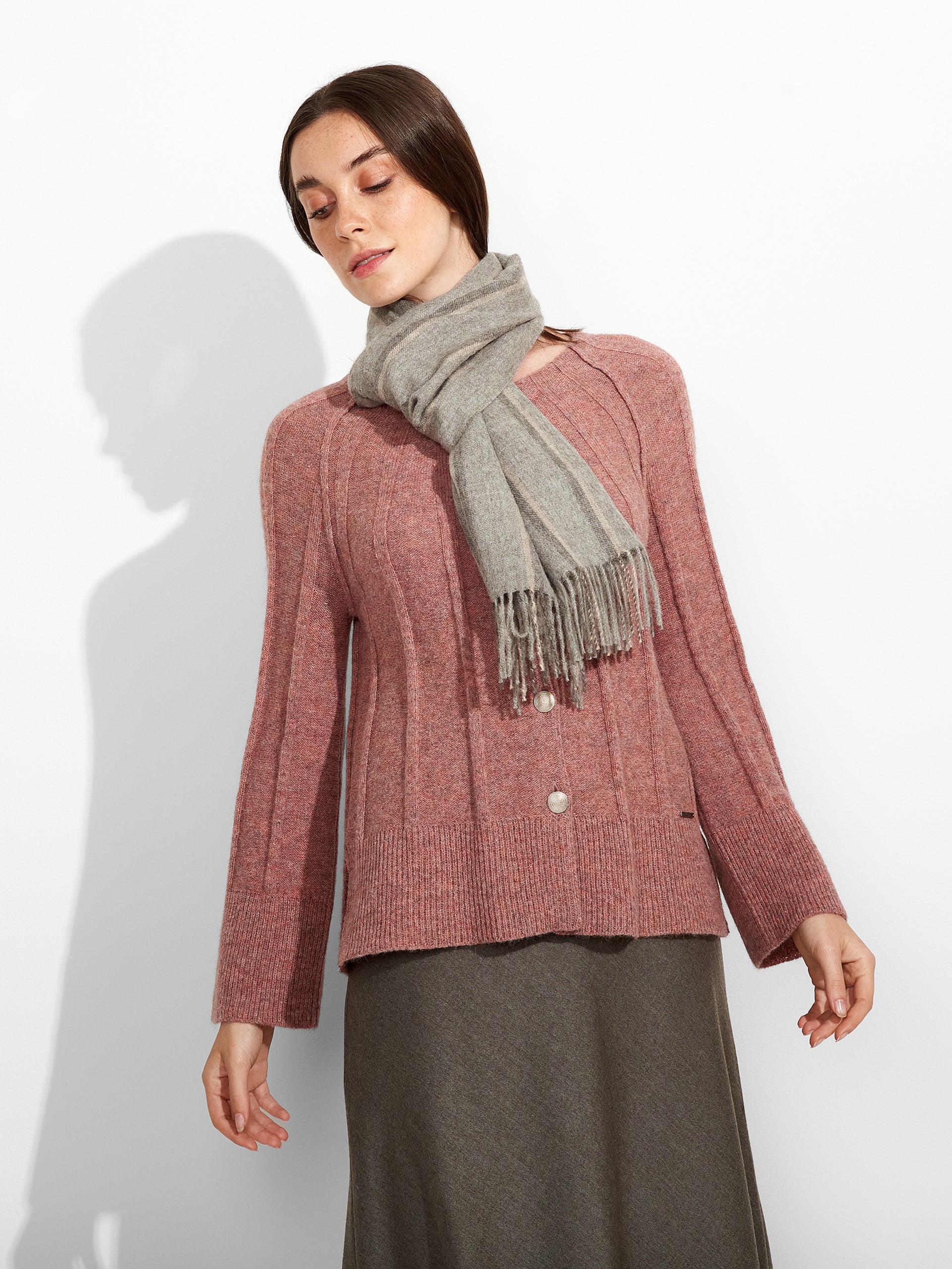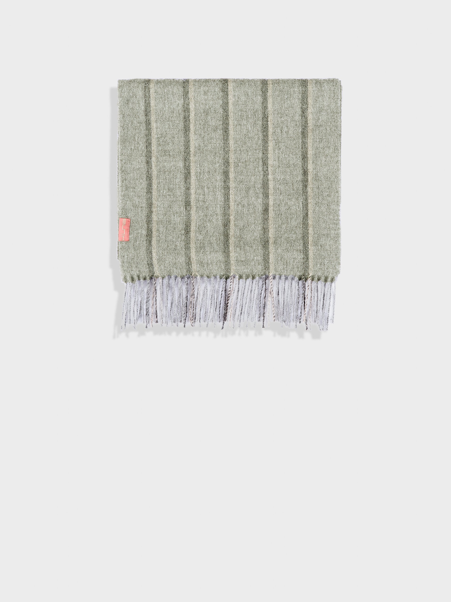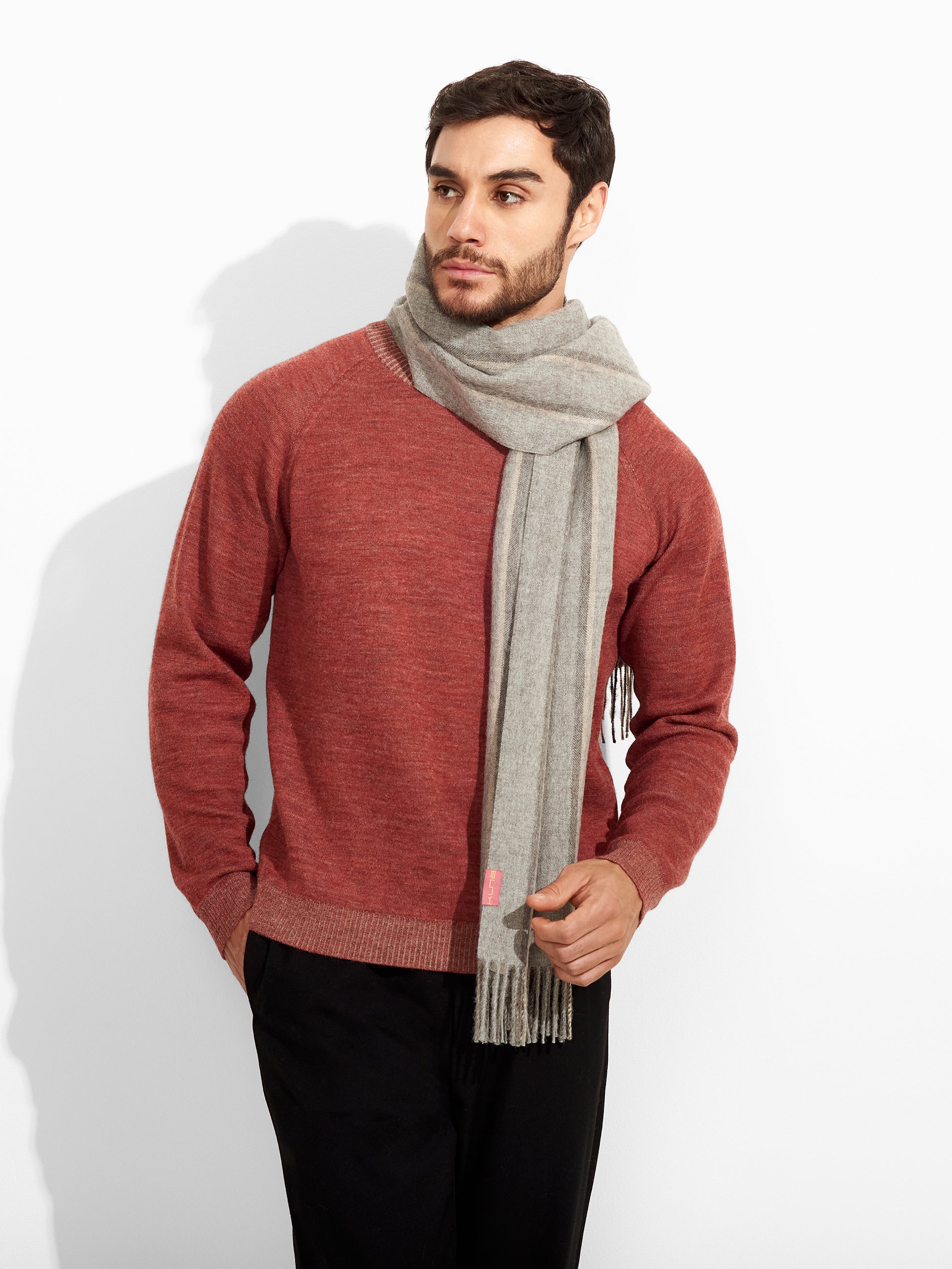 Chalina Jean en tonalidad gris, con diseño de rayas verticales finas que aportan un toque sutil de elegancia. Los bordes con flecos finos complementan su estilo. Confeccionada en baby alpaca eco, brinda calidez y suavidad. | Material predominante: Baby Alpaca